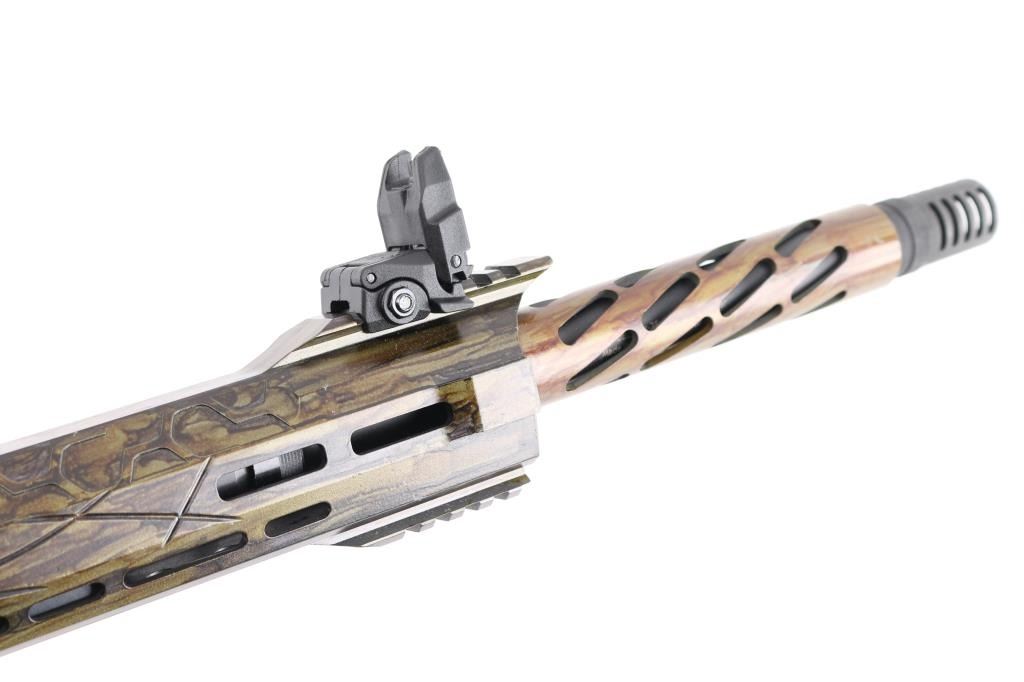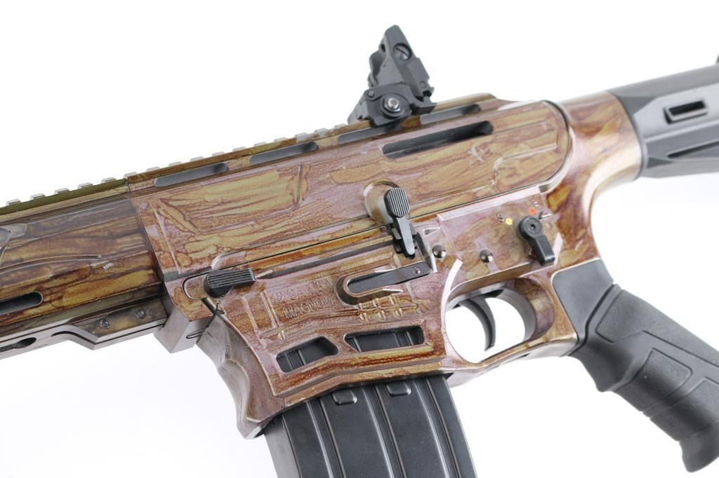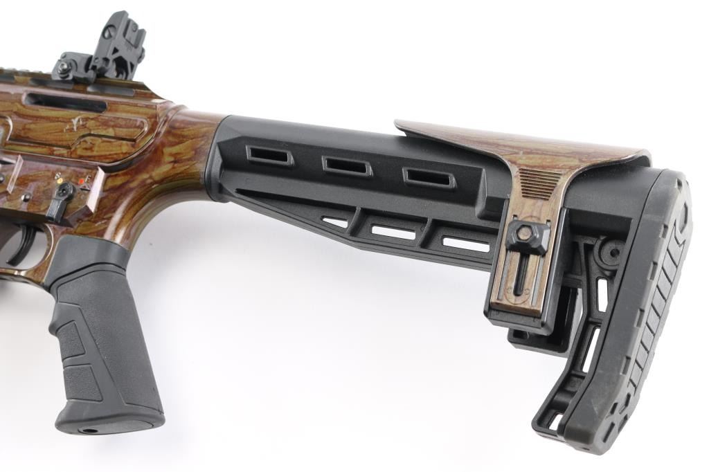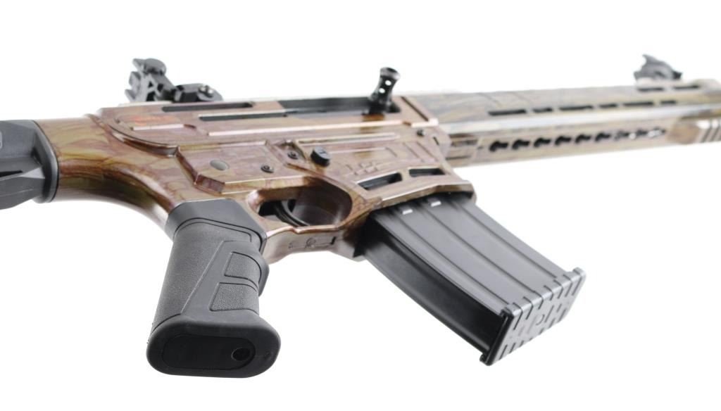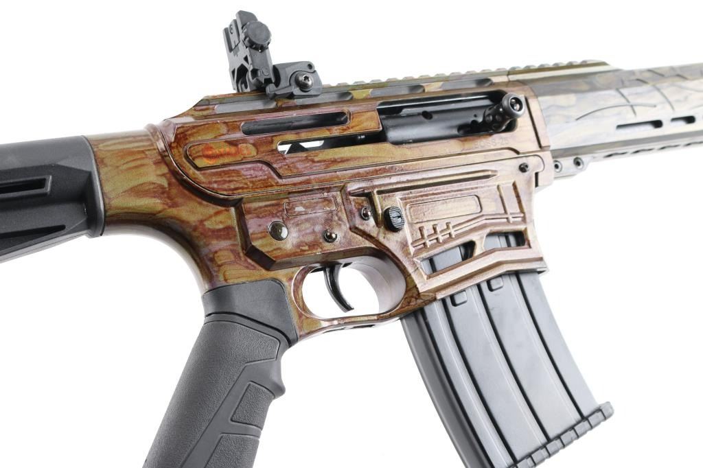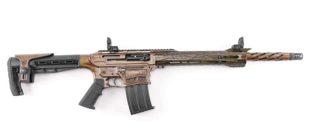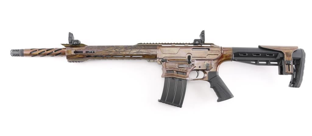 S/N: 21-16280. Made in Turkey for Legacy Sports Reno, NV. This gas operated, magazine fed, semi-automatic 12 Gauge shotgun is chambered for 3" shells. Features an 18.5" barrel and modified choke with 2" muzzle, custom brown and green marbled finish on receiver, forearm, barrel shroud and adjustable cheek riser. Black polymer shoulder stock w/ rubber buttpad and rubber pistol grip. Full Picatinny rail on top receiver, 3" Pic rails on front and back top of forearm and 2.5" Pic rail on bottom front. Magpul polymer flip-up adjustable front and rear sights, oversized metal charging handle, push button magazine release and smooth curved trigger. LOP is 14". Comes with one metal 5 rd magazine. Bore is shiny with some dirt.