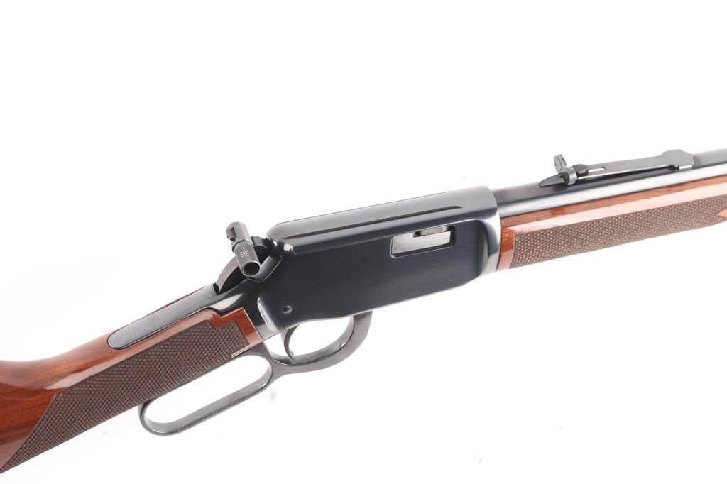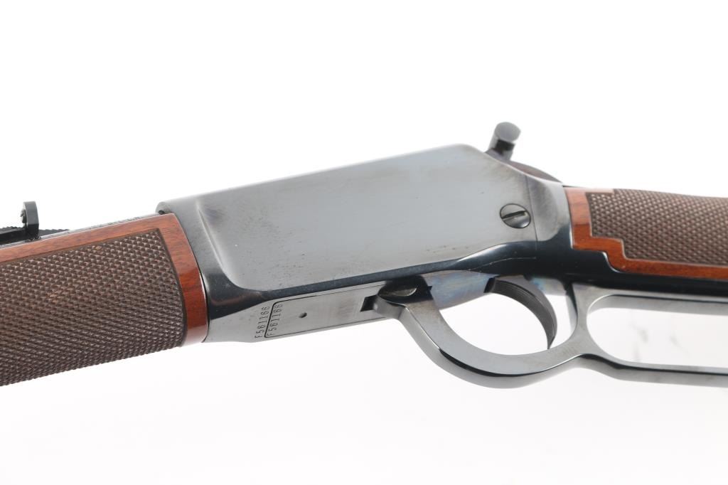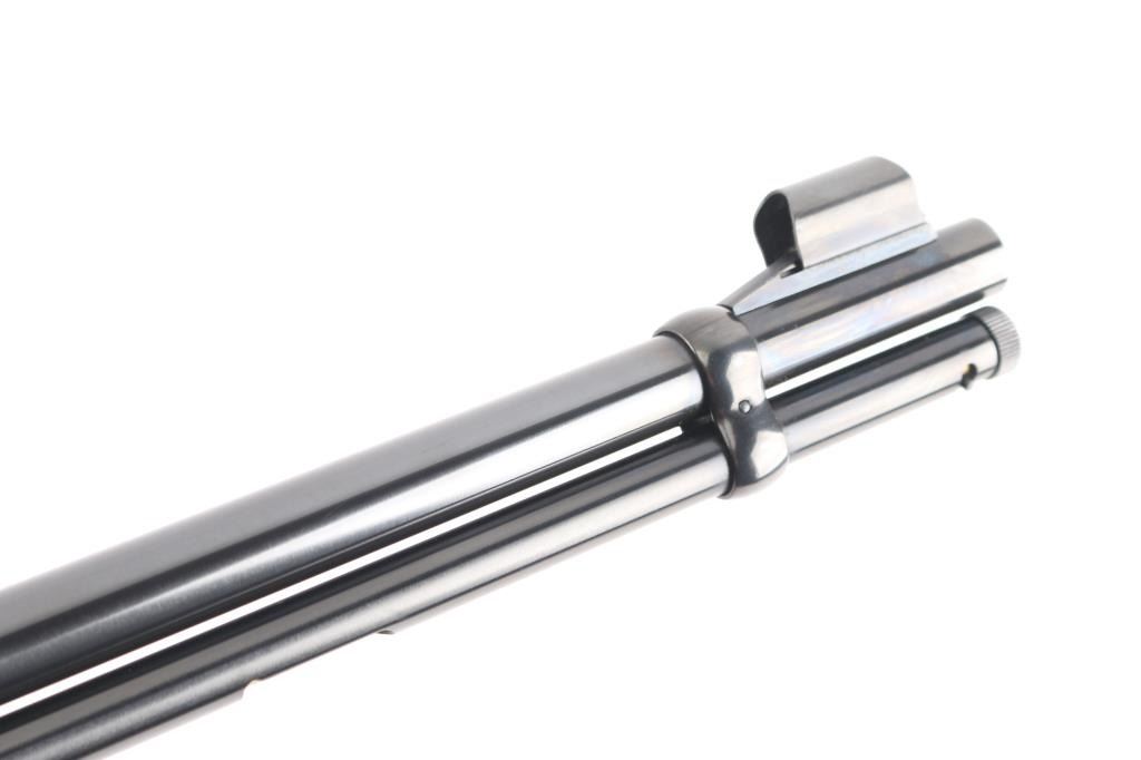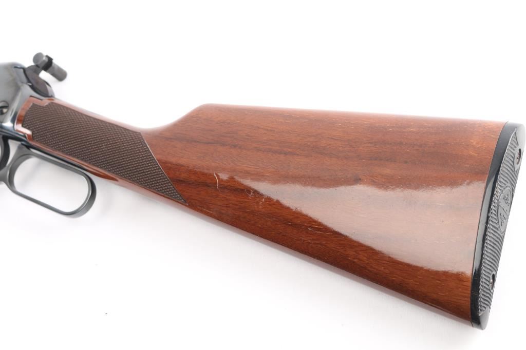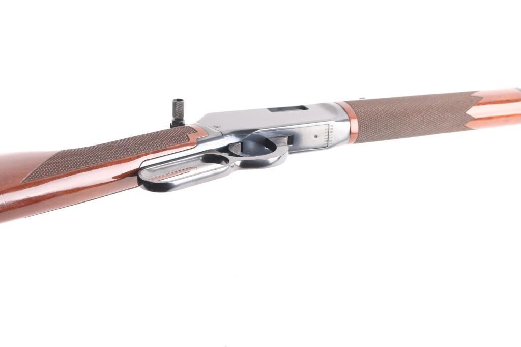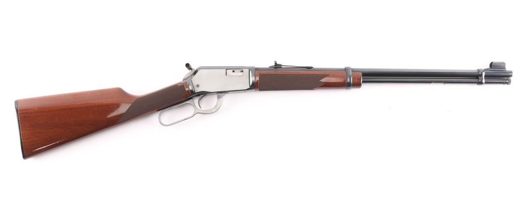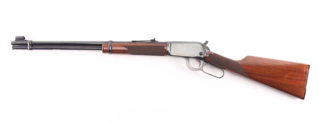 Desirable lever action rimfire rifle manufactured in New Haven, CT. features blued finish, checkered walnut forend & stock, factory buttplate, 20" barrel, full length magazine tube under barrel, adjustable buckhorn sights with blade front & protective hood, offset hammer extension. Bore is very good bright condition. Retains 95% finish with few signs of handling. Wood is very good with few dings.