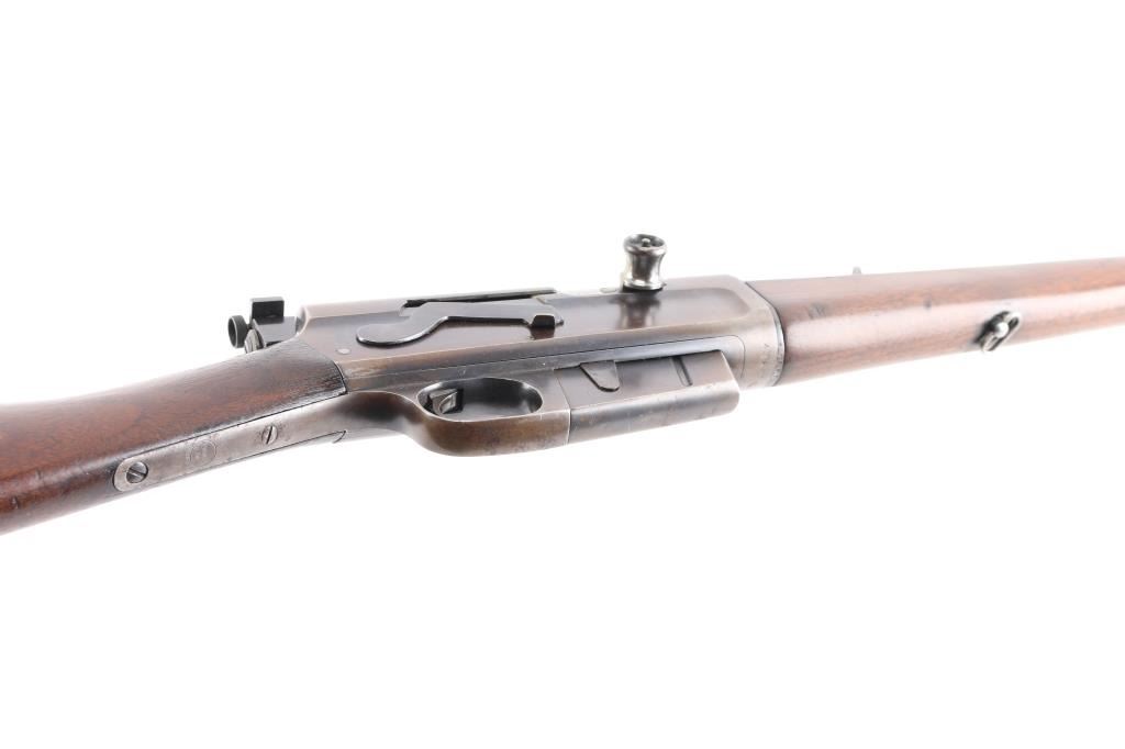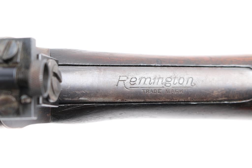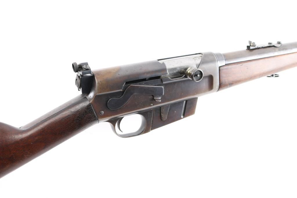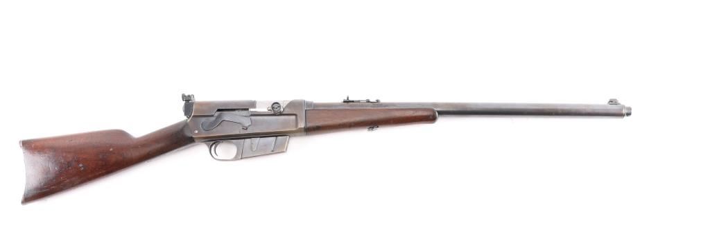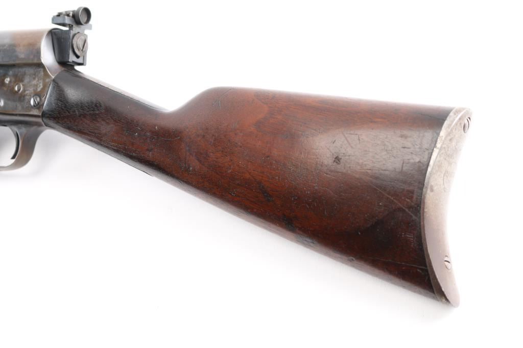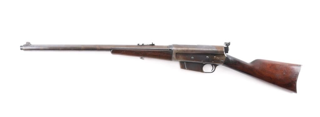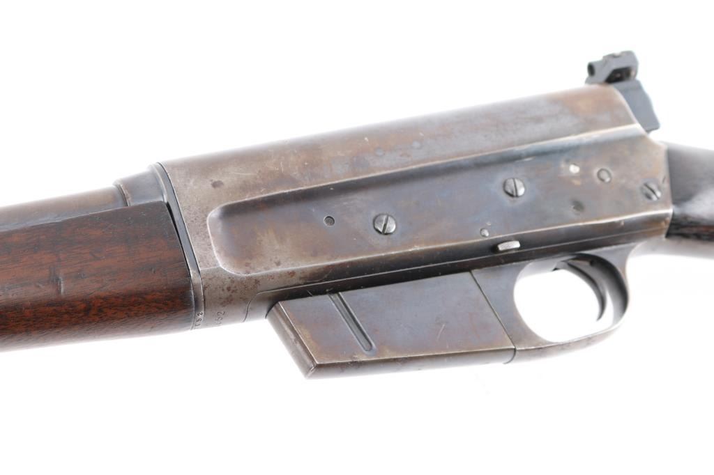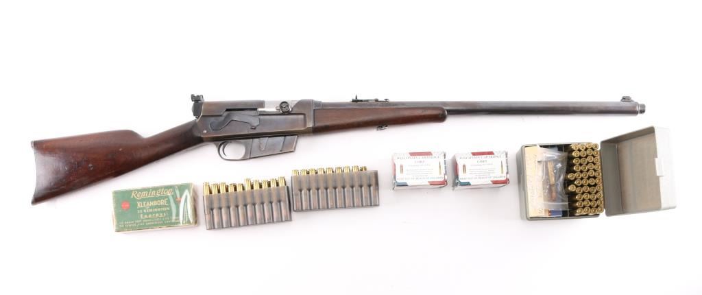 Remington Model 8 semi-automatic rifle in the very Rare & collectible 25 Remington caliber. Manufactured 1919. Features blued finish, wood frend, straight grip butt stock, crescent steel butt plate, 22' barrel, original front sight & buckhorn rear sight on barrel jacket. Redfield adjustable peep sight attached to the rear of the receiver, fixed magazine, manual safety. This rifle is a take-down model for both storage & transportation. Bore is good with strong/vivid rifling, lands& grooves. Wood is good/sound with minor scratches/dings, action is smooth, blue is about 40%, with the rest turning a brown patina. There is a rough area on the rear of the left patina, looks like someone buffed out an area of pitting. Included is 140 rounds of 117 grain 25 Rem. cartridges, 20 rounds of original Remington Kleanbore 25 Rem. Express 117 grain soft point core lokt center fire smokeless cartridges in vintage red & green Remington box. 40 Wisconsin Cartridge Corp. factory loaded rounds of 117 grain of 25 Rem., 80 reloaded 25 rem. 117 grain rounds in formed brass cases plus a very rare .25 remington stripper clip loader for this rifle.
