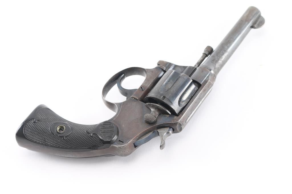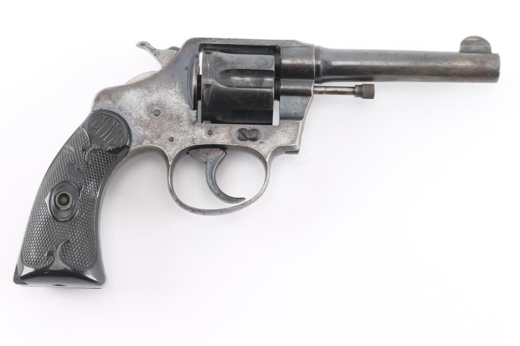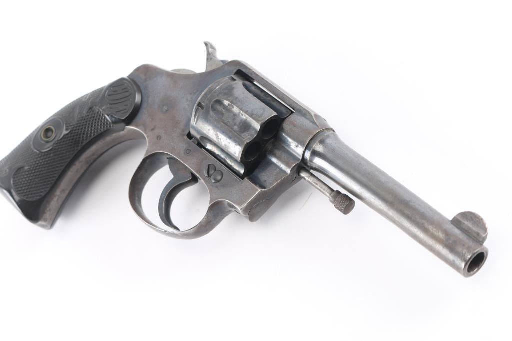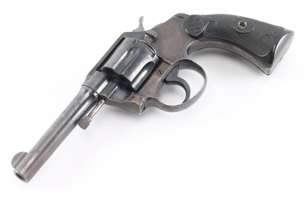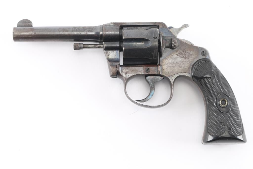 Vintage double action revolver manufactured circa 1910, chambered for 38 Smith & Wesson (not Special). Features blued finish, 4" barrel with fixed sights, 6 shot fluted cylinder, checkered black hard rubber COLT logo grips. Bore shows wear. Retains 50% plus original blue, with normal aging, drifting to brown patina with minor erosion, light pinprick pitting. Large chip to heel of right grip panel, with other minor losses at edges. Good markings. Action is tight.