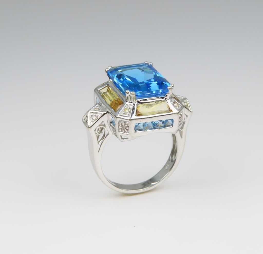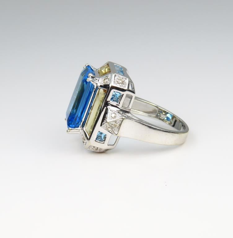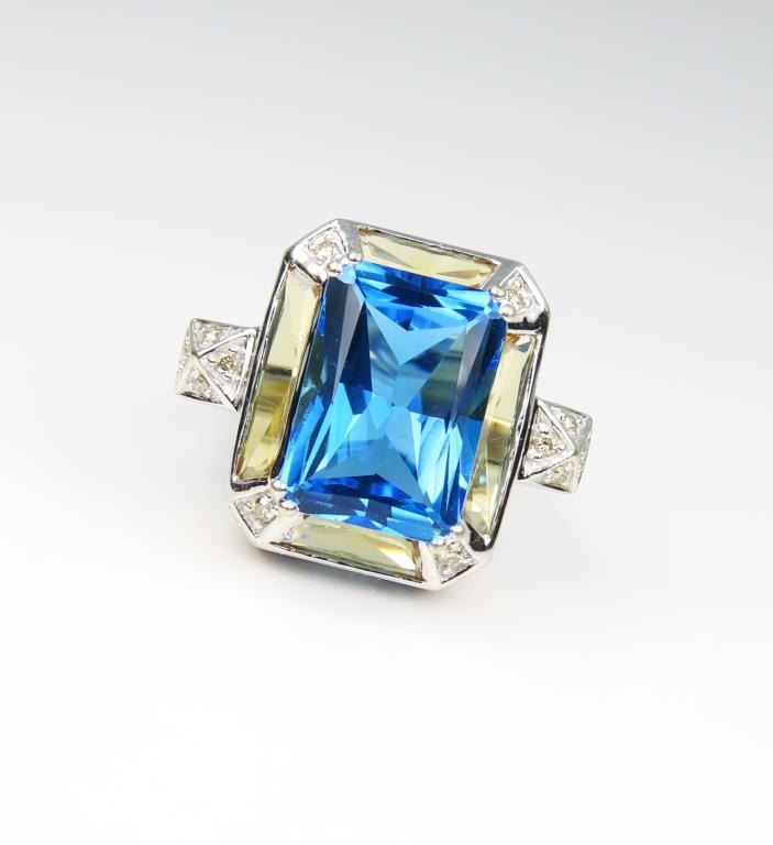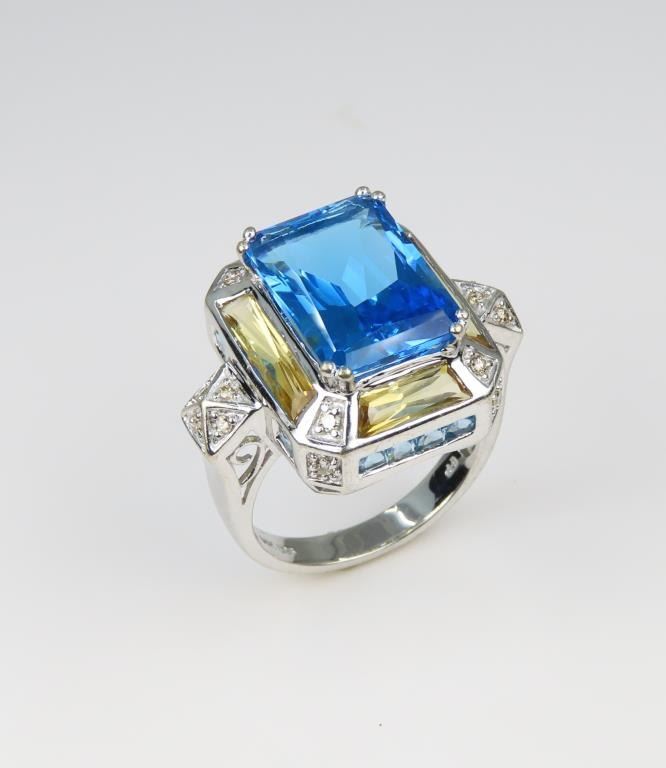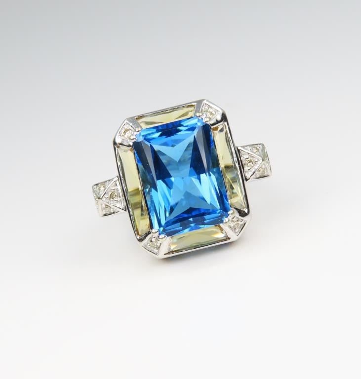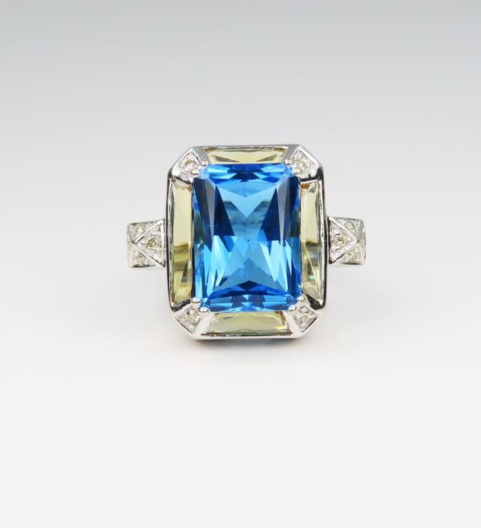 and Diamond Ring featuring a brilliant Blue Topaz weighing approx. 15.00 carats accented with intricately set Citrine and Blue Topaz inlay with pave set Diamonds set in glamorous 14 karat white gold custom crafted setting, Size 7. Retail $3,000-$4,000