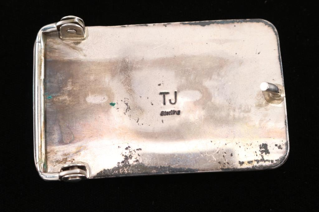Inlaid with turquoise, jet, and mother of pearl set in sterling, maker marked TJ, measures 3.5"x2.5"