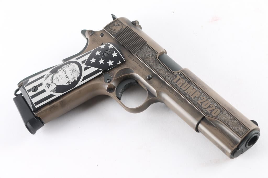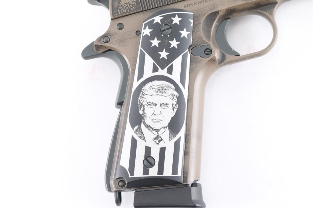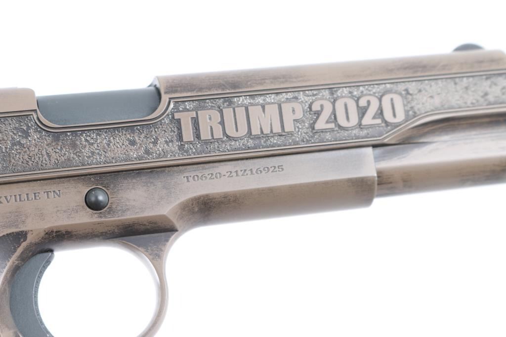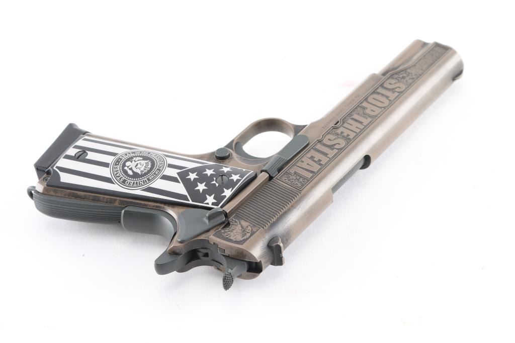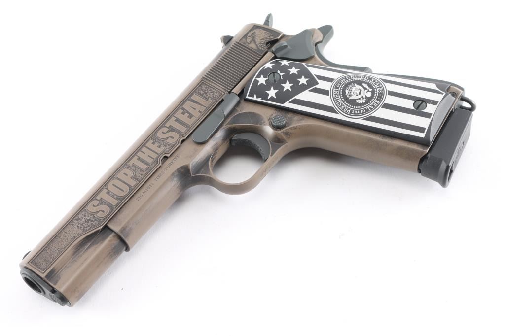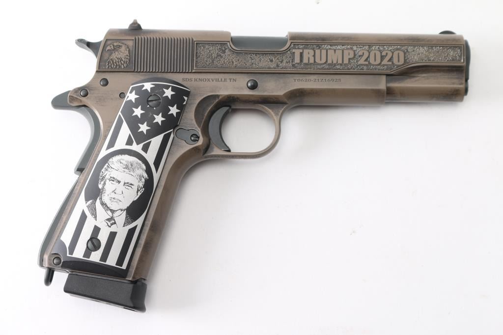 SN: T0620-21Z16925 Highly decorative yet functional 1911A1 style pistol in 45 Auto. "Trump 2020" and "Stop the Steal" are relief engraved on sides of slide, along with American Bald Eagle head images and other fine details. Grips feature a black & white American Flag motif with the Seal of the President of the United States on left, likeness of Donald Trump on right. Pistol itself is a standard Government Model type with aged bronze or similar color finish, 5" barrel, frame scallops, wide hammer, serrated arched mainspring housing with lanyard loop, grip & thumb safeties. Condition is like new, with handing marks. Comes in a standard looking cardboard factory box, with manual, bushing wrench, one magazine.