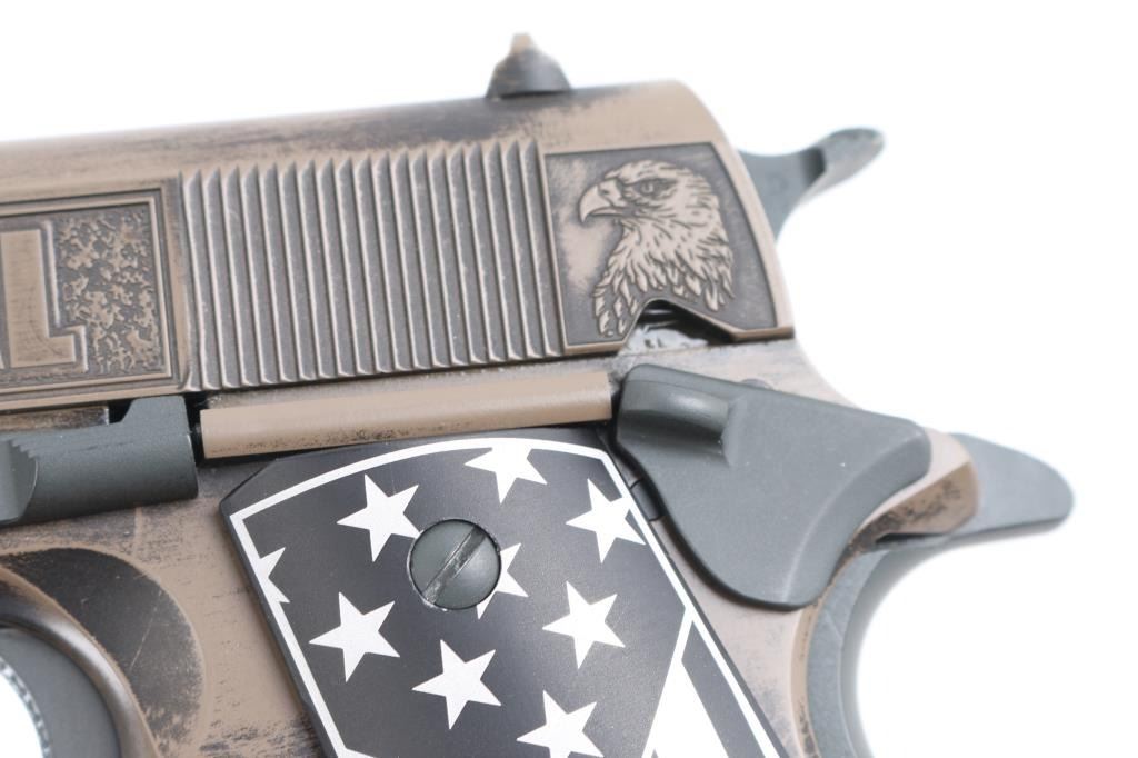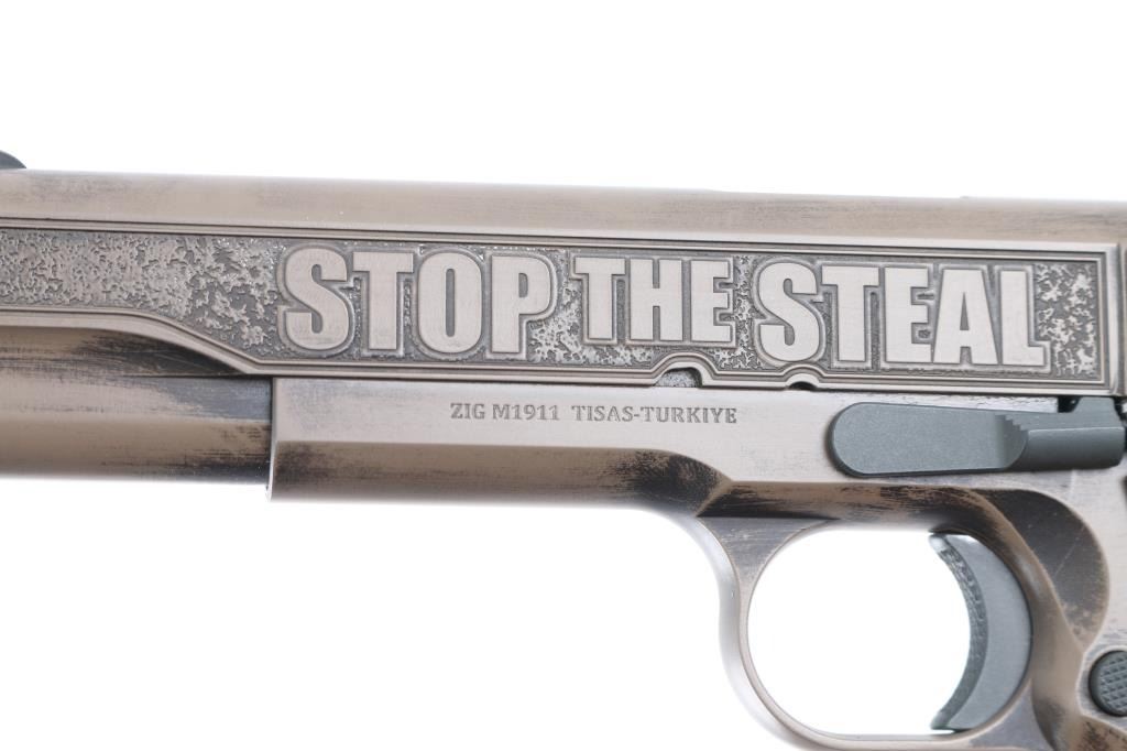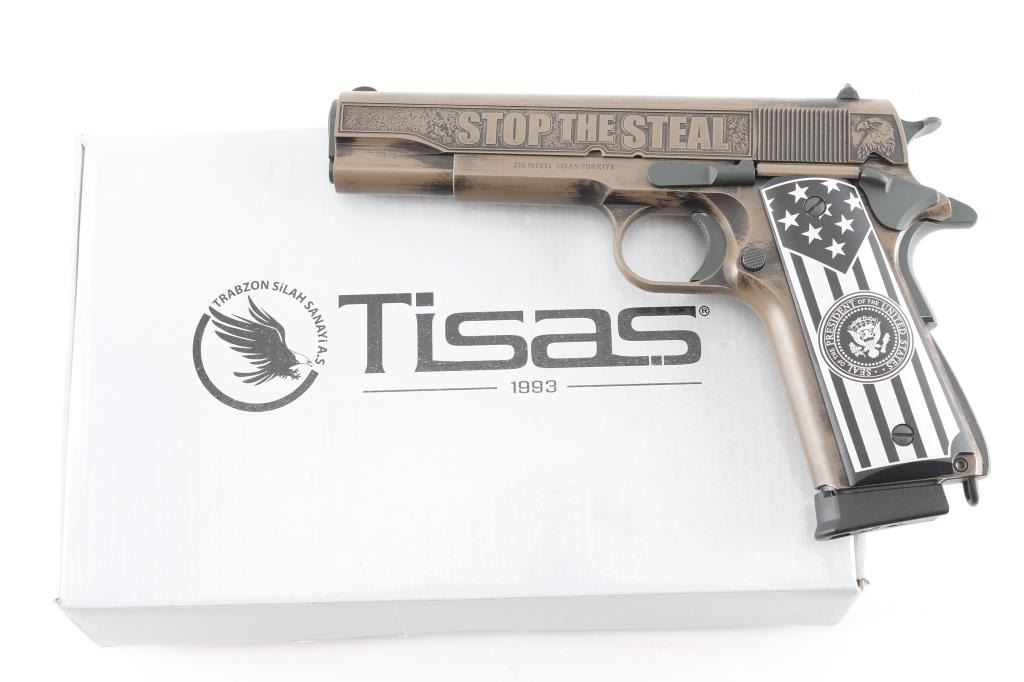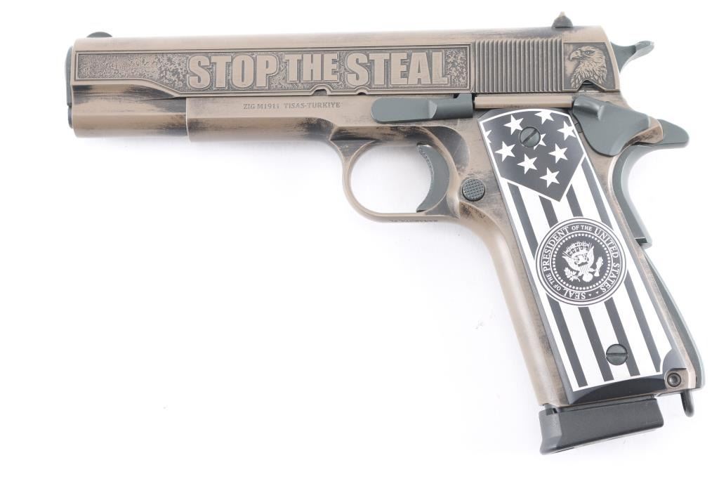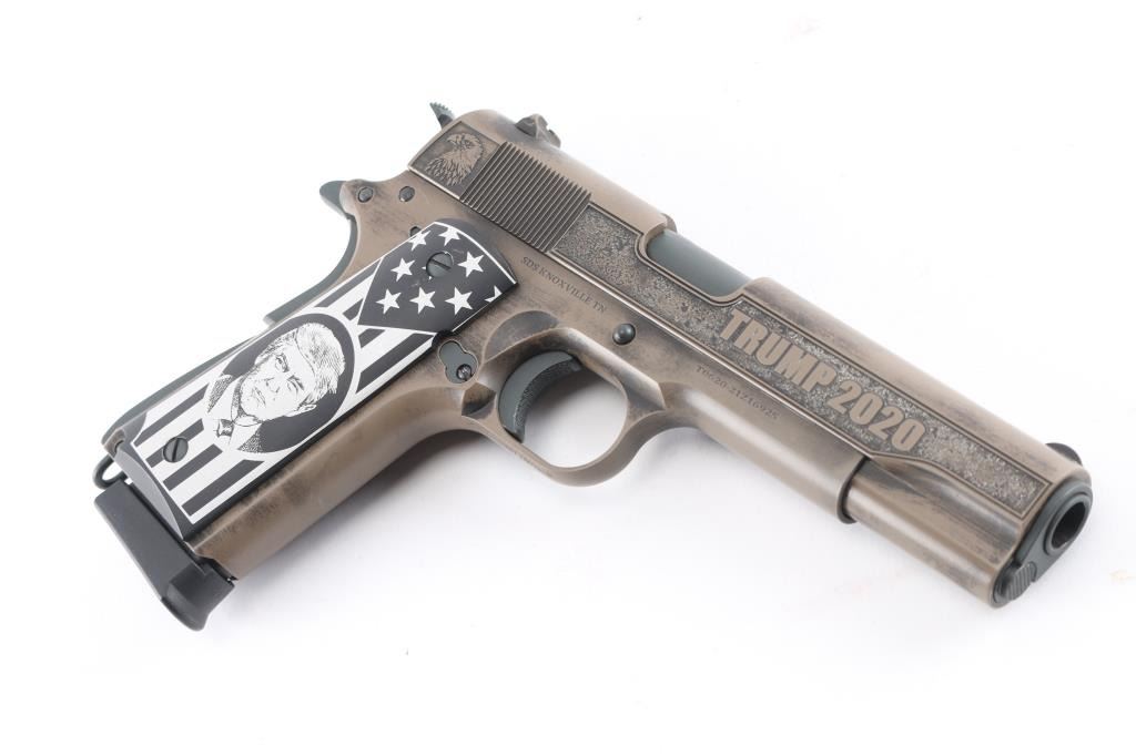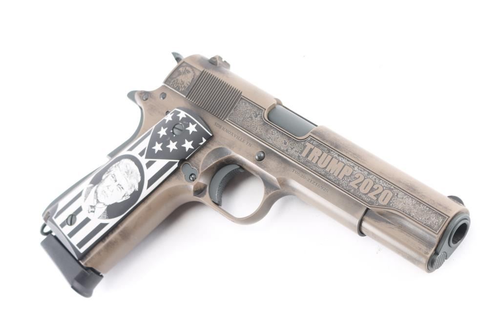 SN: T0620-21Z16925 Highly decorative yet functional 1911A1 style pistol in 45 Auto. "Trump 2020" and "Stop the Steal" are relief engraved on sides of slide, along with American Bald Eagle head images and other fine details. Grips feature a black & white American Flag motif with the Seal of the President of the United States on left, likeness of Donald Trump on right. Pistol itself is a standard Government Model type with aged bronze or similar color finish, 5" barrel, frame scallops, wide hammer, serrated arched mainspring housing with lanyard loop, grip & thumb safeties. Condition is like new, with handing marks. Comes in a standard looking cardboard factory box, with manual, bushing wrench, one magazine.