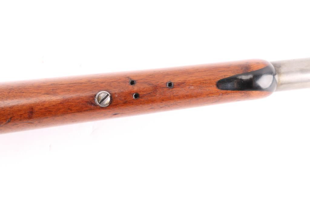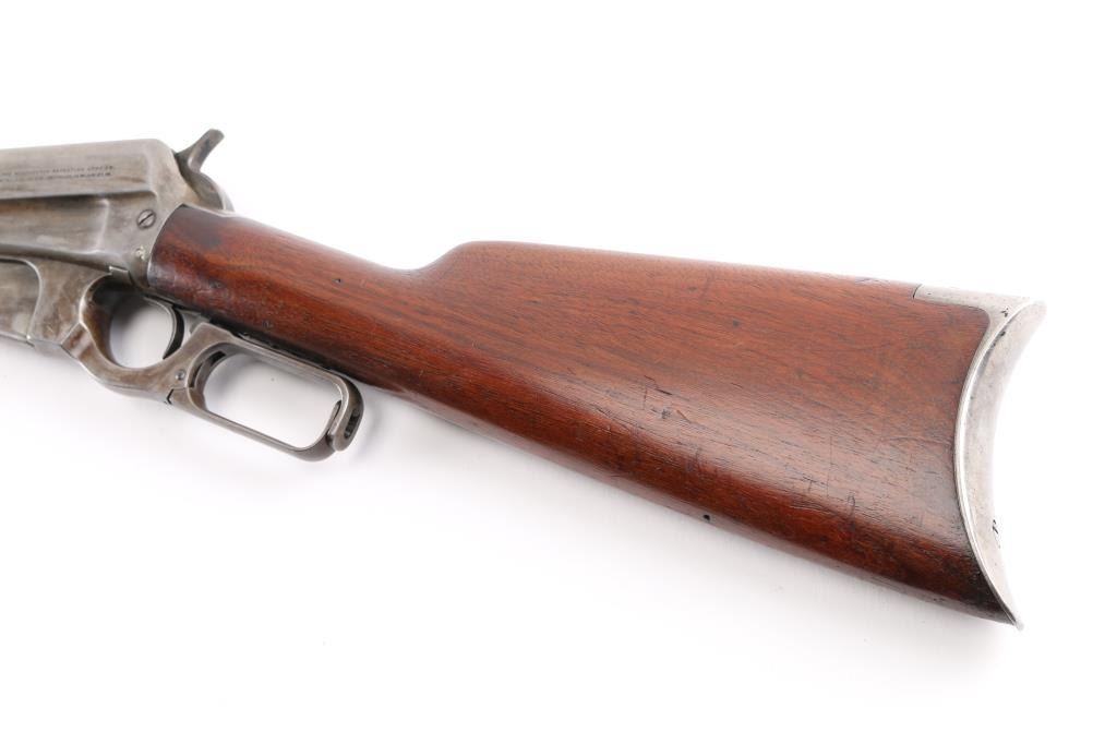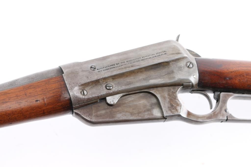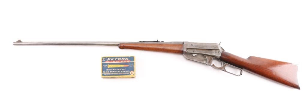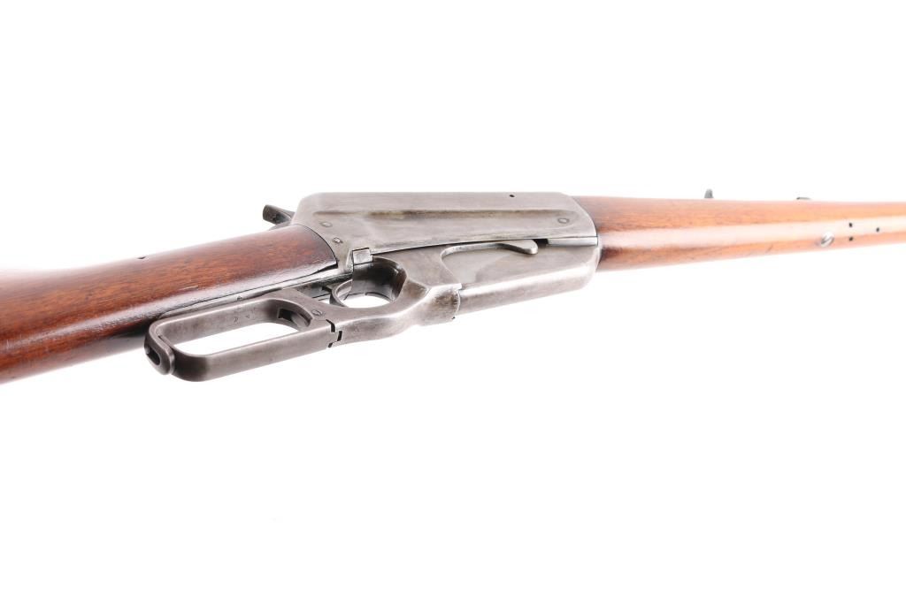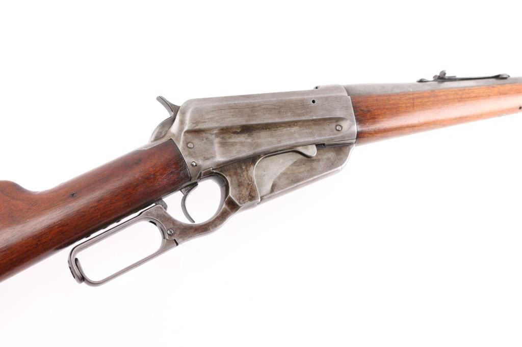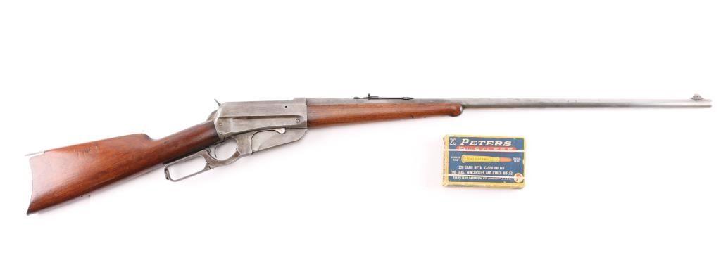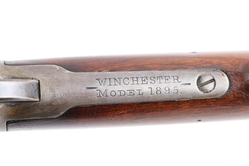 Winchester Model 1895 lever-action rifle chambered in .30 US (30-40 Krag). Manufactured in 1904 and was the first Winchester rifle to feature as box magazine allowing the rifle to chamber both military and hunting cartridges. The 1895 was the last of lever-action rifles designed by John Browning, features a rear locking bolt and is considered the strongest lever-action rifle that Winchester ever produced. The Winchester 1895 was the choice of the Arizona rangers as noted in all their historical articles. This rifle has the rare 28" light tapered barrel, factory sights with a crescent steel butt plate, 5 round fixed box magazine. The bore is a little dark with strong riflingThe wood is very goodwith just a few light pressure marks, no cracks or chips, the forend is accented with an ebony insert, the lever-action is strong and the lock-up is tight. This rifle is an Arizona gun purchased in Bisbee, Arizona decades ago by an Arizona gun collector. the metal finish is in the white, mixed with areas of brown patina. Included is an original box of 20 Peters rustless center fire 30-40 & Winchester smokeless 220 grain metal cased bullets in pristine condition.