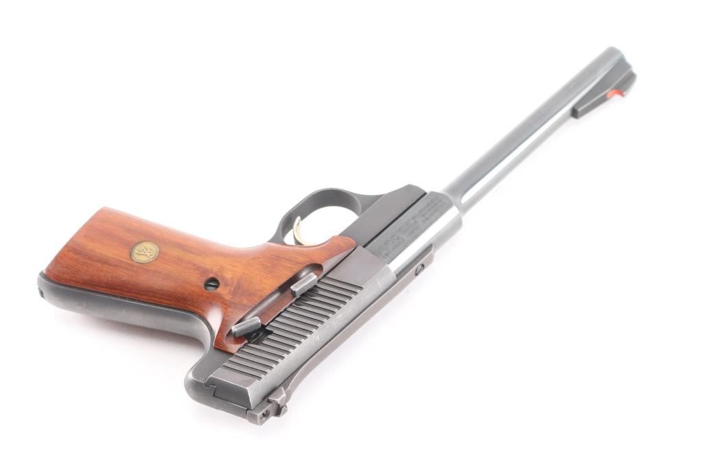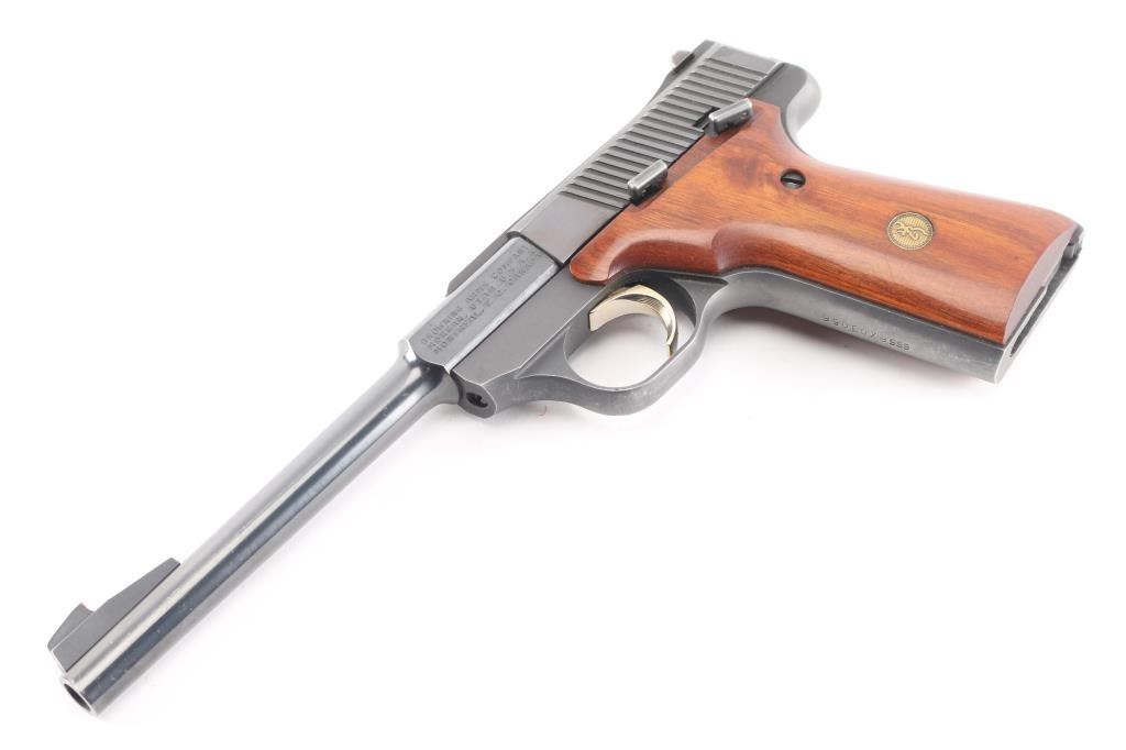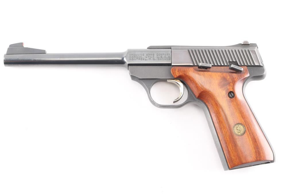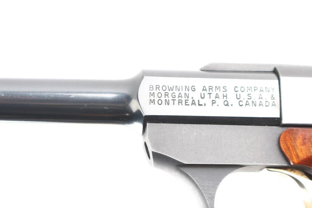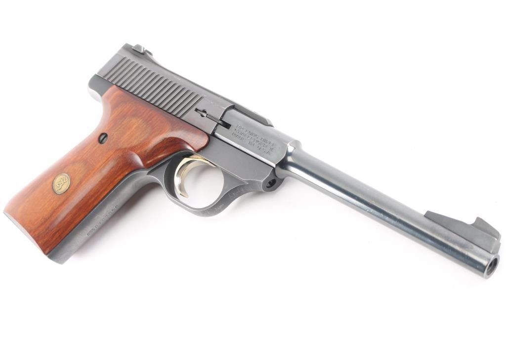 Semiautomatic rimfire pistol made in the US circa 1983. Features matte blued finish with bright blued sides of slide & barrel, 6.75" tapered barrel, manual safety, fixed sights (rear in dovetail), heel style mag release, gold color accent trigger, smooth wood grips with Browning "Buck Mark" medallions. Bore is very good bright condition. Retains 90% finish with edge losses, scuffs. Grips are very good. Includes one magazine.