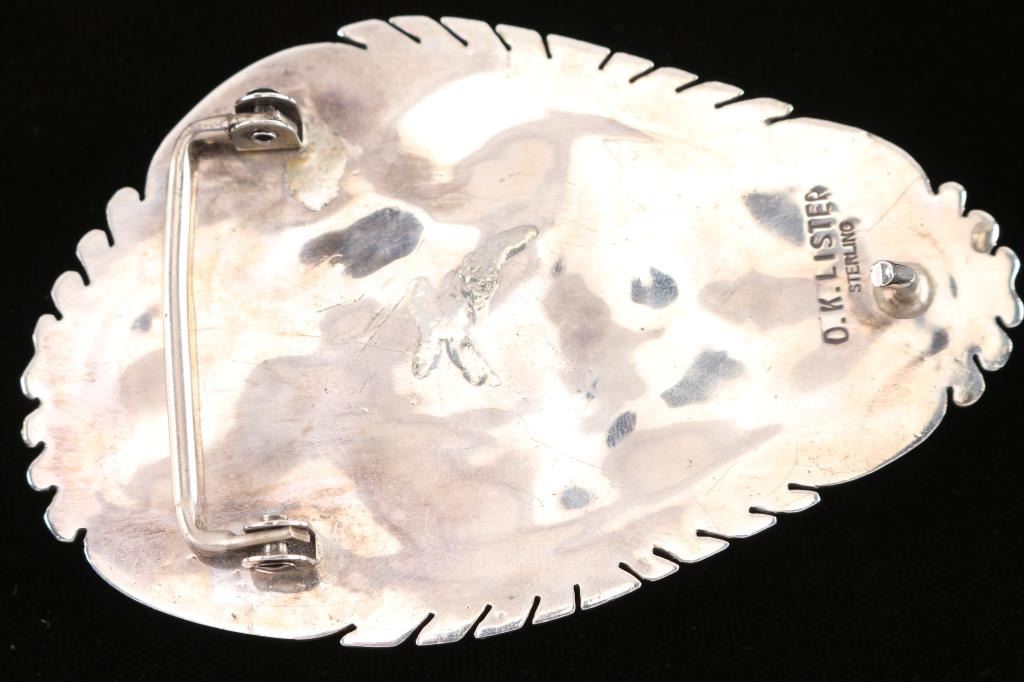 Set in sterling silver, maker marked O.K. Lester, measures 5"x3".