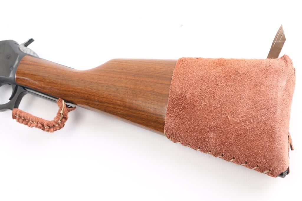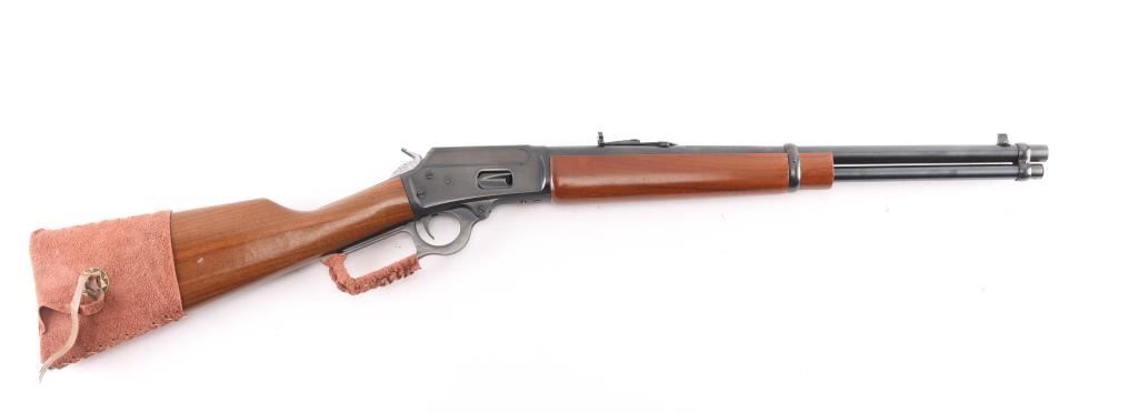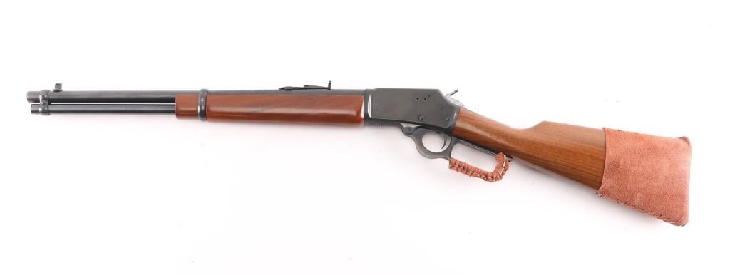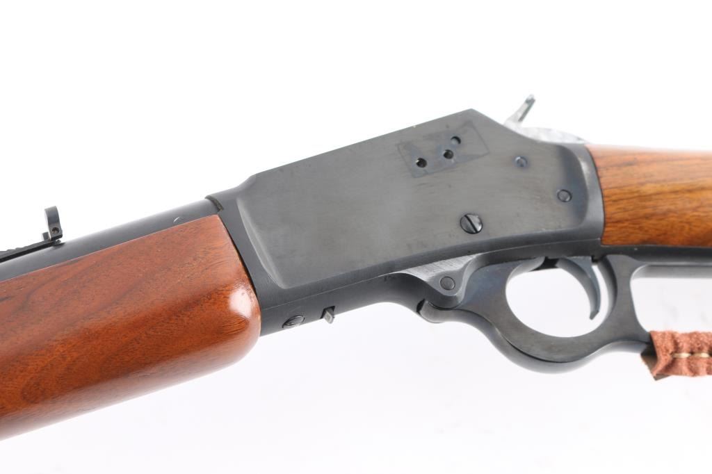 Lever-Action. Carbine configuration. 18" round barrel with post/bead front and u-notch flip rear sporting sights. "JM" stamped on lower barrel. Straight walnut stock/forearm. Jeweled hammer. Receiver drilled/tapped for scope mount. Smooth trigger. Action is crisp/tight. Bore appears excellent needs cleaning. Blued metal finish is about 99% Wood is very good with a few minor scratches. there is two holes drilled on the left side of the receiver where a a sight was installed. Brown leather sleeve with concho attached to buttstock, & lever.