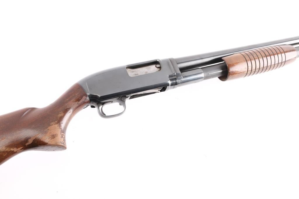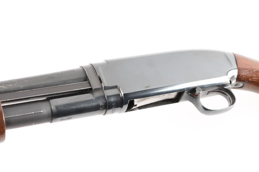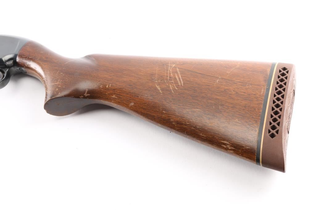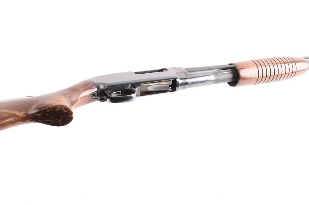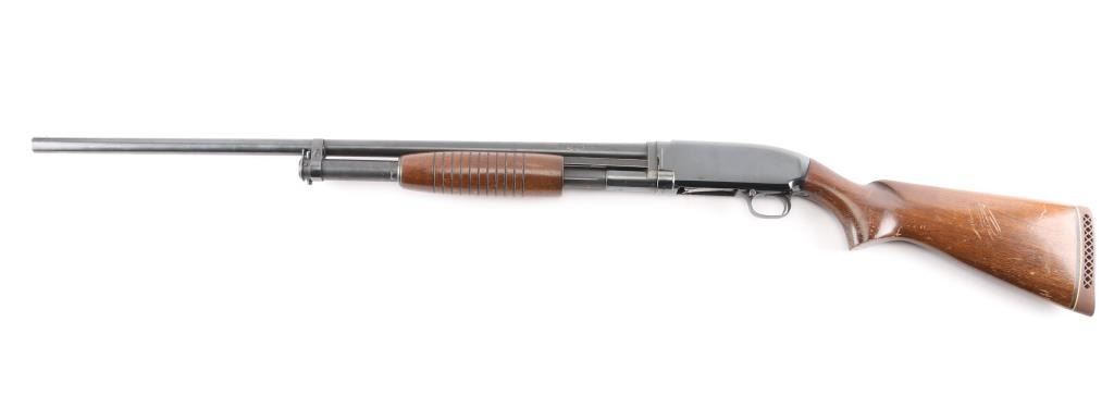 Take down pump action shotgun manufactured circa 1961. Features 28" plain barrel, barrel marked "FULL" choke & "2-3/4", steel bead front sight, blued finish, smooth walnut shoulder stock, grooved walnut pump handle, ventilated rubber recoil pad, manual safety. Bore is very good condition. Retains 85% re-blued finish, with edge losses and small scratches, rub wear from pump handle, small bare metal spots on barrel. Wood is very good condition with scratches & dings, finish losses to butt. Numbers match on receiver & extension.