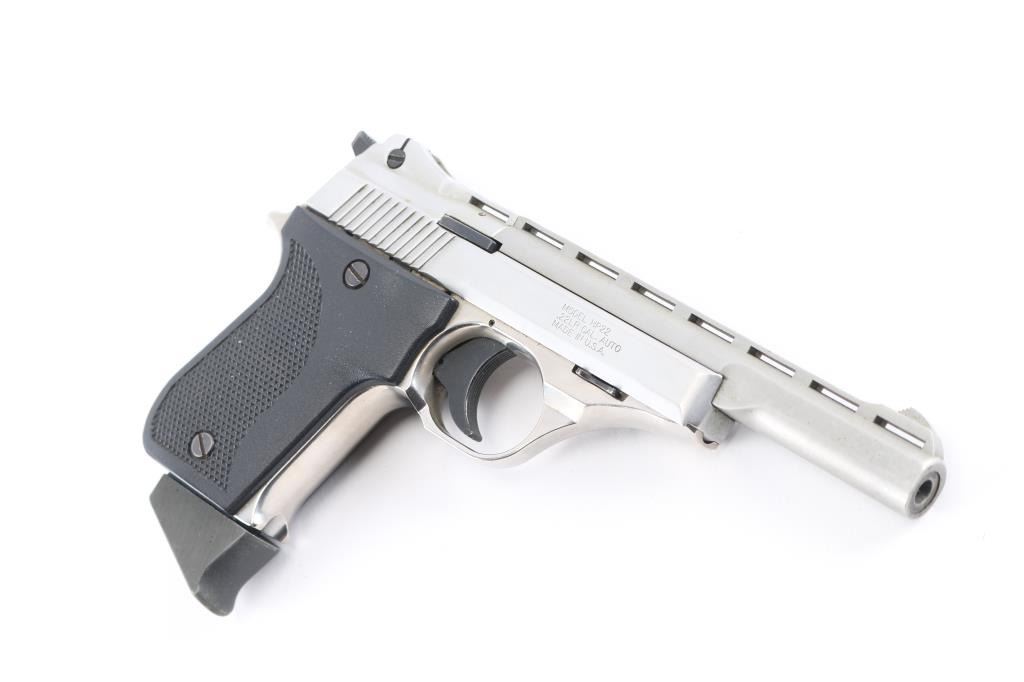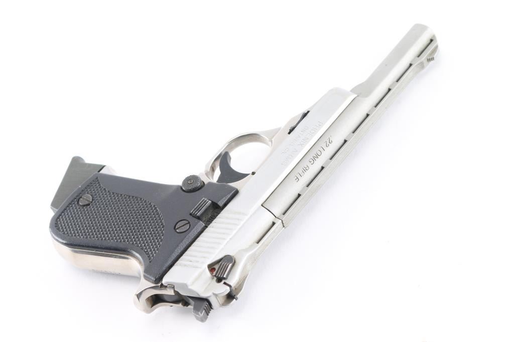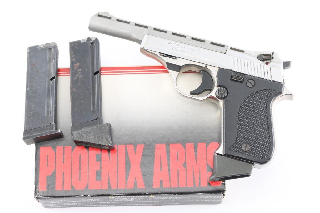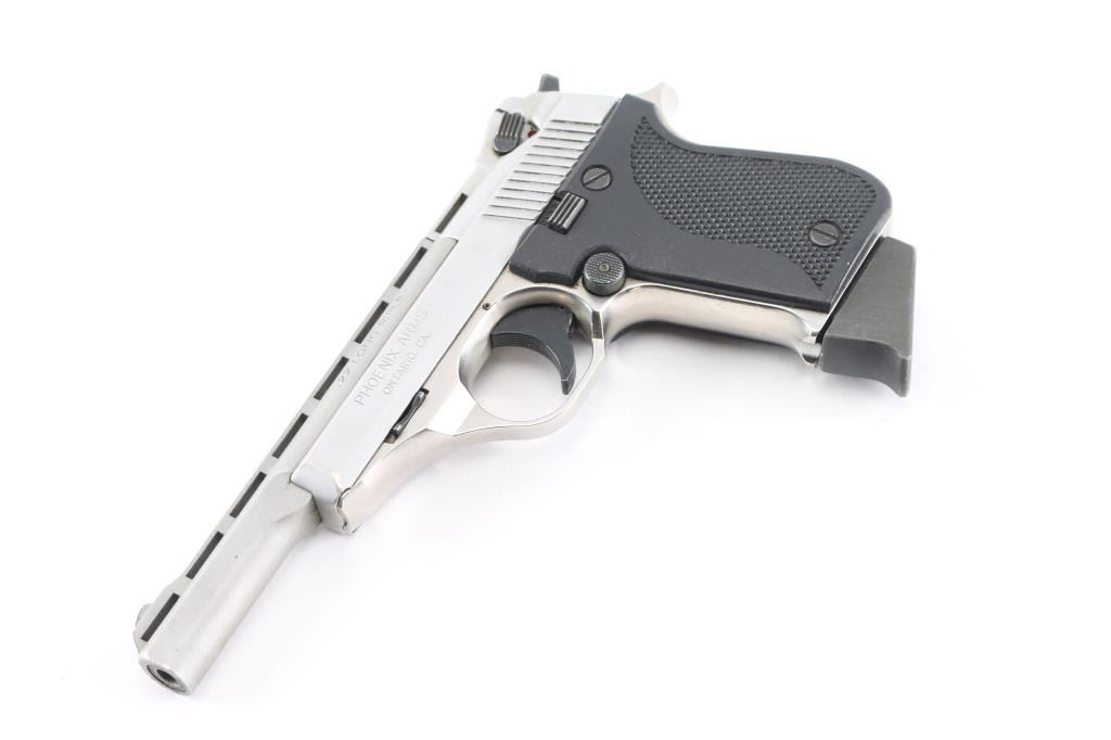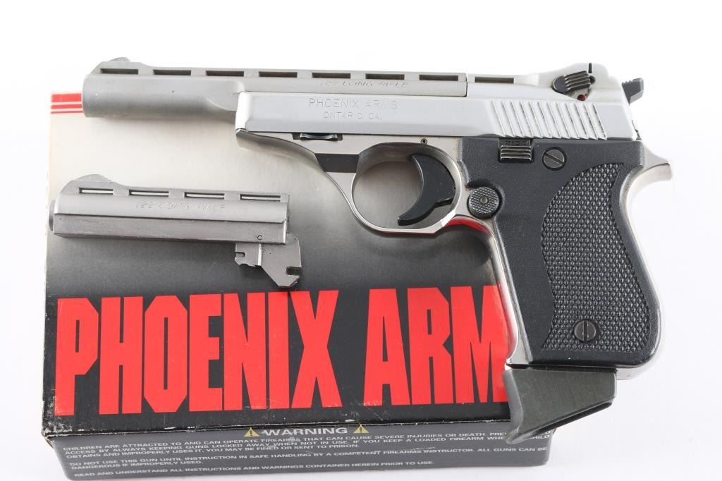 Semiautomatic rimfire pistol. Features nickel finish, 4.9" barrel and additional 3" barrel, vent rib barrels with ramp front sight, rear sight adjustable for windage, frame mounted and slide mounted manual safeties, push button mag release, checkered black plastic grips, single action trigger. Frame appears to be aluminum or zinc allow, slide might be stainless steel. Bores are very good in both barrels. Retains 90% finish with handling marks. Includes factory box, a Phoenix Arms trigger lock specific to this model, two magazines with pinky rest bottoms, and a standard magazine.