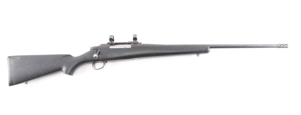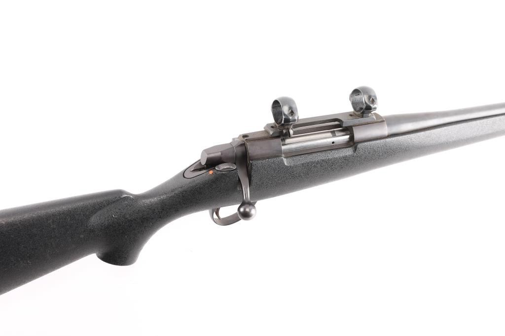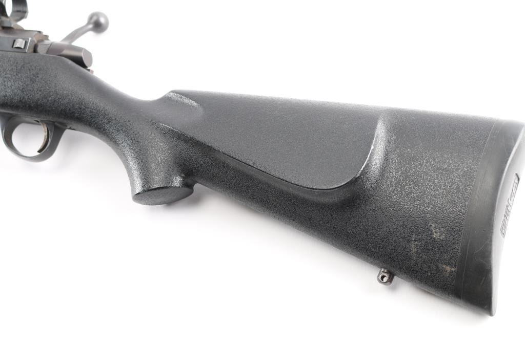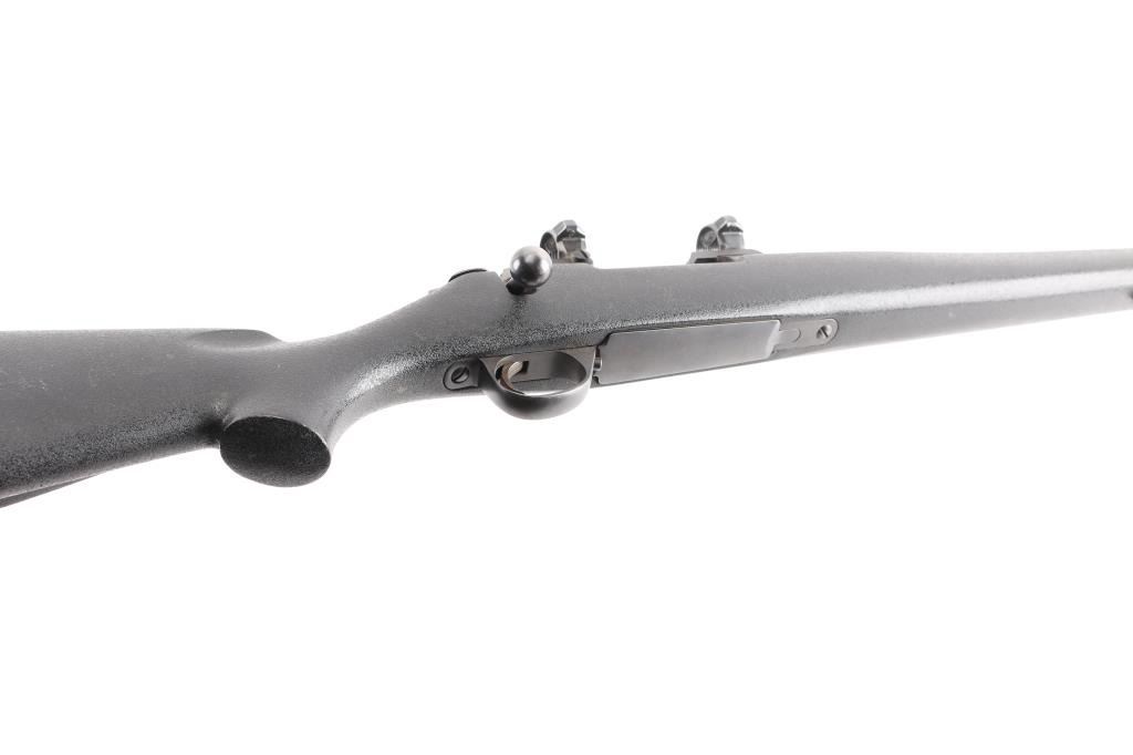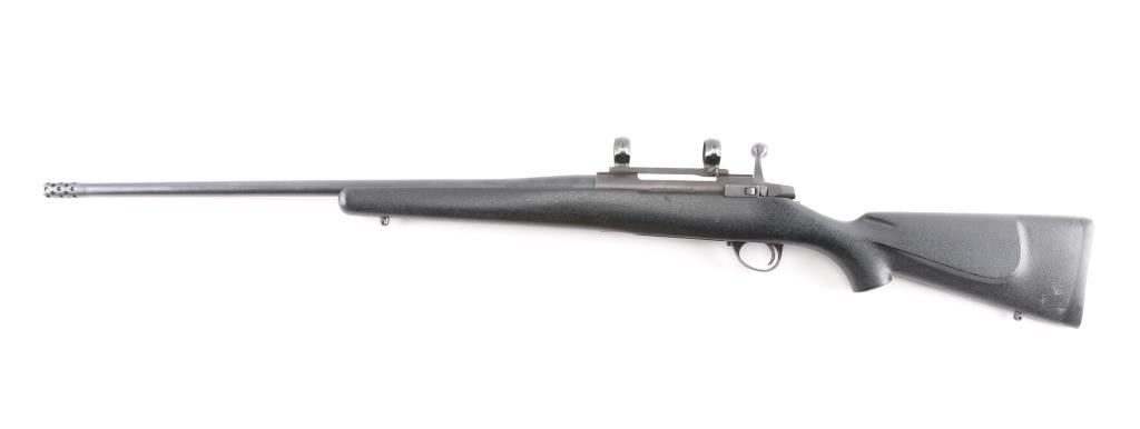 Finnish bolt action rifle, manufactured circa mid to late 1980's, no importer markings observed. Possibly refinished. Features matte blued finish, black composite sporter stock with right hand cheek piece, about one inch of cast-off, solid rubber butt pad, sling studs, 23.5" barrel with pepper pot muzzle brake installed, no sights, hinged floorplate, manual safety on right side of action, flat top receiver with dovetail rails, Redfield one piece scope base & rings (no optic). Bore is very good condition. Retains 95% finish with handling marks, some blemishes to the metal under the bluing (especially at muzzle brake). Several small patina spots on barrel. Stock is very good condition with minor blemishes.