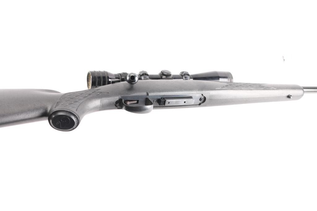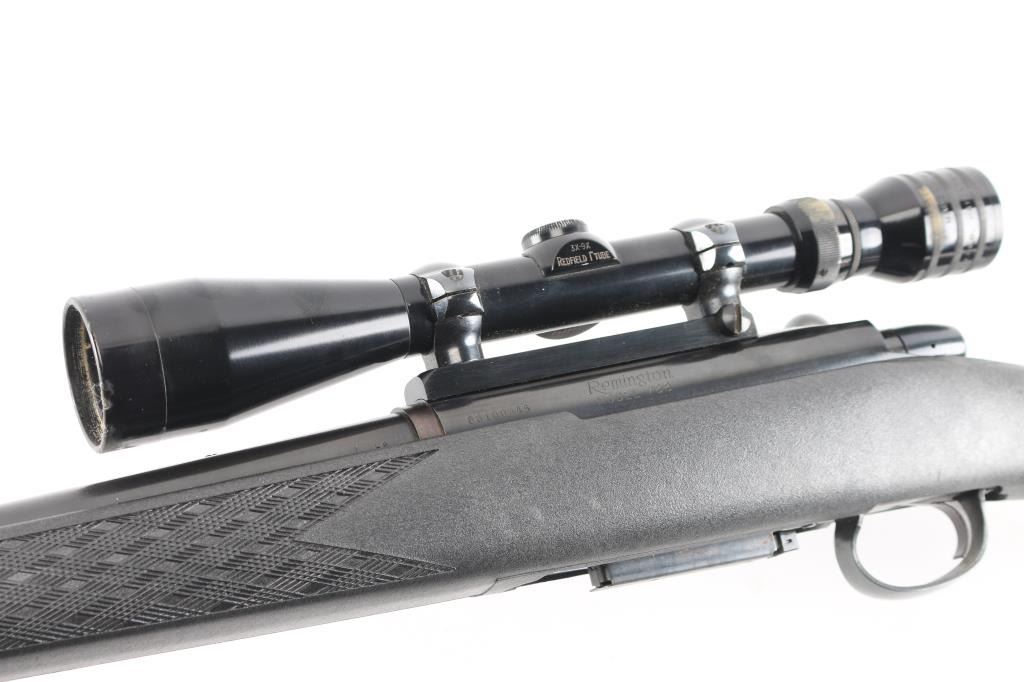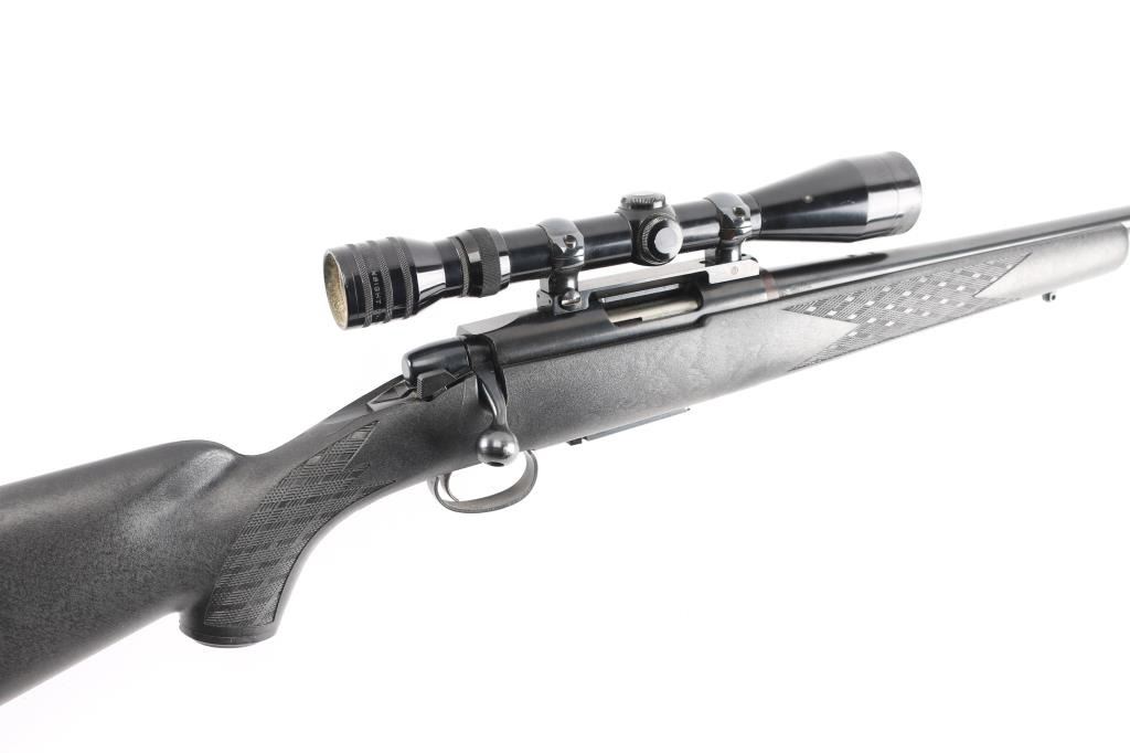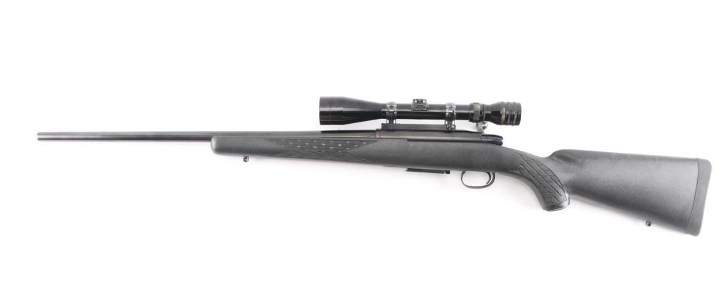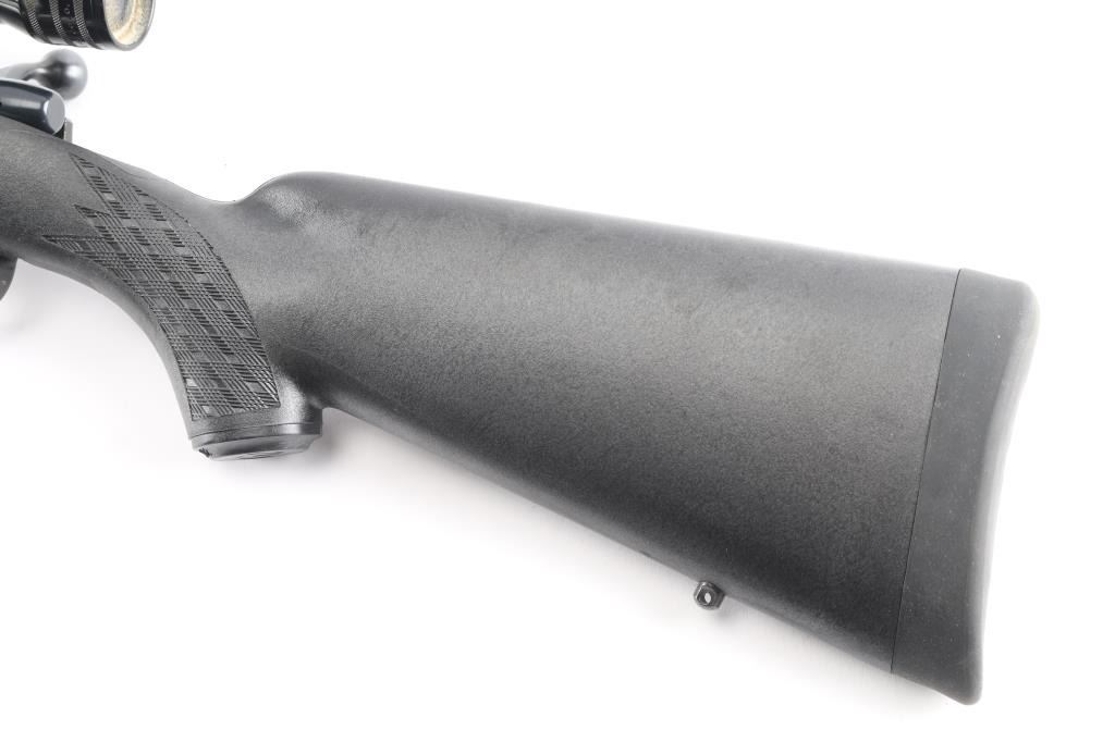 Bolt action magazine repeating rifle with 1980 date code. Features blued finish, 24" barrel, sights removed, manual safety, one piece Redfield mount & rings, black polymer stock with impressed checkering, no cheekpiece, solid rubber recoil pad, sling studs. Bright bore. Very good overall showing light use, some dried grease. Includes one detachable magazine.
