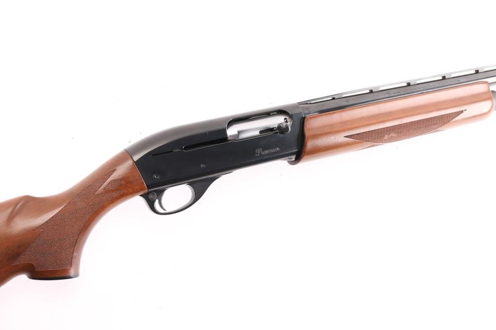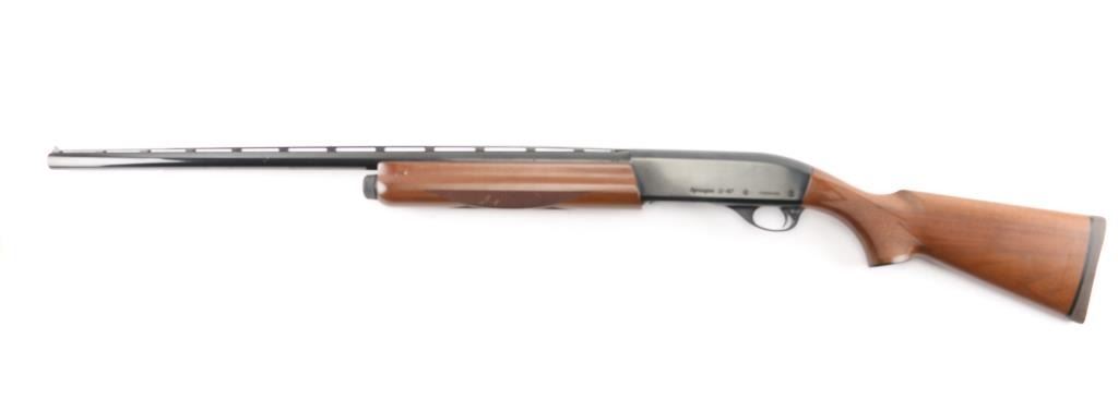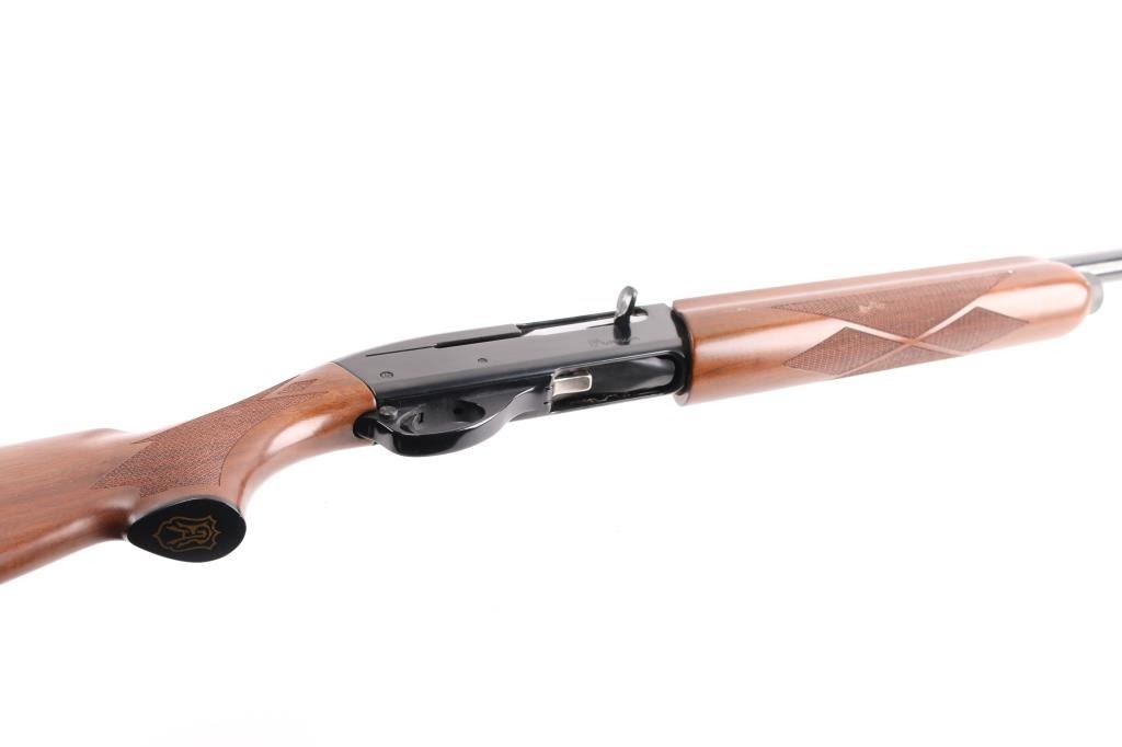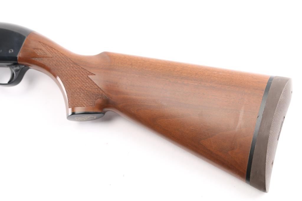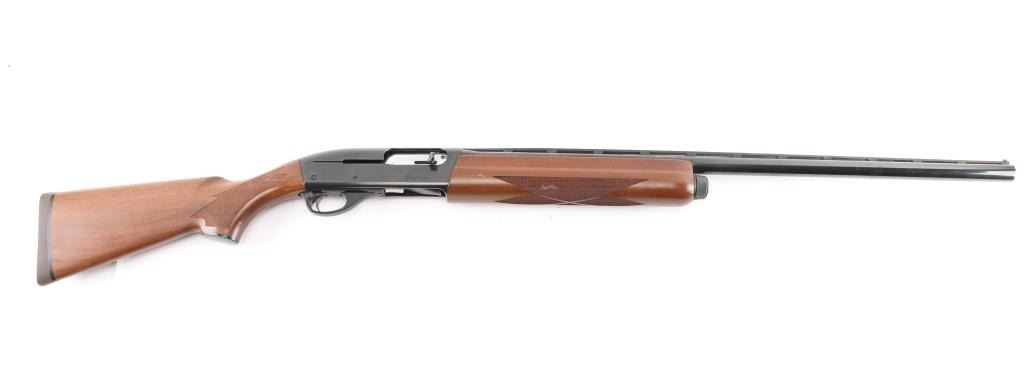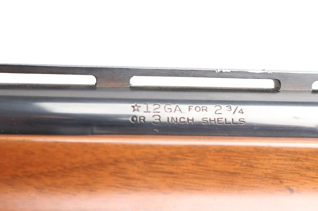 American made gas operated semi-automatic shotgun chambered for 2 3/4" or 3" 12 gauge shells. The model 11-87 was introduced in 1987 and was based off the Model 1100 but with a self-compensating gas system. Features a blued finish, 28" vent rib barrel with screw-in Full choke tube, white Bradley bead front sight, steel bead mid-sight, half-length tube magazine, smooth trigger with beveled edges, alloy triggerguard, serrated charging handle, push button safety, checkered walnut forend with satin finish, pistol grip shoulder stock with grip cap, factory solid recoil pad. Bore is very good. Retains 95% finish with handling marks, some dings to rib. Wood is near pristine.