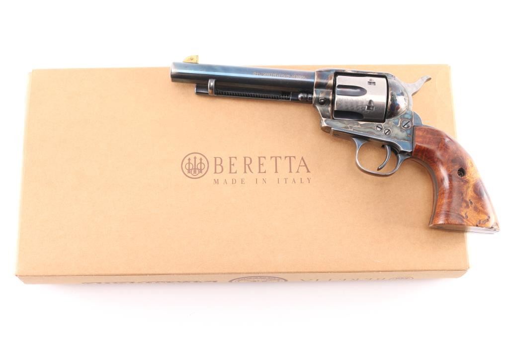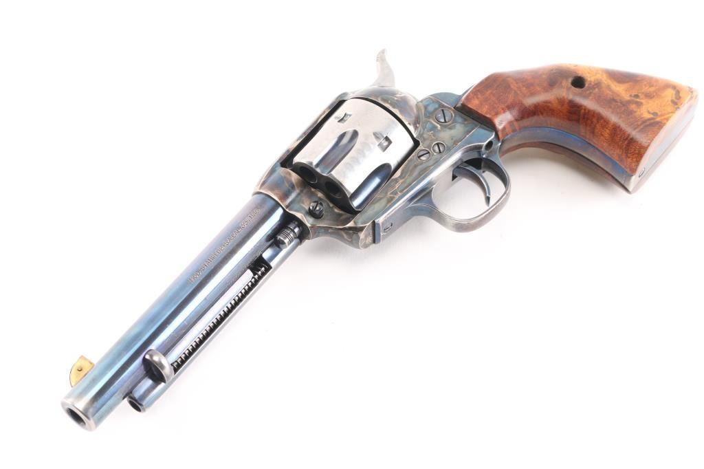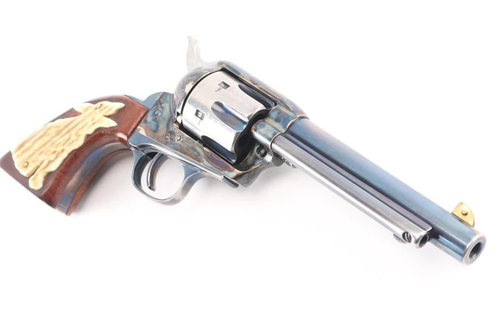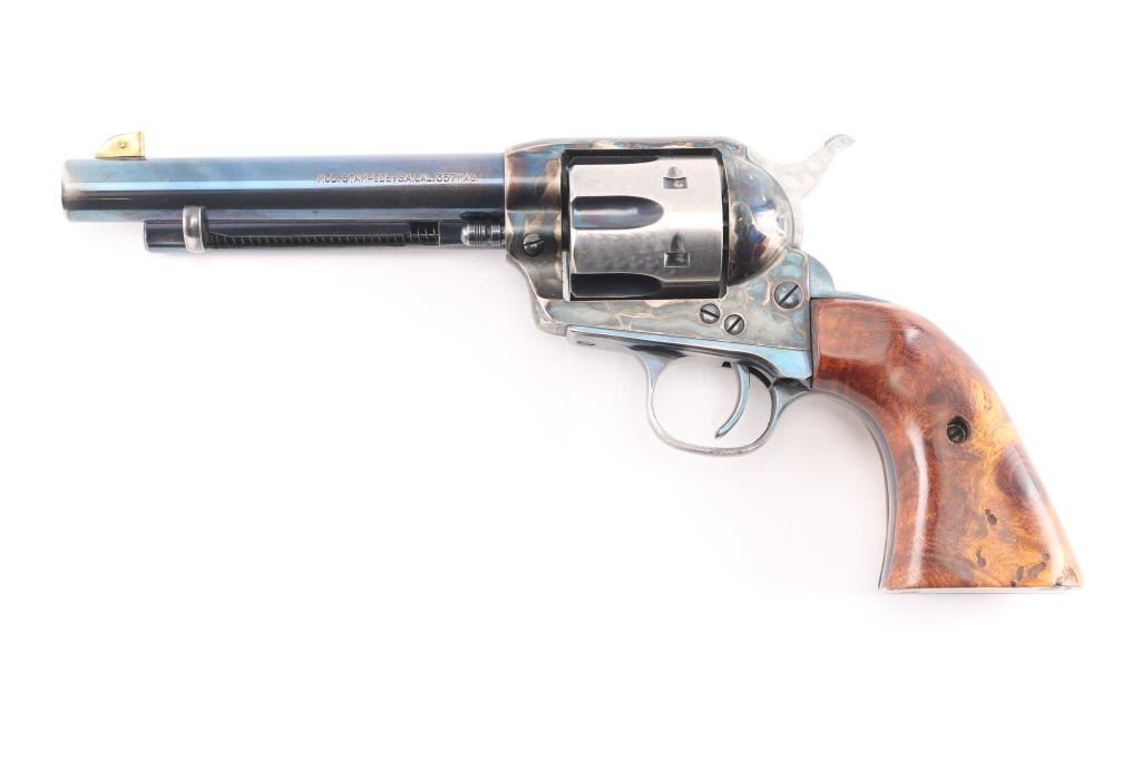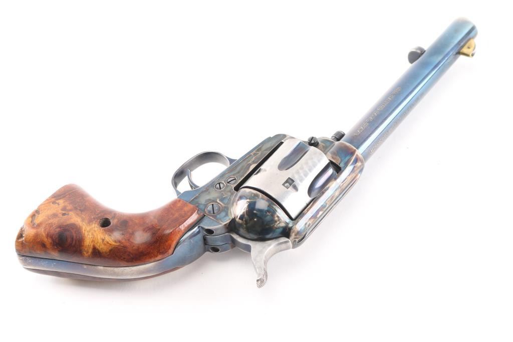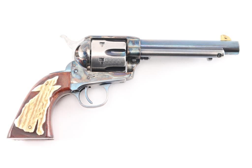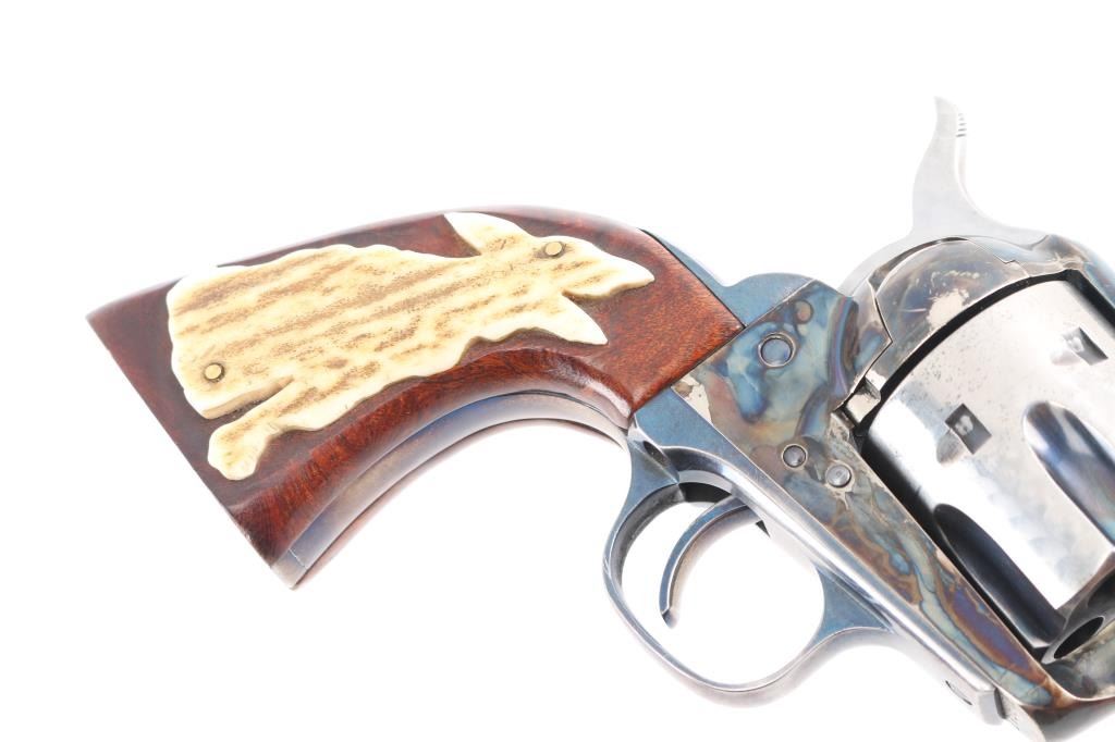 Single-action revolver, manufactured by Uberti in Italy, imported by Beretta USA, Accokeek MD. Revolver has been customized. Blue finish, case colored frame, 5 1/2" barrel, ejector rod, blade front sight wrapped in copper, pinned for better visibility, square notched rear sight, fluted six-shot cylinder, smooth wide trigger. knurled hammer spur and one piece smooth wood grips, the right panel has horn in the shape of a howling coyote pinned to it, and the left is contoured for the thumb. The cylinder, and the hammer sides have been jeweled, the flutes are still blue. Metal finish is overall good with holster wear on the muzzle, edges, and ejector rod housing, handling wear on the backstrap. Grips are very good,. Bore/cylinders are excellent/bright. Action is smooth/tight. Serial number matched on frame, cylinder, and loading gate. Comes with matching factory cardboard box/sleeve with manual.