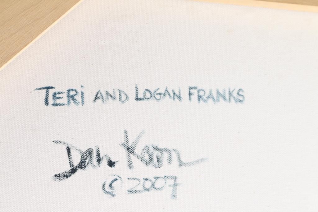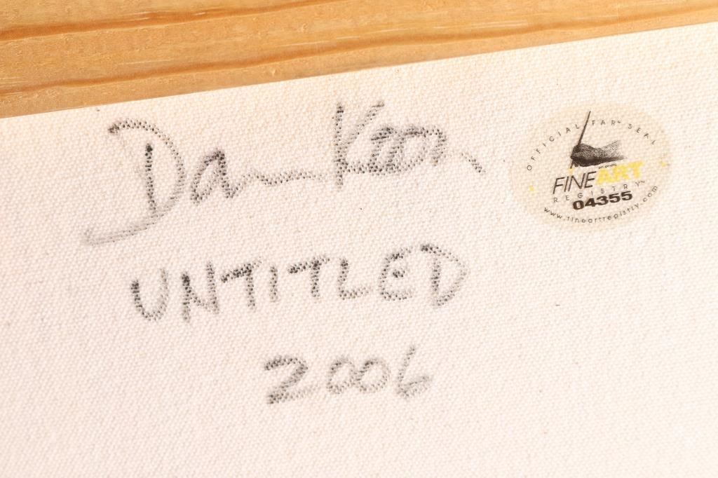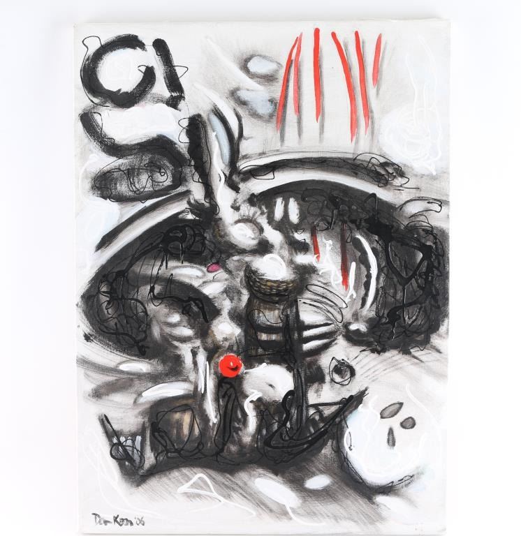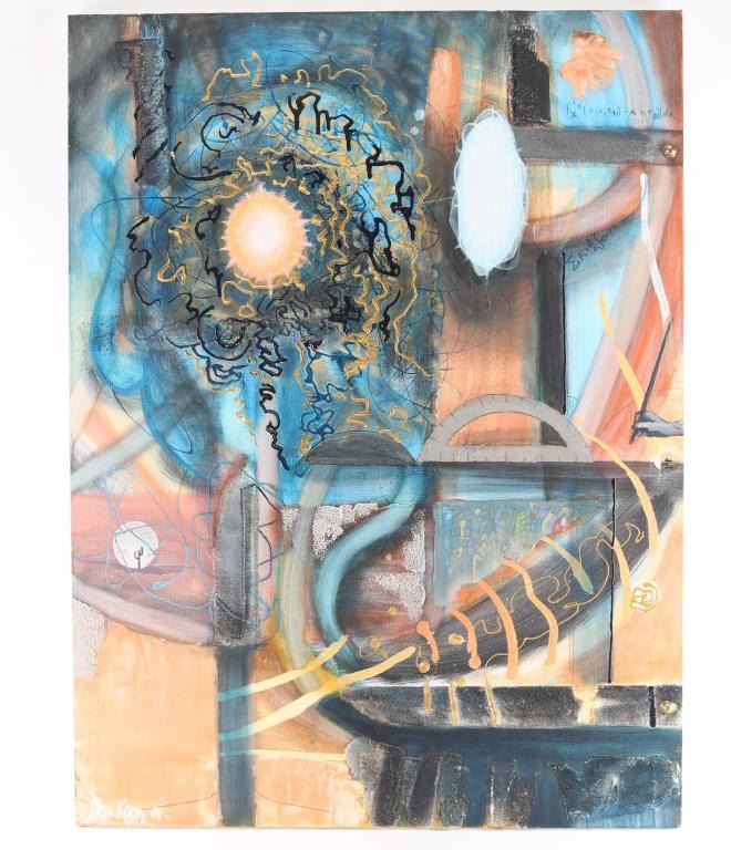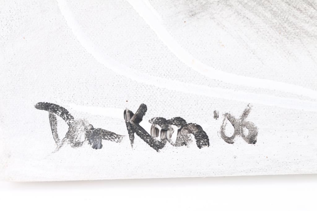 On canvas, by Dan Koon. Both abstract subjects. Largest measures 40&1/2" x 30&1/2". Signed lower left-hand corner. Smaller is 30"22", signed in lower left-hand corner. Dan Koon grew up in California near San Francisco and moved to Halmstad, Sweden, with his Swedish wife Mariette Lindstein in 2011. Dan is largely self-taught, although he has taken art classes at the University of California, Berkeley. He has been painting since the early 2000s when he began his art career copying artists he admires such as Vermeer, Rembrandt and Monet. Today, Dan focuses mostly on abstract painting but also paints on commission, including portraits, abstract and representational art.