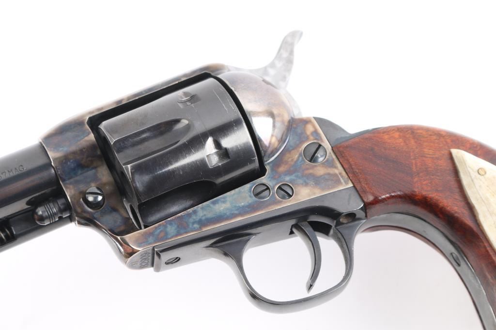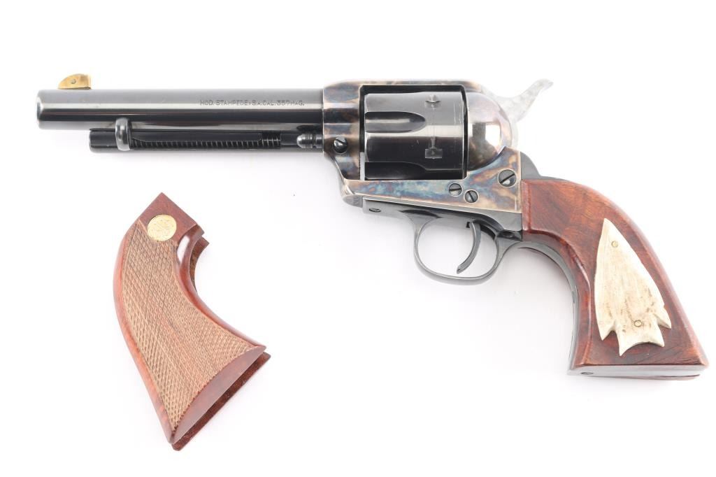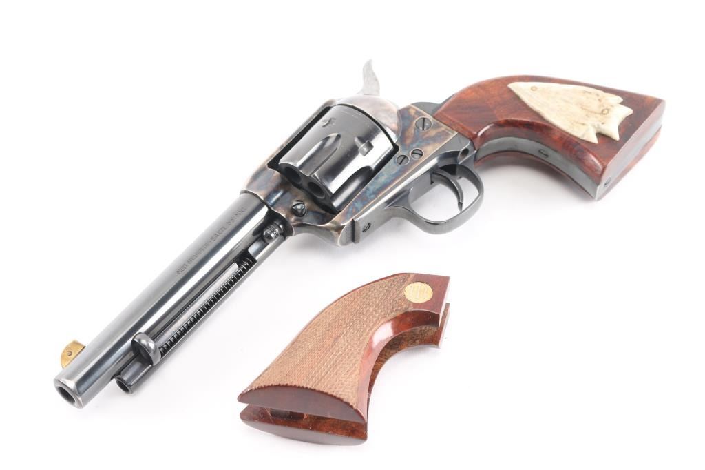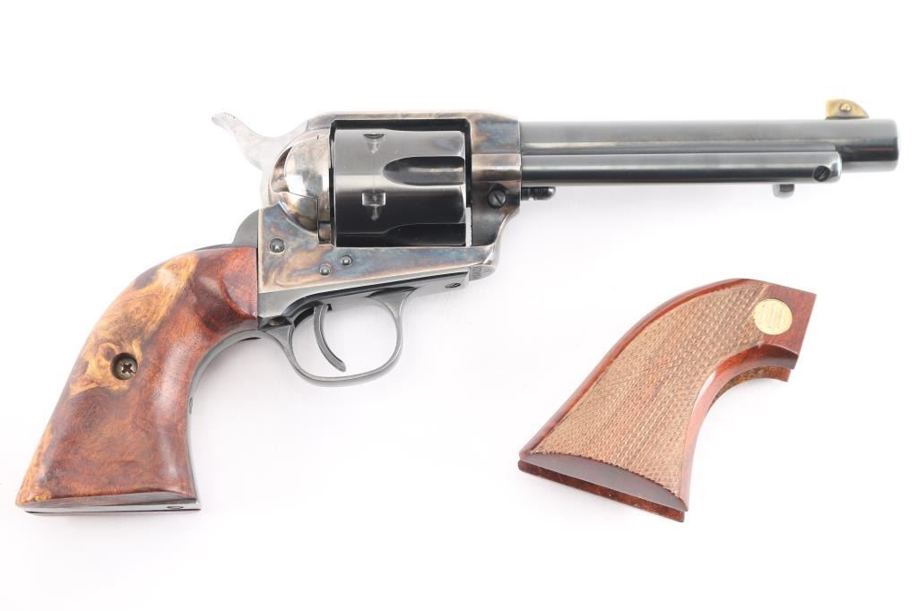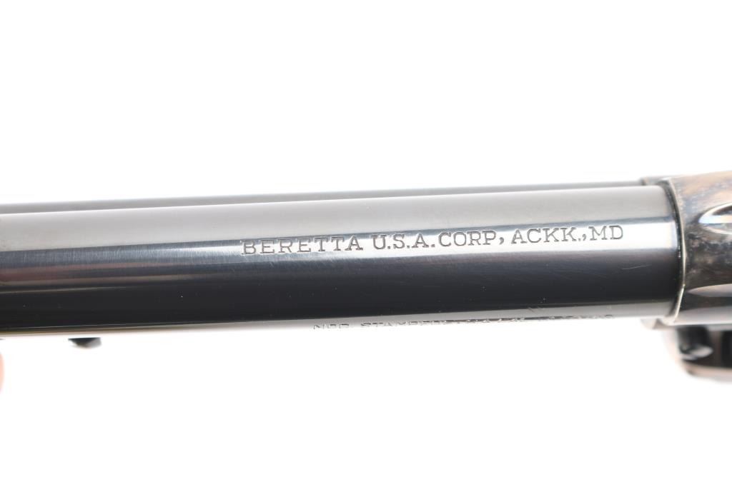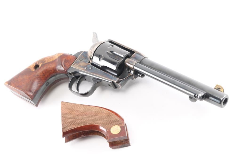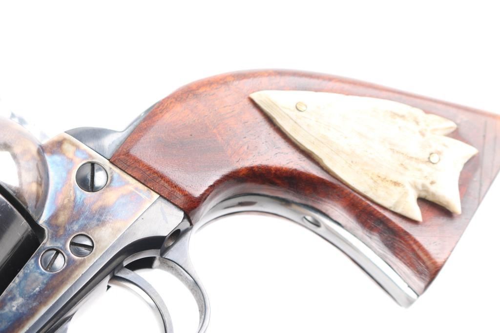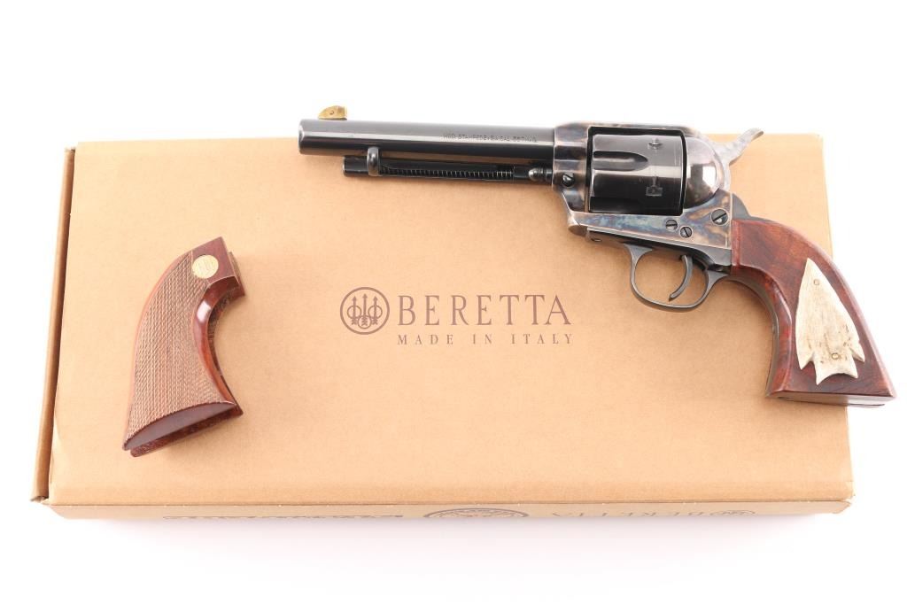Single-action revolver, manufactured by Uberti in Italy, imported by Beretta USA, Accokeek MD. Revolver has been customized. Blue finish, case colored frame, 5 1/2" barrel, ejector rod, blade front sight wrapped in copper, pinned for better visibility, square notched rear sight, fluted six-shot cylinder, smooth wide trigger. knurled hammer spur and one piece smooth wood grips, the right panel has horn in the shape of a arrowhead pinned to it, and the left is contoured for the trigger finger. The hammer sides have been jeweled. Metal finish is overall very good with minor holster wear on the muzzle, edges, and ejector rod housing, handling wear on the backstrap. Grips are very good,. Bore/cylinders are excellent/bright. Action is smooth/tight. Serial number matched on frame, cylinder, and loading gate. Comes with matching factory cardboard box/sleeve with manual, lock, and the original Beretta checkered wood grips with matching serial number