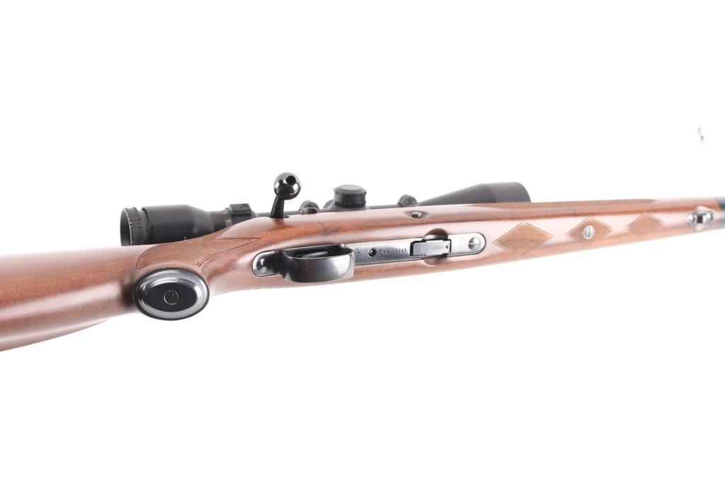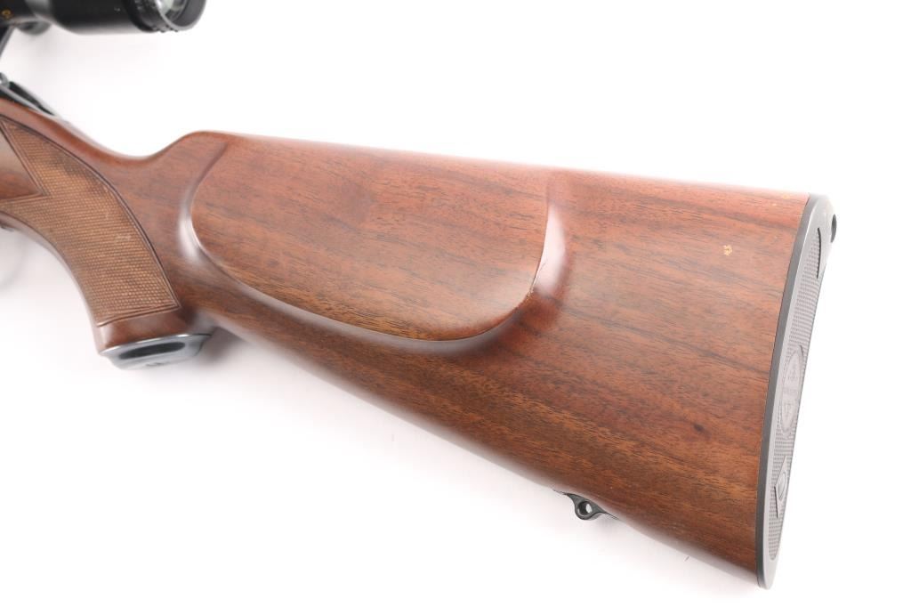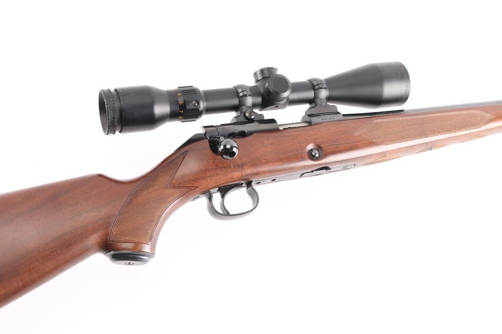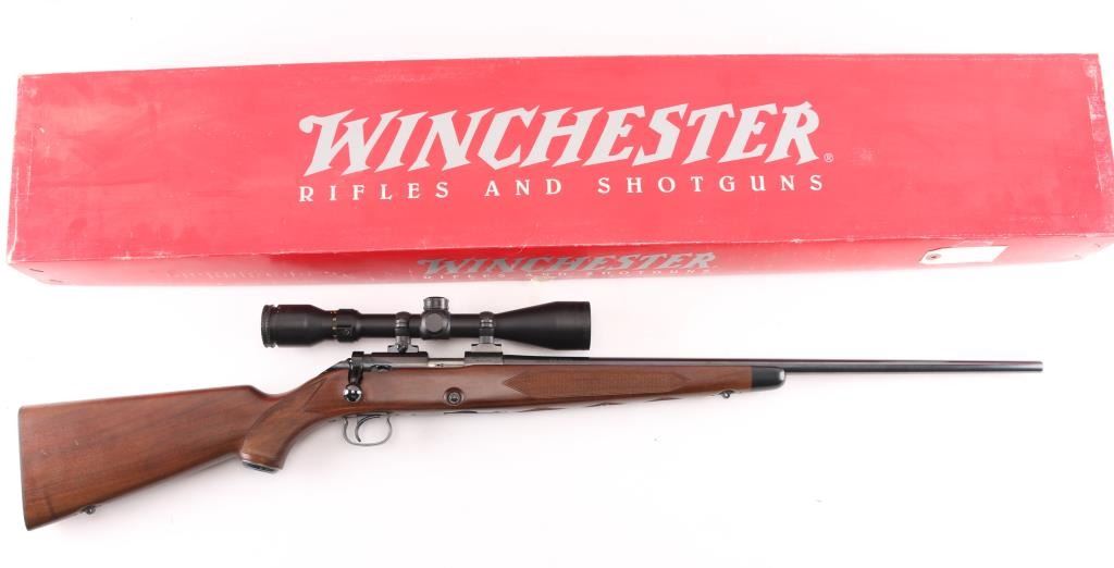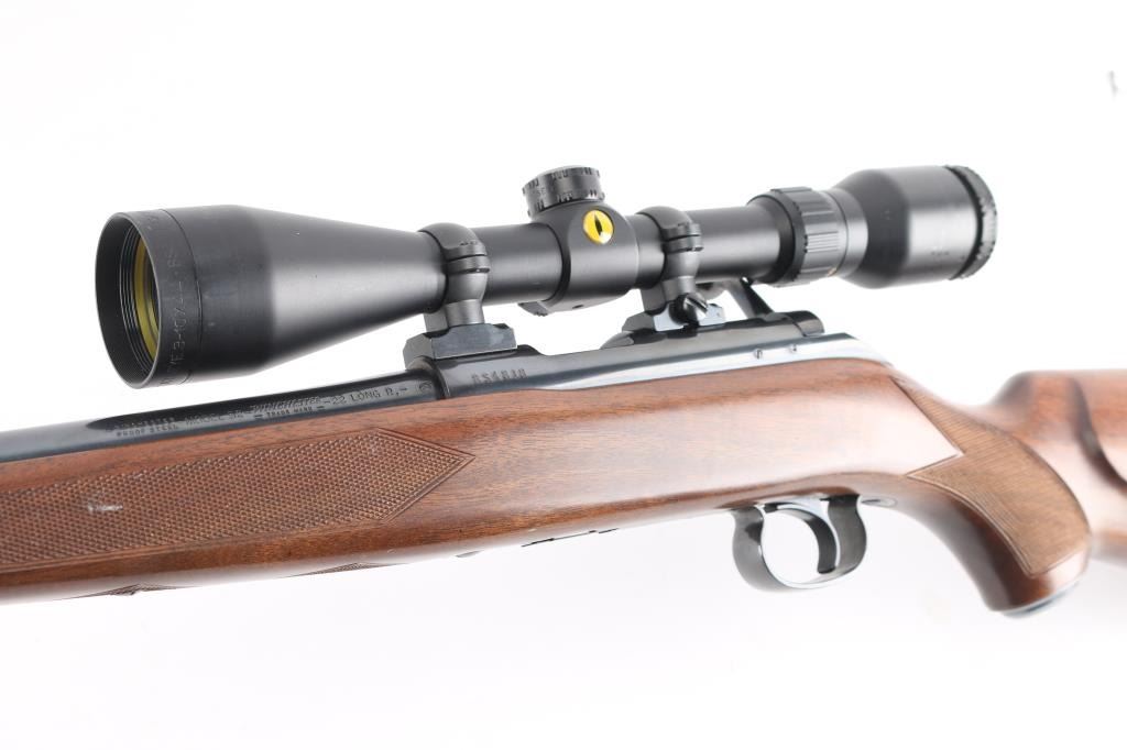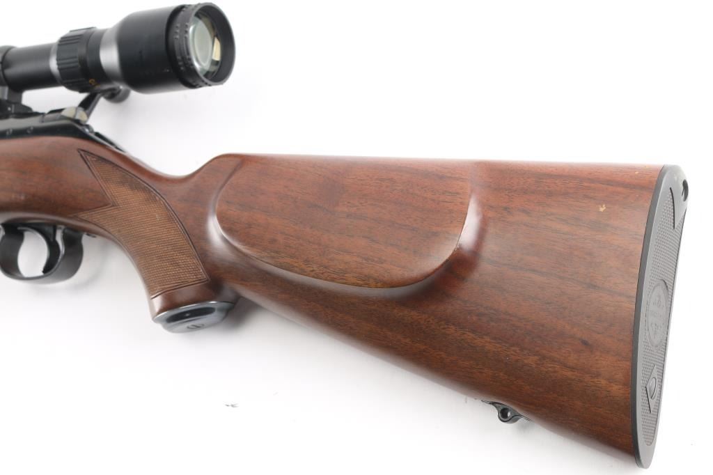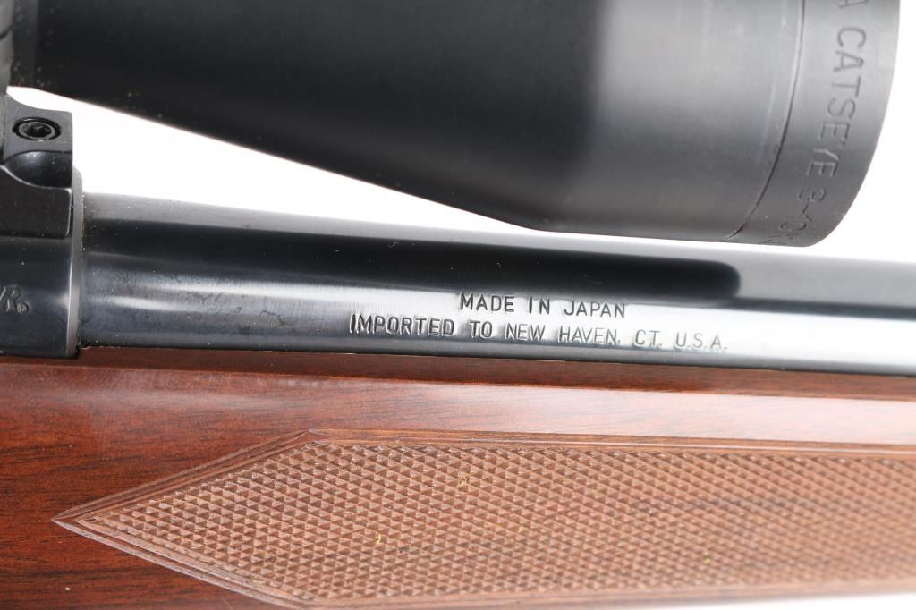 Japanese made "Sporting Model" bolt action rimfire rifle. Features blued finish, 24" barrel, no provision for sights, manual safety, push button magazine release in right side of stock, checkered metal factory buttplate, sling studs, checkered walnut stock with steel grip cap. Mounts a BSA "Cat's Eye" 3-10x scope. Bore is bright. Retains 98% finish with minor handling marks. Wood shows light handling. Includes factory cardboard box.
