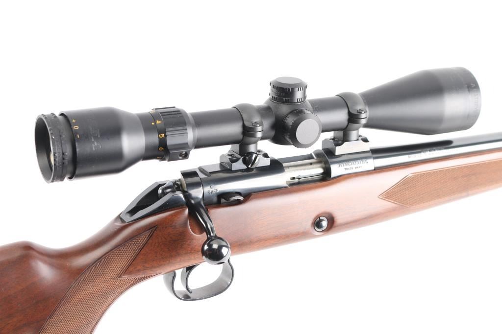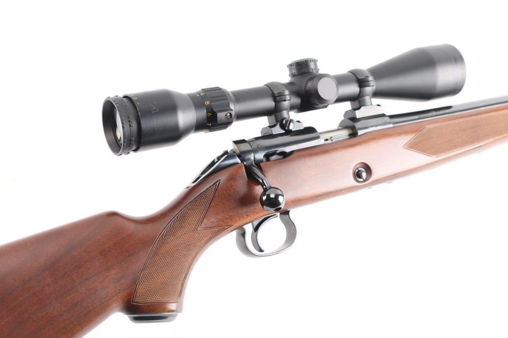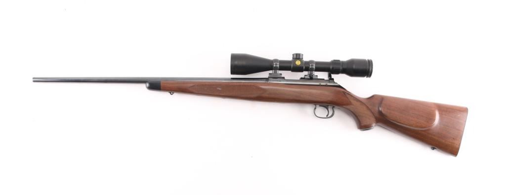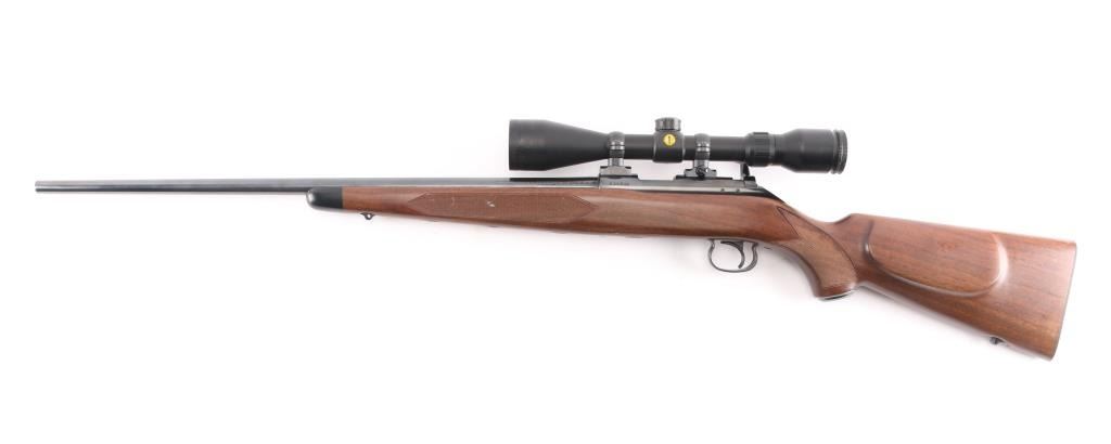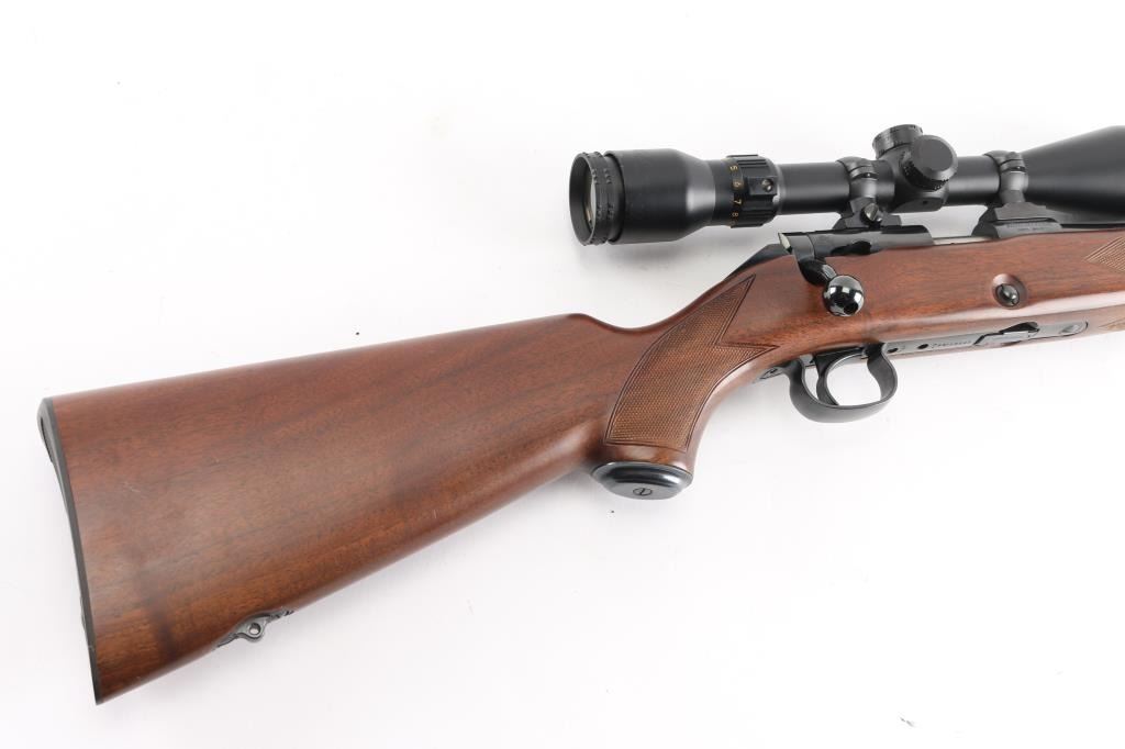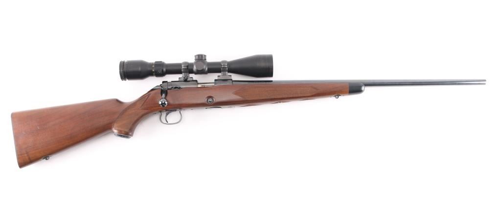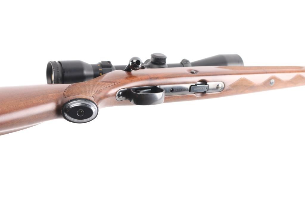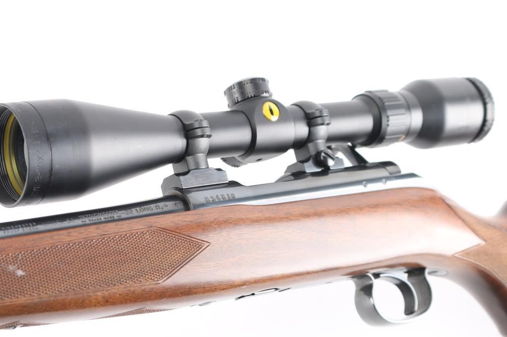 Japanese made "Sporting Model" bolt action rimfire rifle. Features blued finish, 24" barrel, no provision for sights, manual safety, push button magazine release in right side of stock, checkered metal factory buttplate, sling studs, checkered walnut stock with steel grip cap. Mounts a BSA "Cat's Eye" 3-10x scope. Bore is bright. Retains 98% finish with minor handling marks. Wood shows light handling. Includes factory cardboard box.