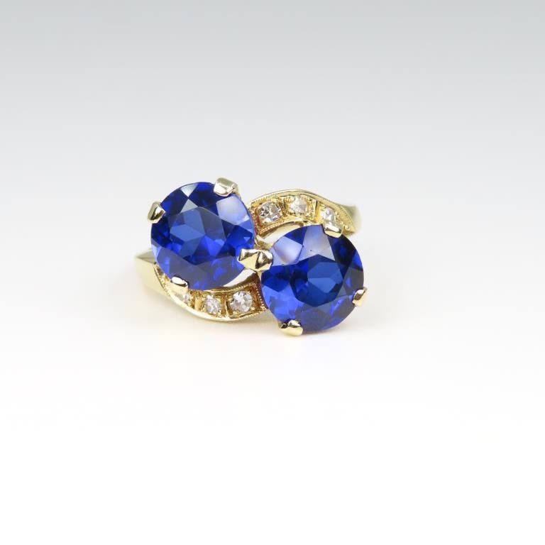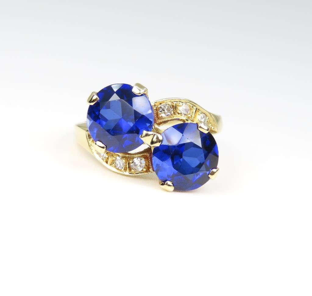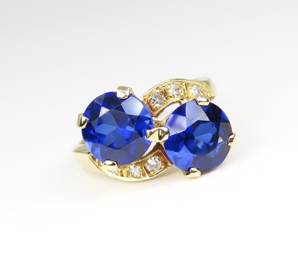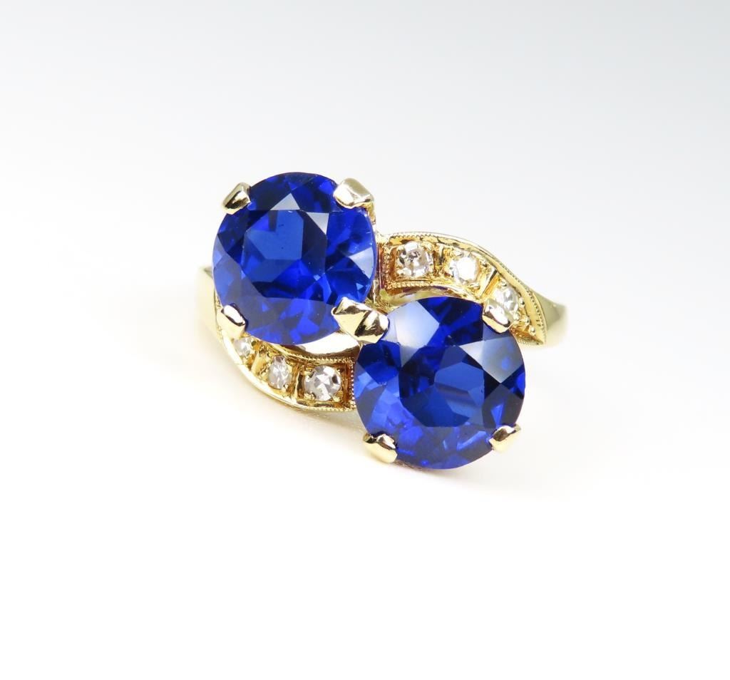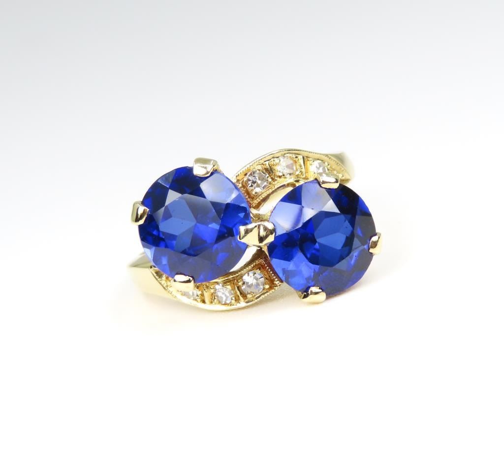 and Diamond Ring featuring 2 stunning round Lab created Royal Blue Sapphires weighing approx. 5.00 carats total accented with 6 round cut Diamonds with G-H colors and VS clarity set in a vintage style 14 karat yellow gold setting. Size 7.