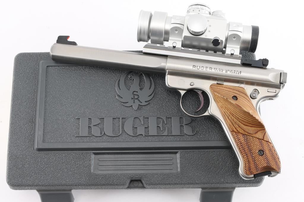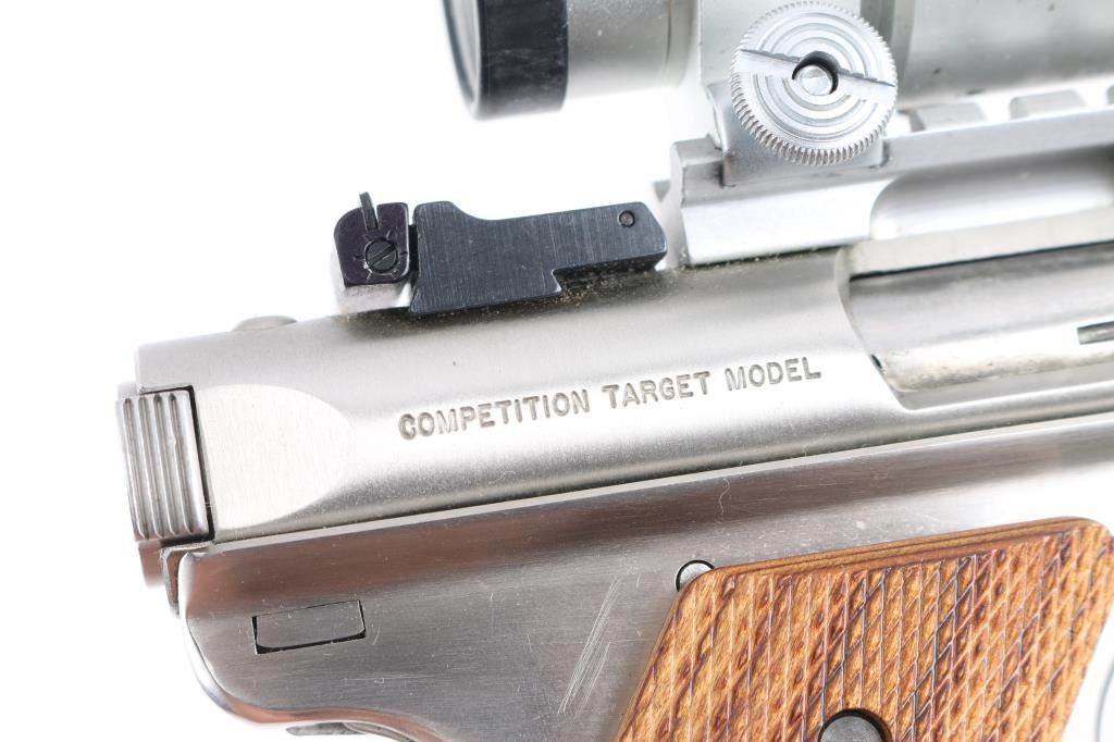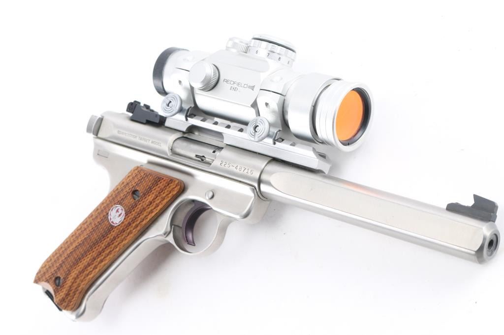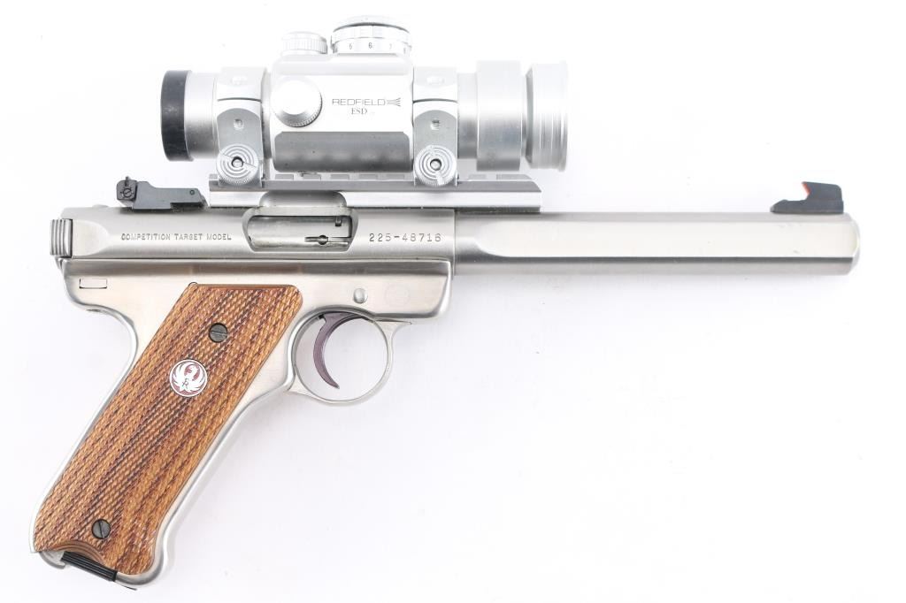 "Competition. Target Model' Semiautomatic rimfire pistol features stainless steel construction, blued accent serrated trigger, 6 3/4" slab sided bull barrel, adjustable sights, manual safety, heel magazine release, checkered wood target grips with red & silver Ruger medallion on right panel, thumb rest on left panel. Mounted with a Redfield ESD red dot scope. Condition is like new, few signs of handling, bore is excellent/bright. in factory gray plastic box with manual & spare magazine, (2) total, CR2354 3 volt battery for scope. Overall condition is like new, bore is excellent/bright