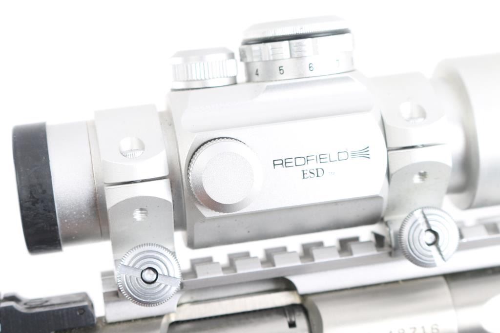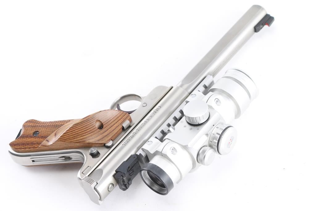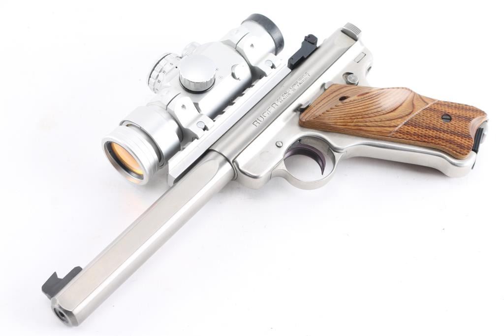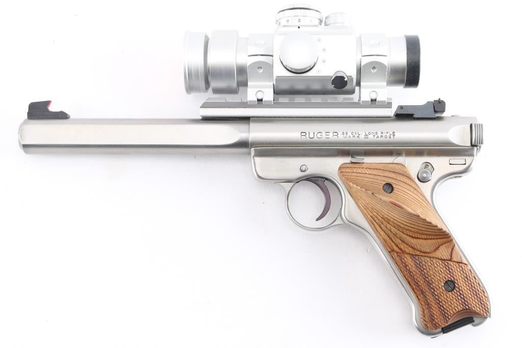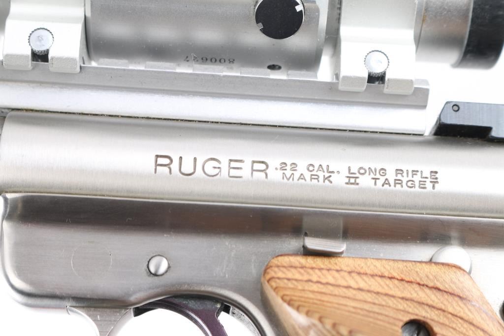 "Competition. Target Model' Semiautomatic rimfire pistol features stainless steel construction, blued accent serrated trigger, 6 3/4" slab sided bull barrel, adjustable sights, manual safety, heel magazine release, checkered wood target grips with red & silver Ruger medallion on right panel, thumb rest on left panel. Mounted with a Redfield ESD red dot scope. Condition is like new, few signs of handling, bore is excellent/bright. in factory gray plastic box with manual & spare magazine, (2) total, CR2354 3 volt battery for scope. Overall condition is like new, bore is excellent/bright