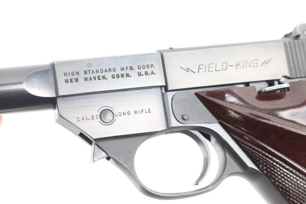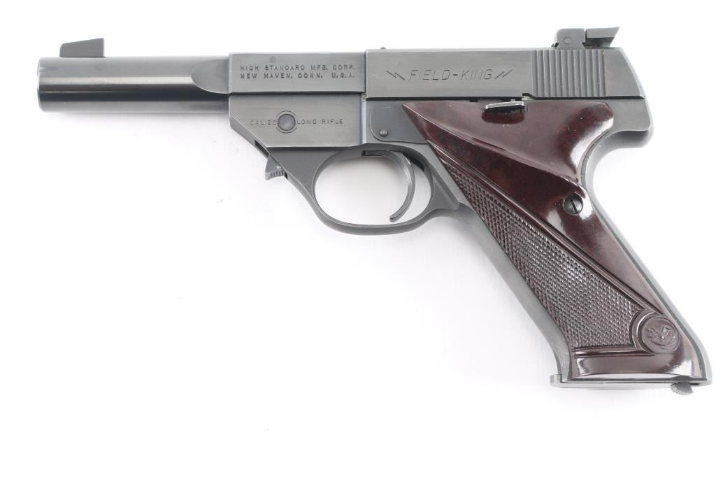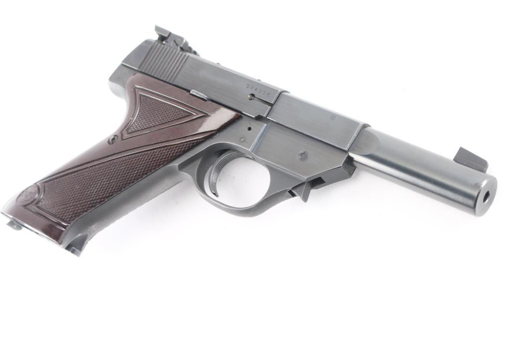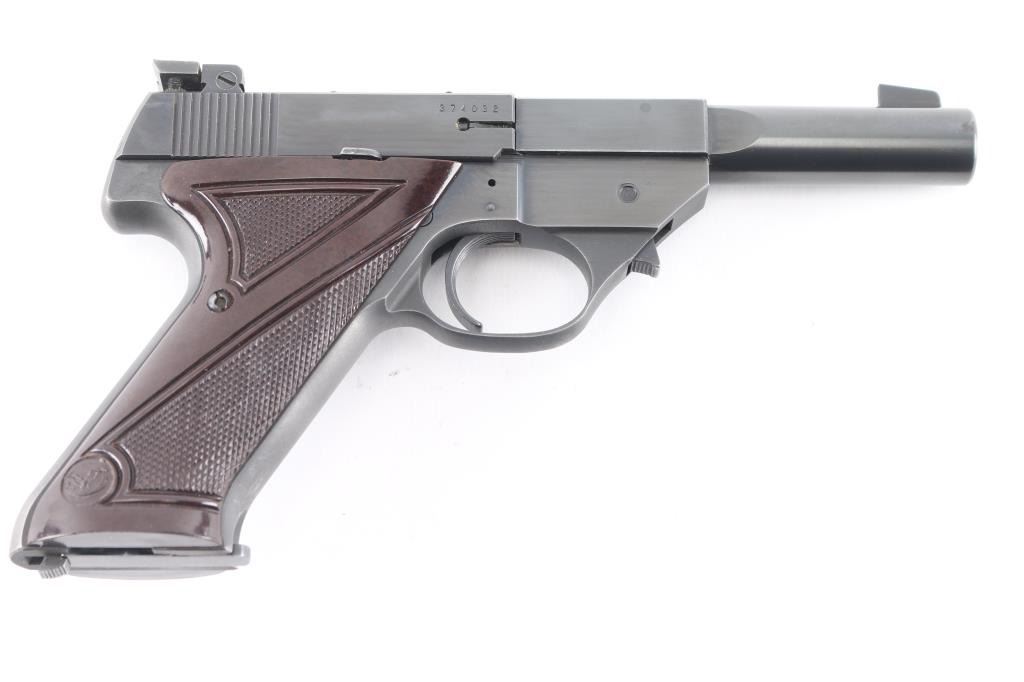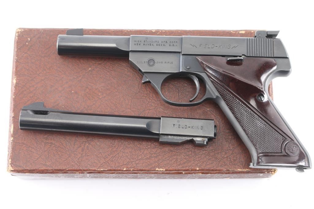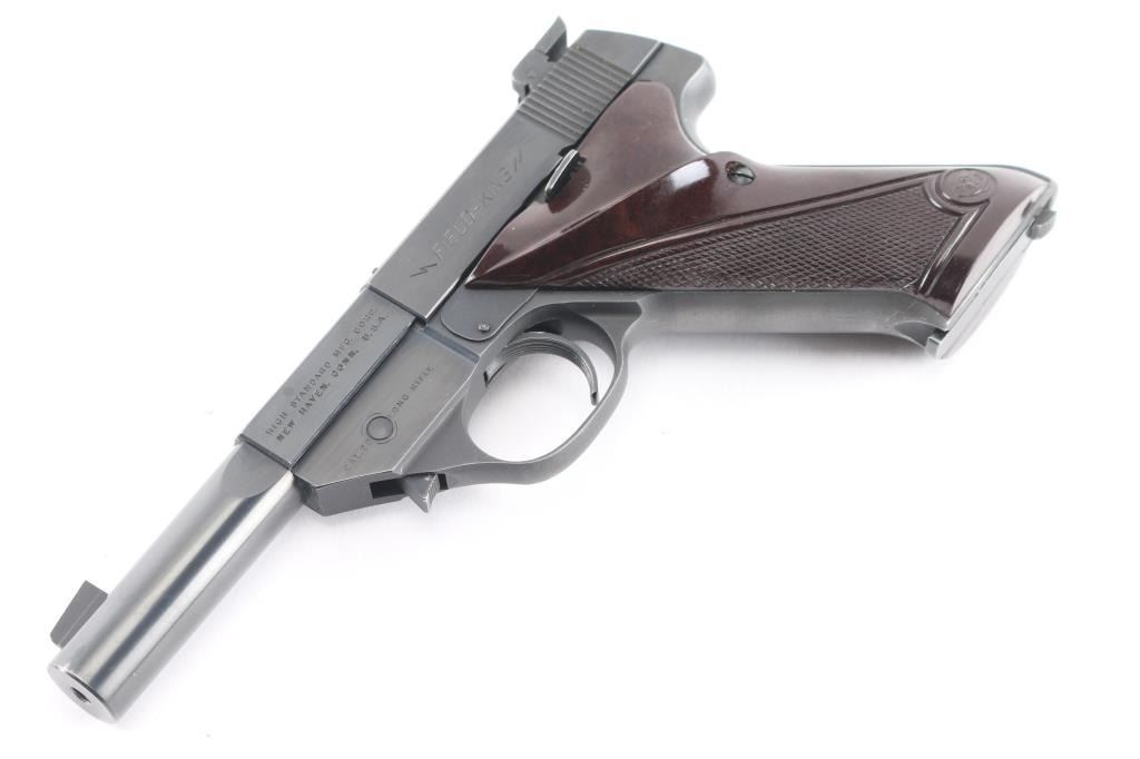 Semiautomatic rimfire pistol manufactured circa 1951 - 1953. Features blued finish, checkered brown plastic grips (thumb rest for right handed shooter), 4.5" heavy round barrel with shrouded breech, lever take-down, adjustable sights, manual safety, slide stop lever, heel magazine release. Bore is excellent/bright. Retains 98% blue, some minor edge wear. Grips are excellent. Includes (1) magazine. Original factory box with matching label, paperwork, and extra 6.75" Field King ported barrel, excellent condition in original box.