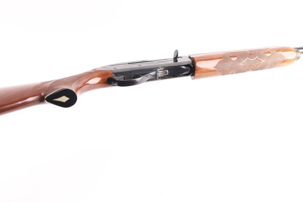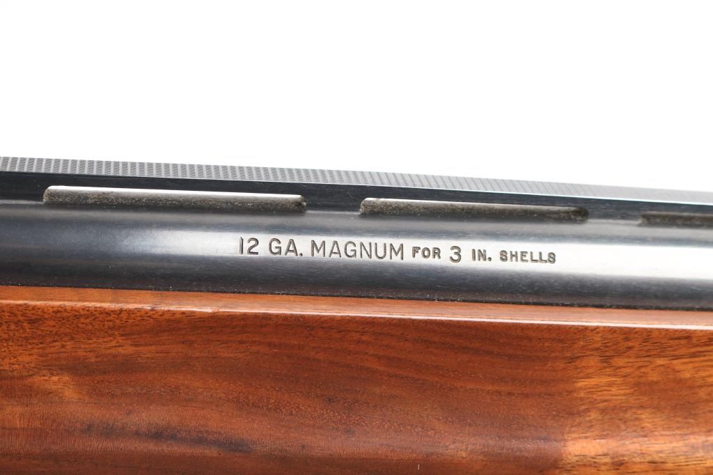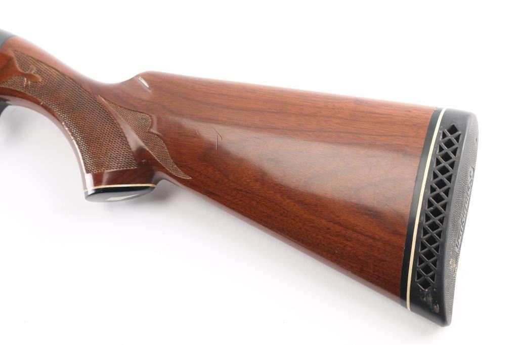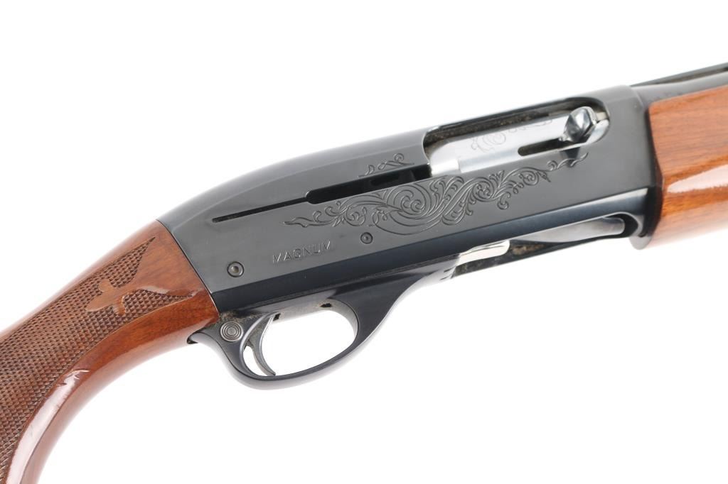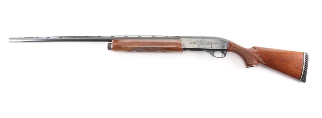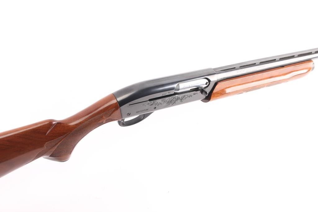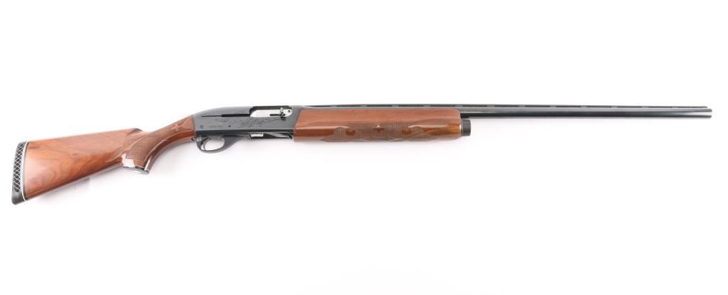 12 Ga. Shotgun. Semi-Automatic. Gas-Operated. Produced 1963-Present. 30" barrel with vented rib. sighting bead. 3" chamber. Full choke. 4-rd tube magazine. Push button safety. Bottom loading, side ejecting. Floral scroll designs on receiver. Bore is excellent. Action is crisp/tight. Blued finish is excellent, a couple of very minor scratches. Checkered walnut stock and forearm are near excellent with very minor scratches. Black rubber Remington recoil pad. LOP is 14".
