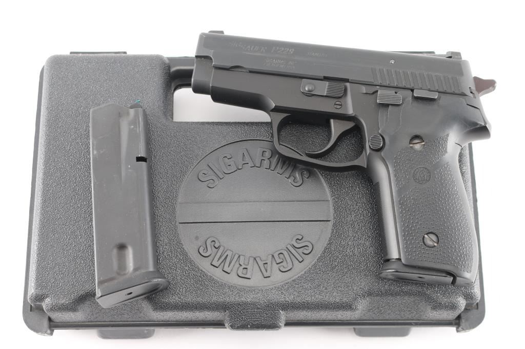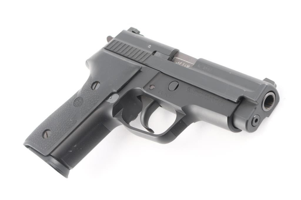 Semiautomatic pistol, frame made in Germany, imported by SIGARMS, Exeter NH. Features matte black finish, Hogue rubber grips, 3.8" barrel, blade front and rear notch tritium insert night sights, frame mounted decocker, double/single action trigger. Serrated hammer and front grip strap. 12 round metal magazine. Bore is pristine/bright. Retains approximately 85% finish with very little edge wear and some small scratches on top rear of slide. Grips are slightly worn from regular use. Comes with two 12 rd magazines, manual and original factory plastic case.