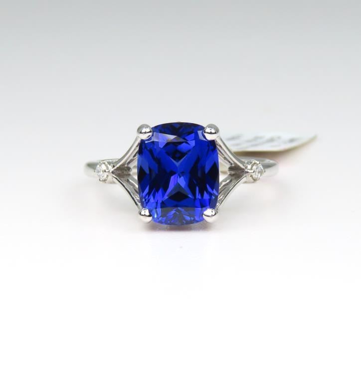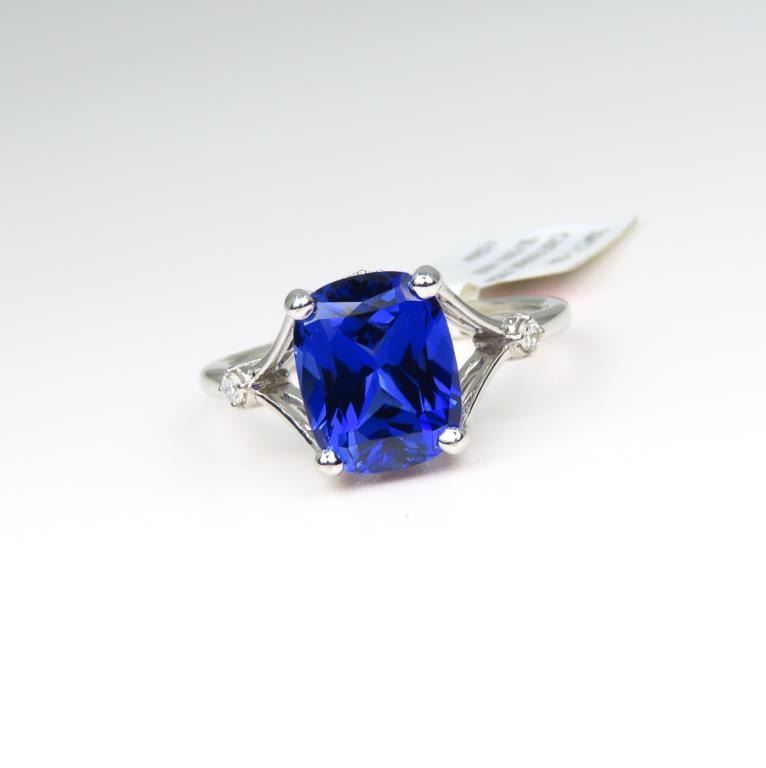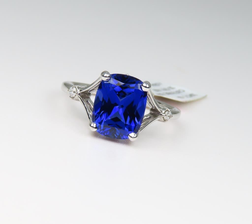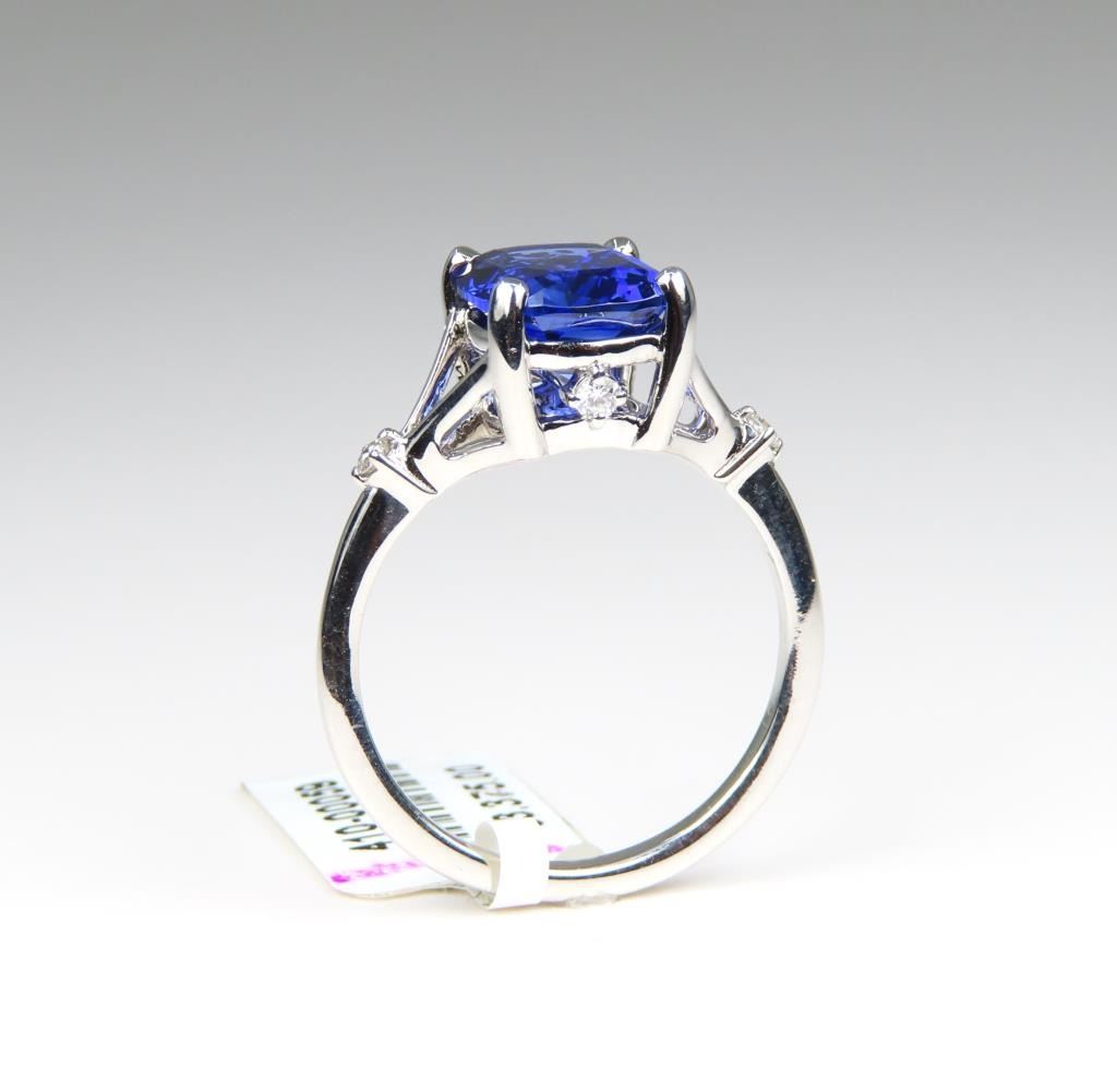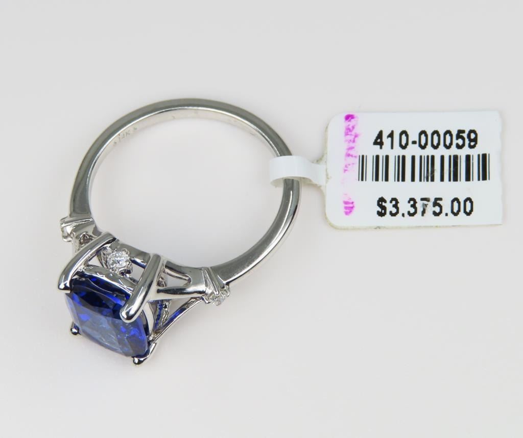 Blue Sapphire and Diamond Ring featuring a cushion cut, intense Blue Sapphire weighing approx. 4.00 carats accented with 4 round cut Diamonds set in a 14 karat white gold setting, Size 7. Ring has original Retail Tag - $3,375.00