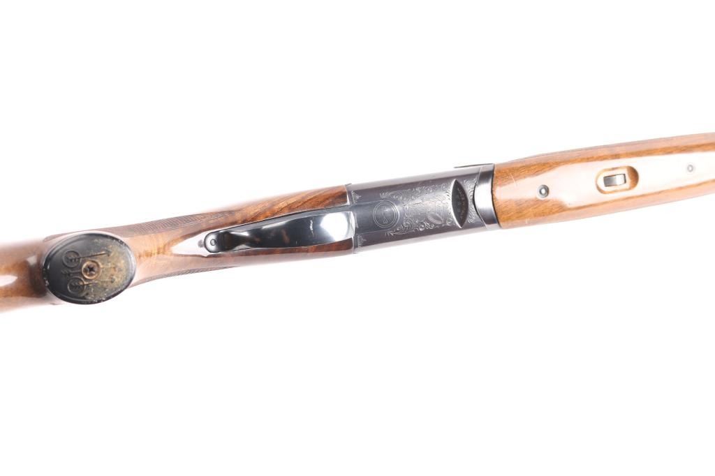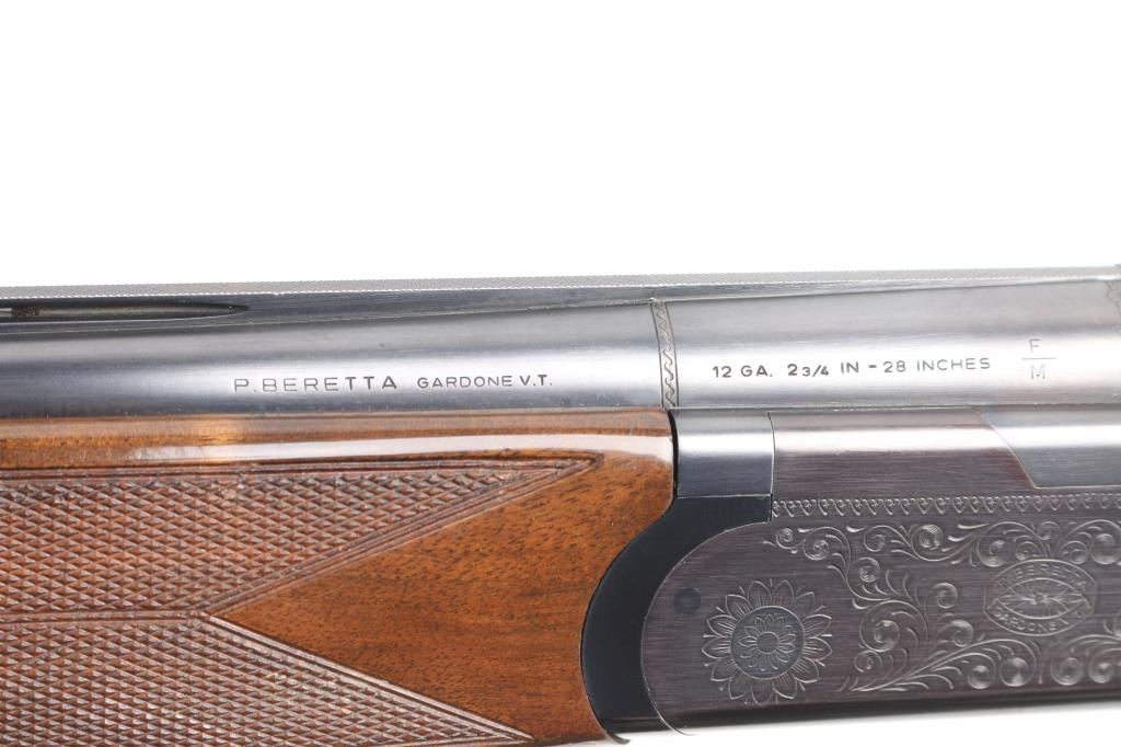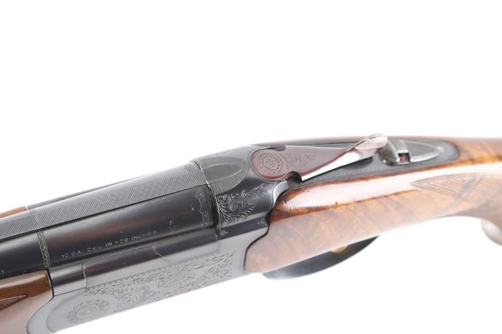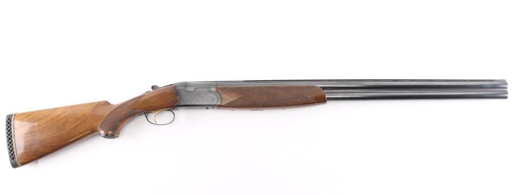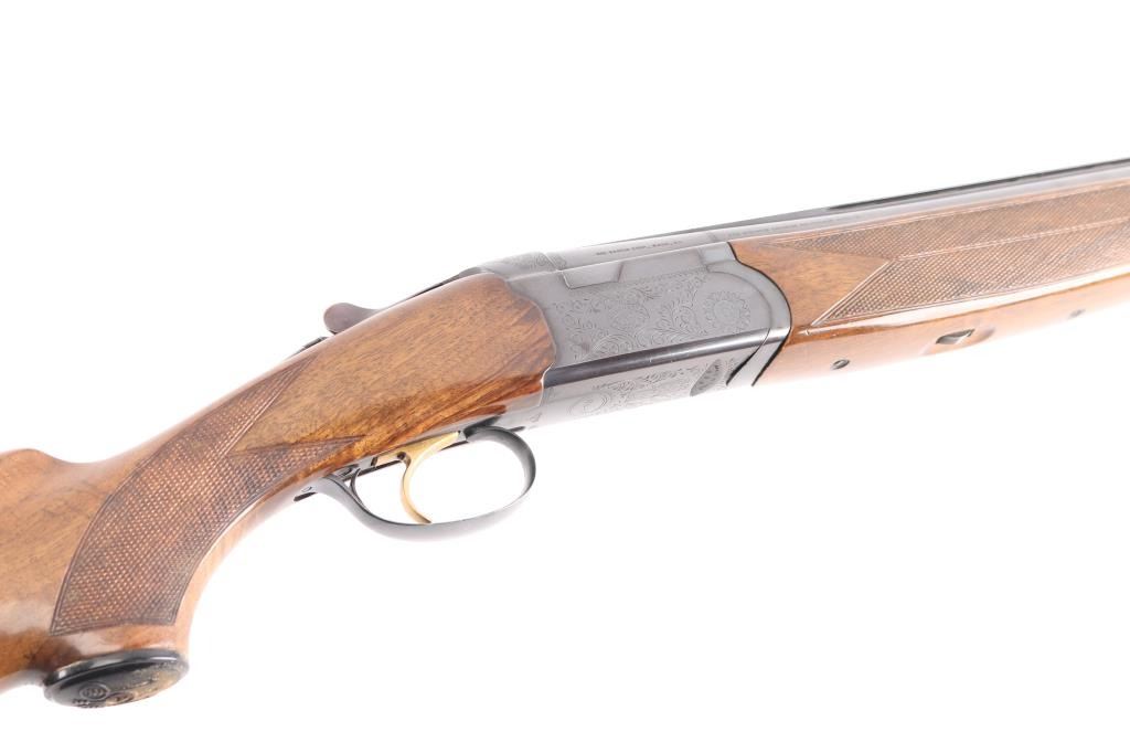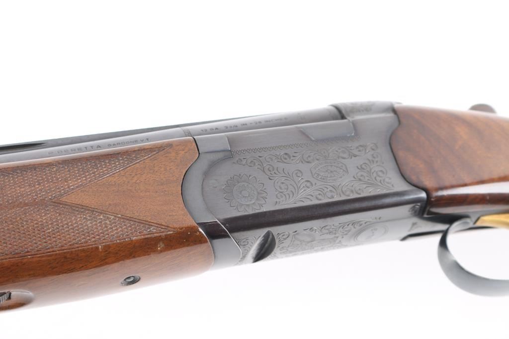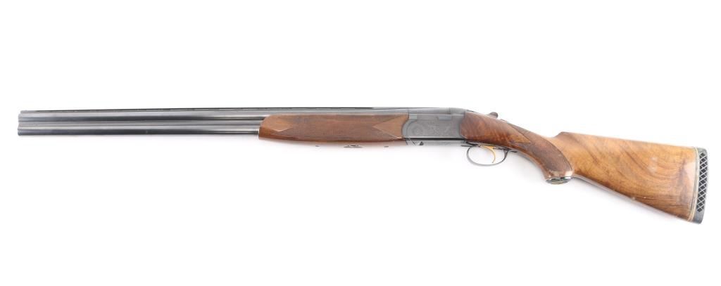 Italian over/under shotgun imported by Garcia, with 1974 date code. Features high polish blued & engraved receiver, blued barrels, top lever, tang safety with barrel selector, single inertial trigger, choked Full/Mod, accepts 2-3/4" shells, extractor, 28" vent rib barrels, steel front bead, small white polymer mid bead, 14-1/8" LoP (13-1/8" to end of wood), ventilated rubber recoil pad, pistol grip stock with factory logo grip cap, checkered walnut stocks. Floral scroll engraving on all sides of receiver, with image of an angel on bottom. Barrels numbered to receiver. Bright bores. Retains 95% or better original blue. Wood shows normal wear and use. Action is tight.