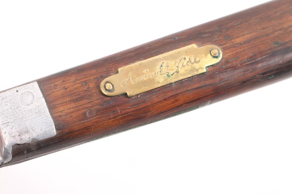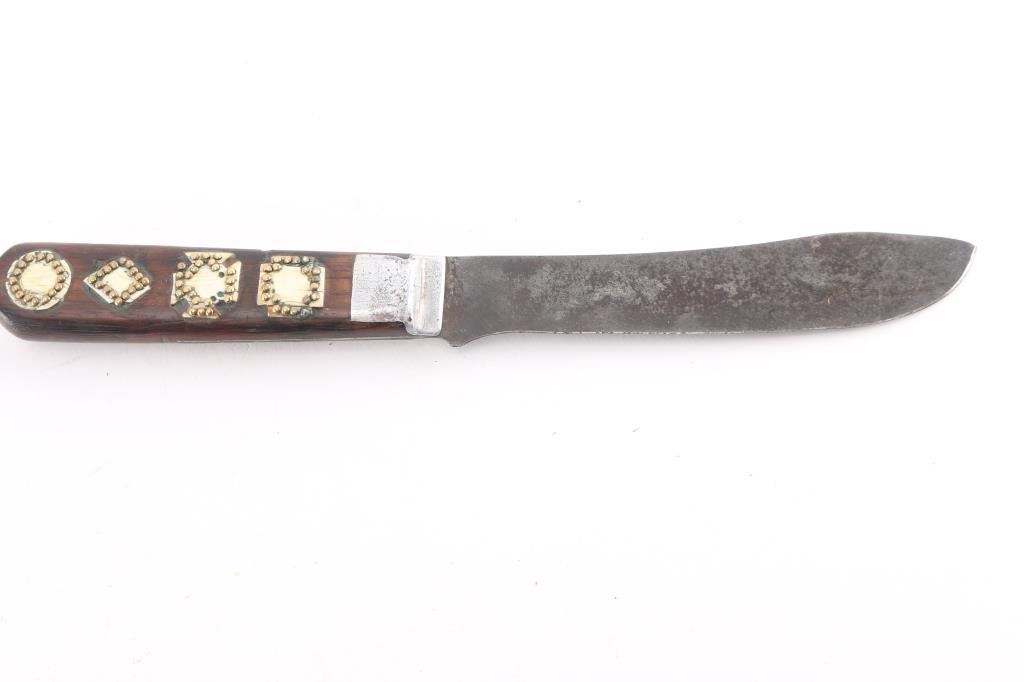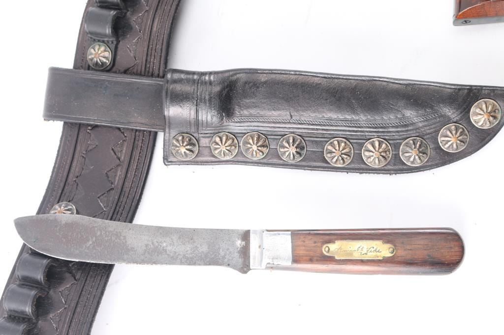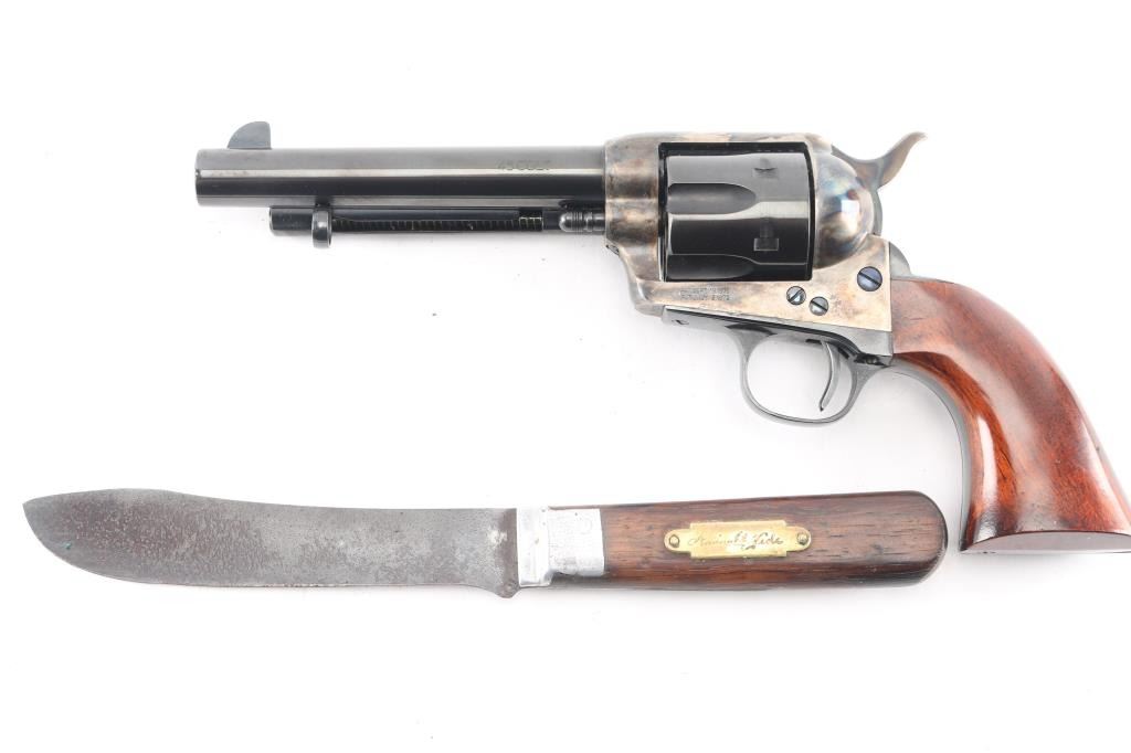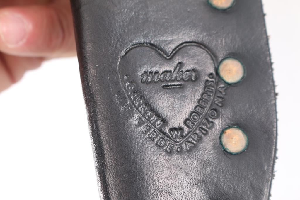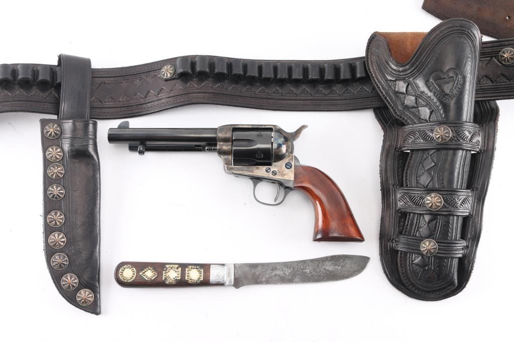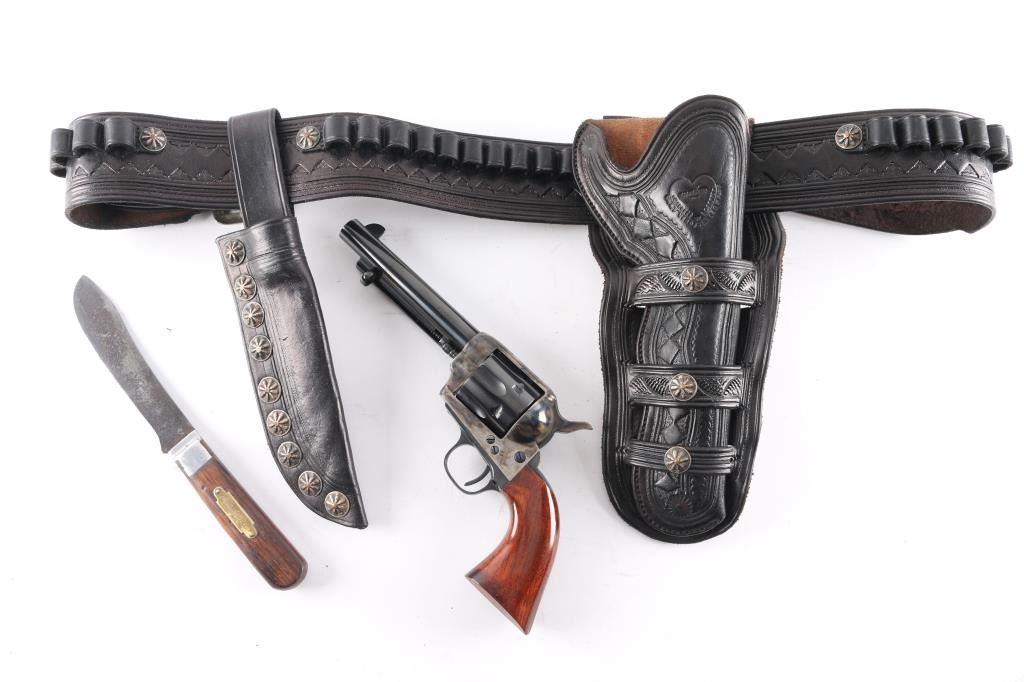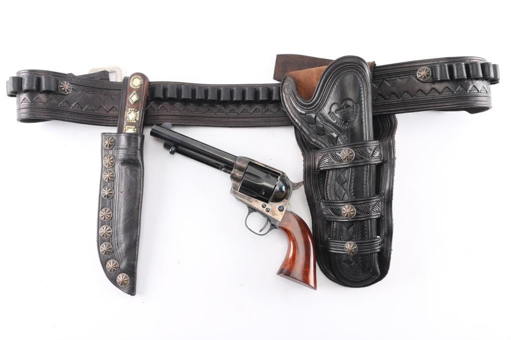 Italian made single action six-shot revolver imported by Cimarron of Fredericksburg, Texas, manufactured 2001. Features blued finish, case colored frame, loading gate, hammer, 5.5" barrel, blade front sight, u-notched rear sight, smooth thin trigger, knurled hammer spur, fluted cylinder, ejector rod, smooth walnut grip. Overall condition is excellent with few signs of handling. Includes a Black leather custom black leather holster rig by Garrett W. Roberts of Camp Verde,Arizona. Consists of hand tooled cartridge belt with set sets of .45 colt loops, two sets of 5, and 1 set of 13 loops with conchos at each end, hand tooled, 3-loop holster with conchos on each loop. and knife sheath with border tooling, and decorated with conchos, it contains a vintage skinning knife, wood handle with cone inserts decorated with small brass tacks. The reverse of handle has a tacked brass plate with what appears to be a name, but can't make it out. All the leather items are stamped with Roberts large heart makers mark. Although the revolver is 5.5", this holster was made for a 7.5" SAA> Size is approx. 34-42.