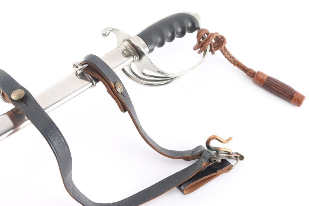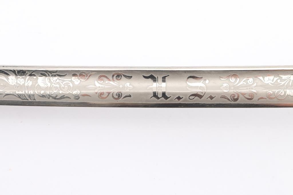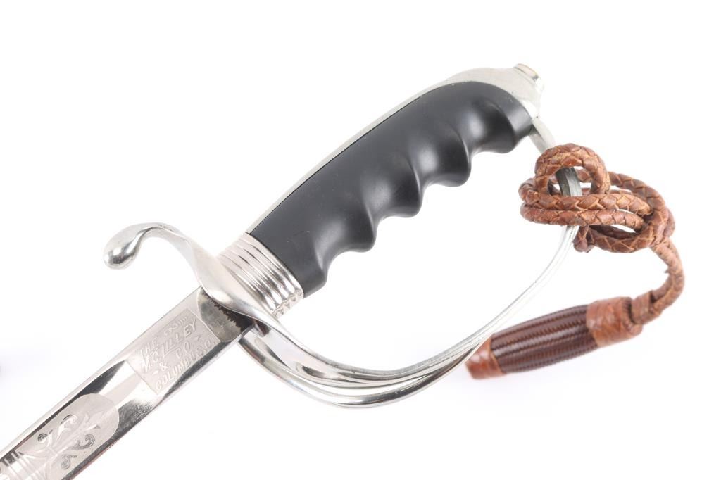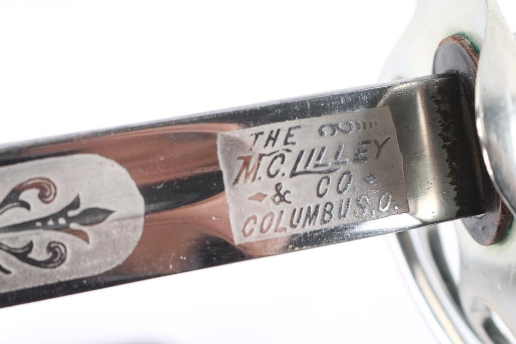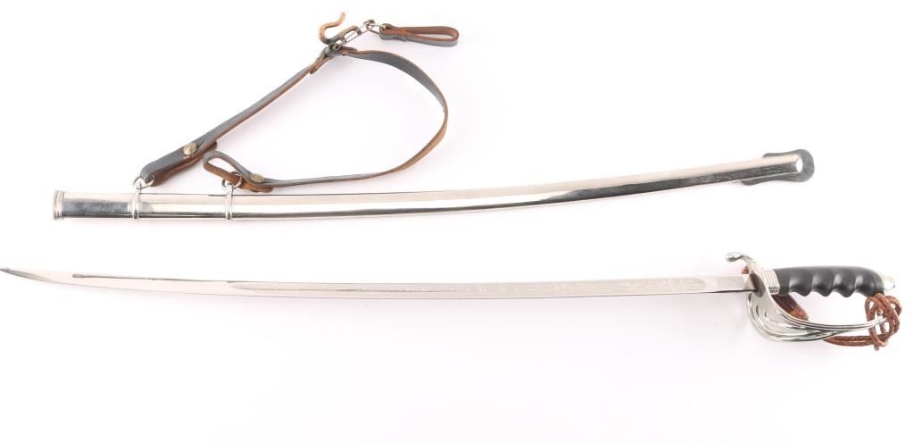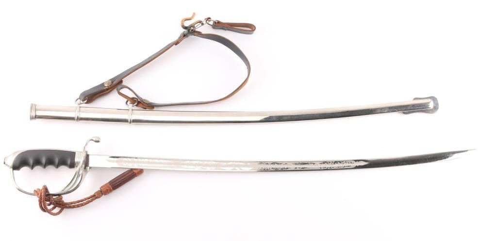 Excellent condition with bright, blade, hilt, and scabbard with no flaking or bubbling to the finish and grip with no chips or cracks.30" slightly curved single-edged blade having a false edge for a distance back from the point and a broad central fuller, with the blade etched in geometric and floral motifs, and a central panel on one side with a “U.S.” in Old English and on the other with a traditional looking spread-winged American eagle and E PLURIBUS UNUM banner scroll beneath.The leather washer is in place under the guard. The reverse ricasso bears the etching maker name, “The M.C. Lilley Co. Columbus. O."This dates the sword to between 1902 and 1925 (It became “The Lilley Co” in 1925). Comes with period brown leather sword knot, and 1941 R.I.A. black leather hangers. Great condition for a 100 year old sword.