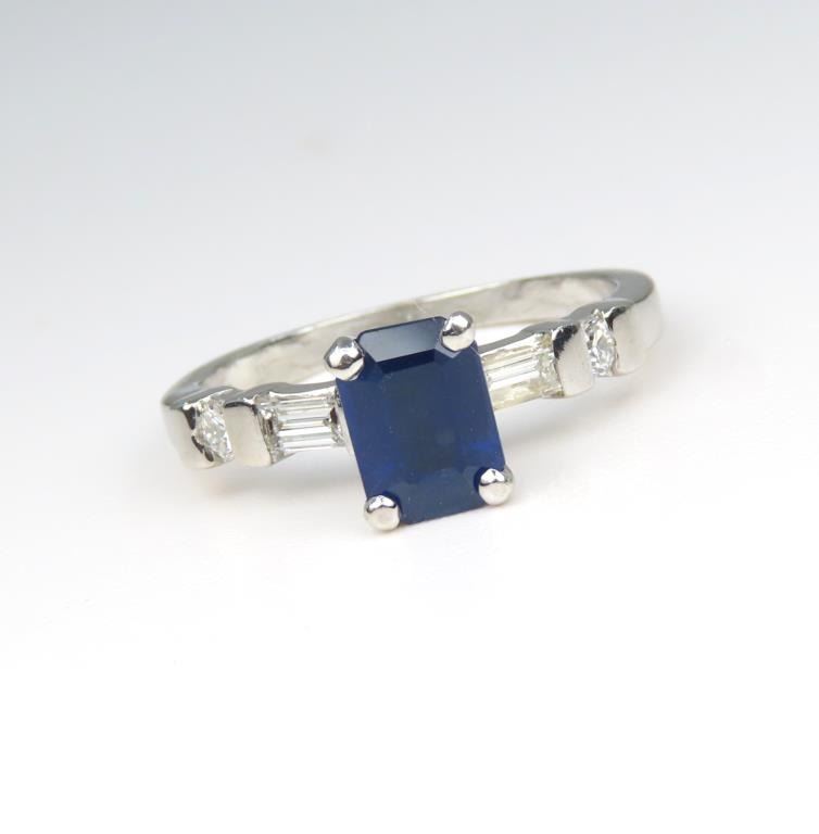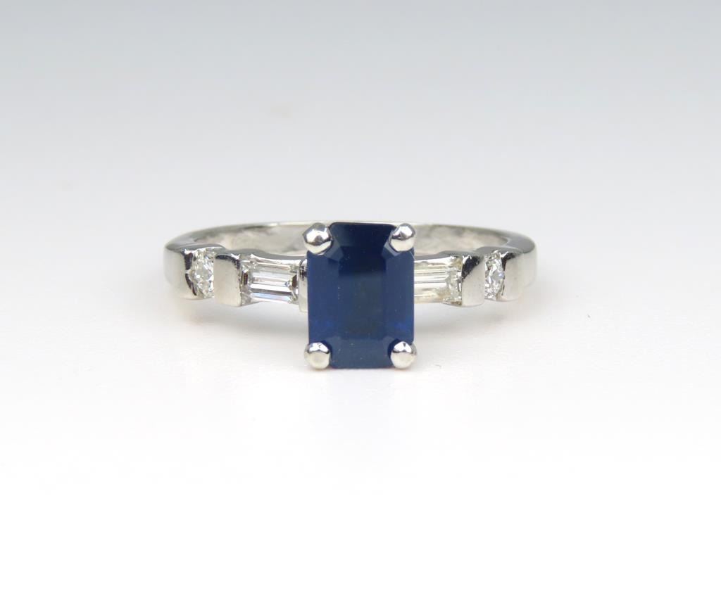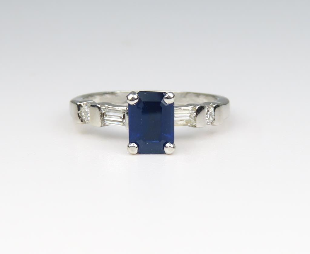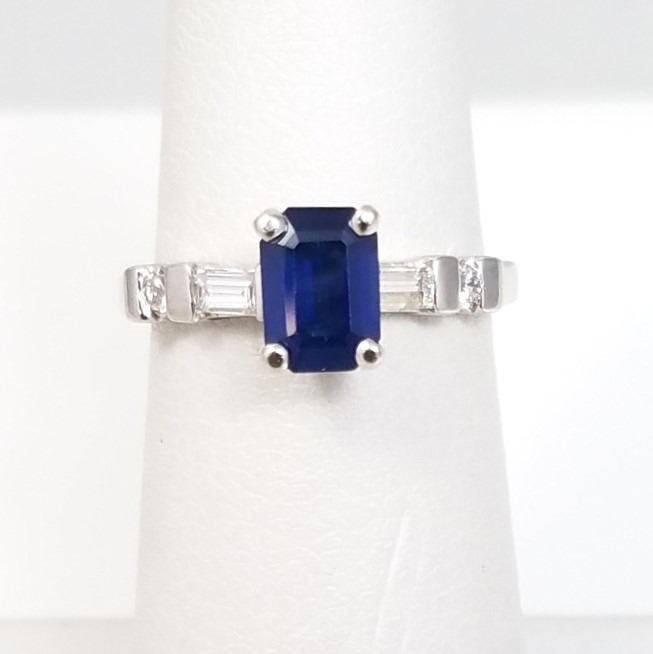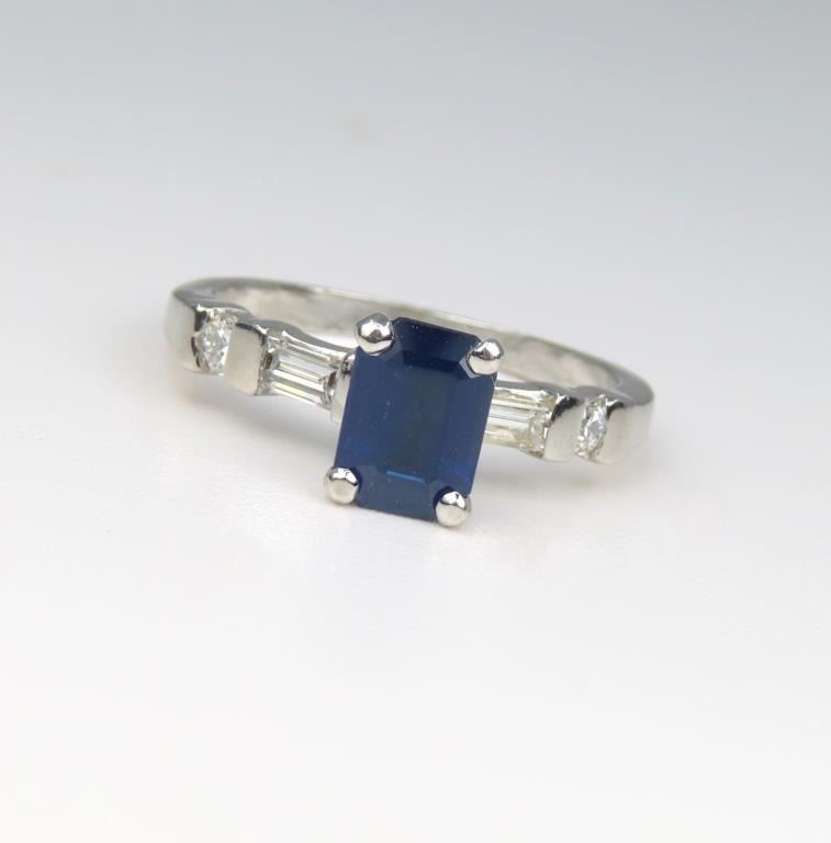 and Diamond Ring featuring an emerald cut Blue Sapphire weighing approx. 1.00 carats accented with 4 emerald and round cut Diamonds with F-G colors and VS clarity set in a classic style Platinum setting, Size 5. Retail $3,000-$4,000