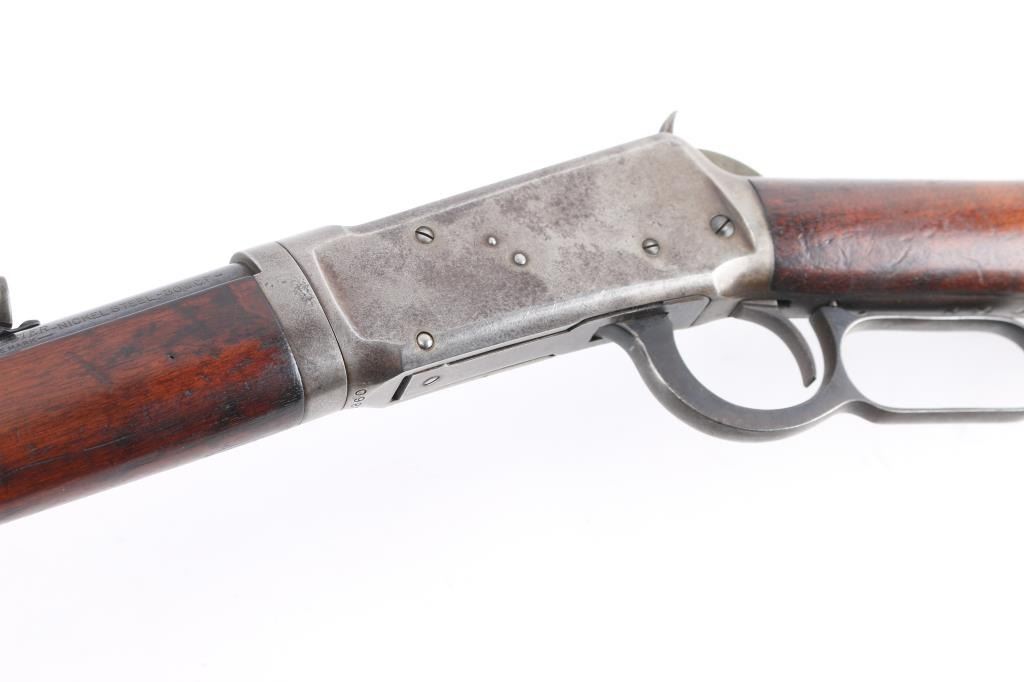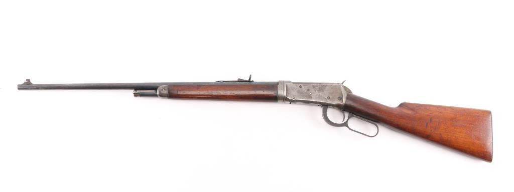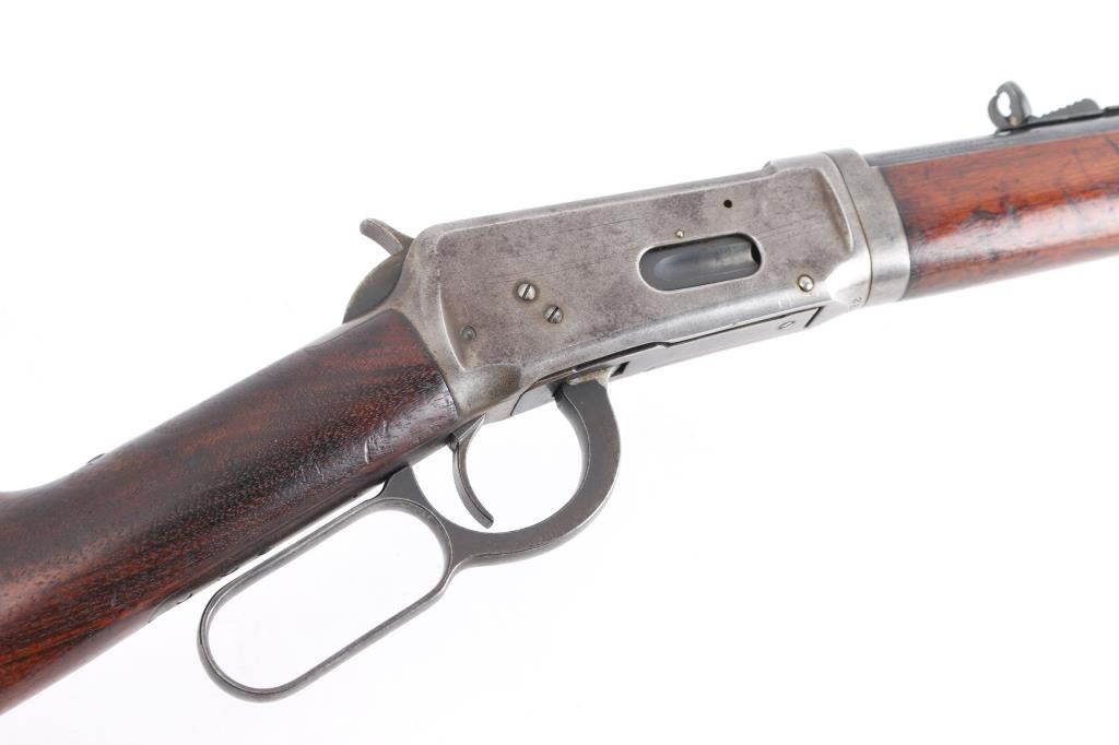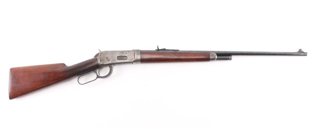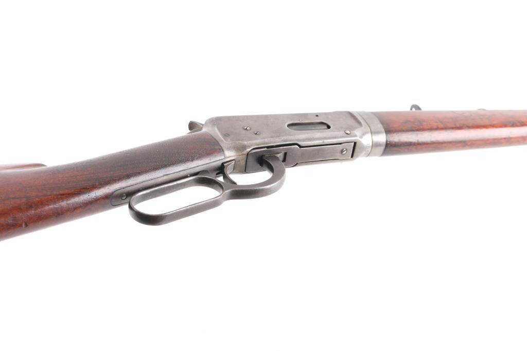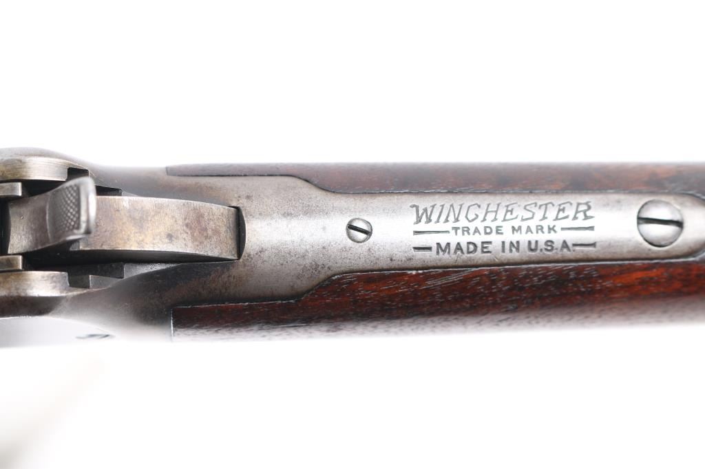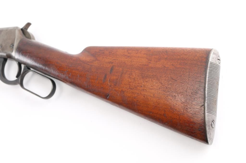 Vintage take-down lever action repeating rifle chambered in .30-30 Winchester. Manufactured in New Haven, CT circa 1926. Features a blued finish, 24.25" round tapered barrel (.562” muzzle diameter), 2/3 length tube magazine, raised front sight base with dovetailed bead top blade sight, King elevation adjustable buckhorn rear sporting sight, smooth curved trigger, knurled hammer spur, grip safety, smooth walnut forearm with metal forend cap and straight grip shoulder stock with serrated steel buttplate & 13 1/8” LOP. Rifle retains approximately 50% original bluing with the frame mostly drifted to grey patina baring some light erosion. The action is tight as is the collar on the take-down receiver, the bore is bright, the markings are sharp and the walnut stocks are good with scratches, dings & mars.