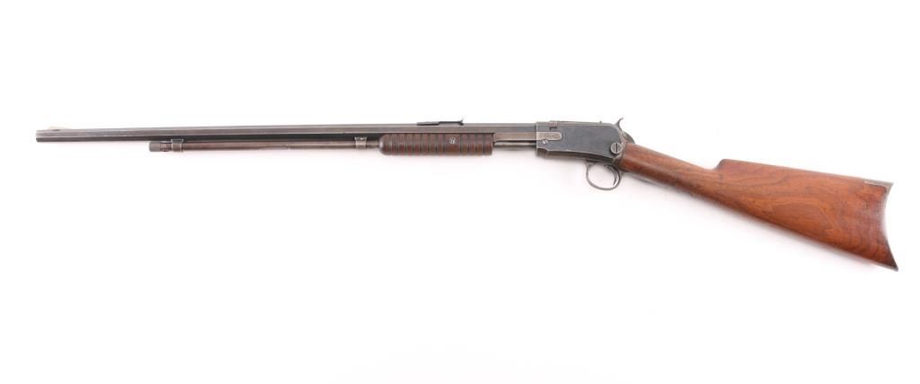Vintage take-down pump action rimfire rifle manufactured circa 1909. Features blued finish, grooved walnut pump handle, smooth walnut shoulder stock with straight grip area, steel crescent buttplate, 24" octagon barrel, blade front sight, adjustable rear sight, 2/3 length magazine tube under barrel, external hammer, take down screw in receiver. Bore is fair, bright overall, some pitting. Retains 60% blued finish, turning brown on mag tube, bolt, rubbed to bare metal on tangs where handled and on moving parts, edge losses, scratches on receiver. Wood is very good condition, varnished, minor scratches/dings. Action is smooth. Markings are sharp.