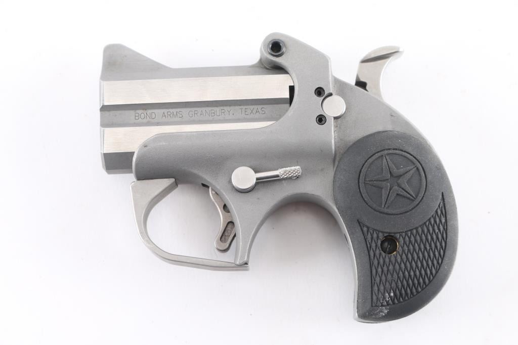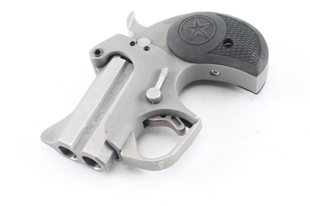 Made in the U.S.A. by Bond Arms out of Granbury, TX. the Cowboy Defender is an over under derringer chambered for .45 Colt ammunition . It features 2.5" stainless barrels and gray parkerized frame, integral sights, spur trigger, serrated hammer spur and two piece black rubber grips with checkering and a Texas Star. Metal finish looks very good. Grips are fine. Bores are excellent. Comes with original factory cardboard box and owners manual.