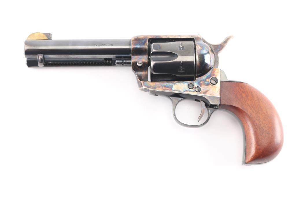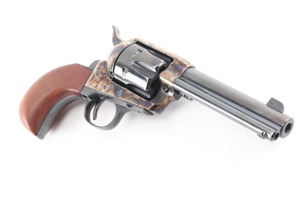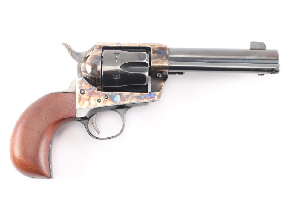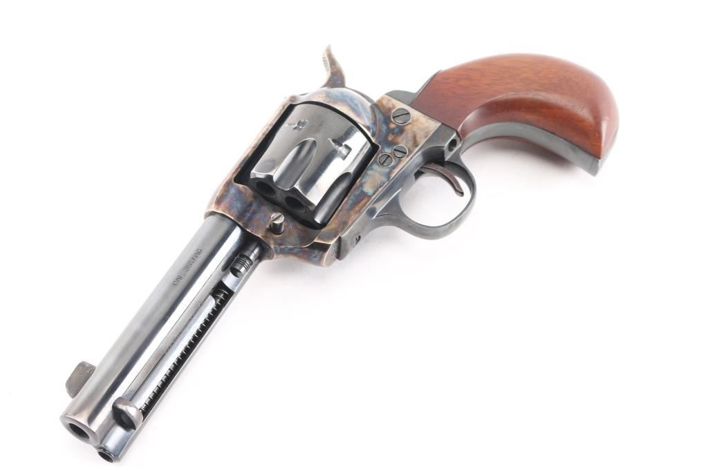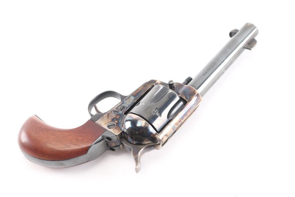 Italian made replica of a Colt1877 Lighting. imported by Legacy Sports Intl. Features single action operation, blued & case color finish, two piece smooth walnut 'Birds Head" grips, 4-3/4" barrel, a piece of rounded copper has been added to the partridge front sight for better visibility, making it a blade, fluted 6 shot cylinder. Bore & charge holes are excellent. Retains 95% finish with minor holster wear on the muzzle, cylinder, and ejector rod housing, cylinder has tracking, & and minor sctraches. Case colors are fiery. Grips are excellent. Smooth action, tight lock up. Comes in matching factory box.