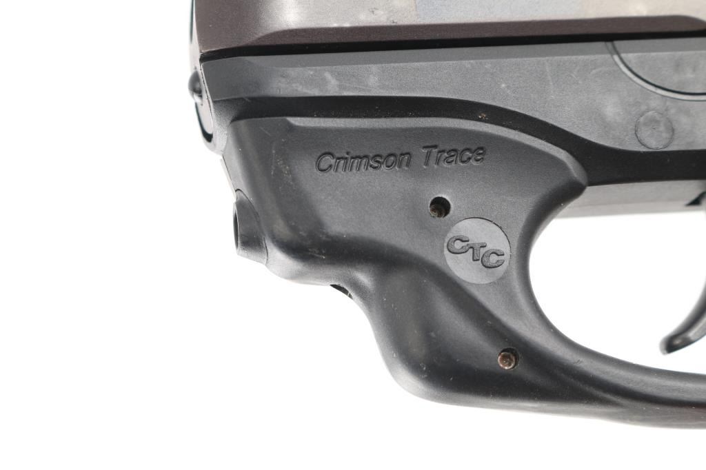 'Lightweight Compact 9mm' Sub-compact double-action-only semi-automatic pistol chambered in 9x19mm, manufactured in Prescott, Arizona. Features a matte blued slide, 3.12" barrel, dovetailed three-dot sights, Crimson Trace laser sight, needs battery, smooth trigger, shrouded hammer, loaded chamber indicator on the top of the slide, manual safety on the left side of the frame, magazine disconnect safety, push bottom magazine release, 7 round factory magazine with finger rest floorplate, and black glass-filled nylon frame with checkered grip. Pistol retains approximately 85% of it's blued finish with handling wear on the slide. Action is smooth, the bore is excellent and polymer is fine.