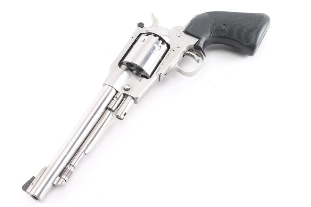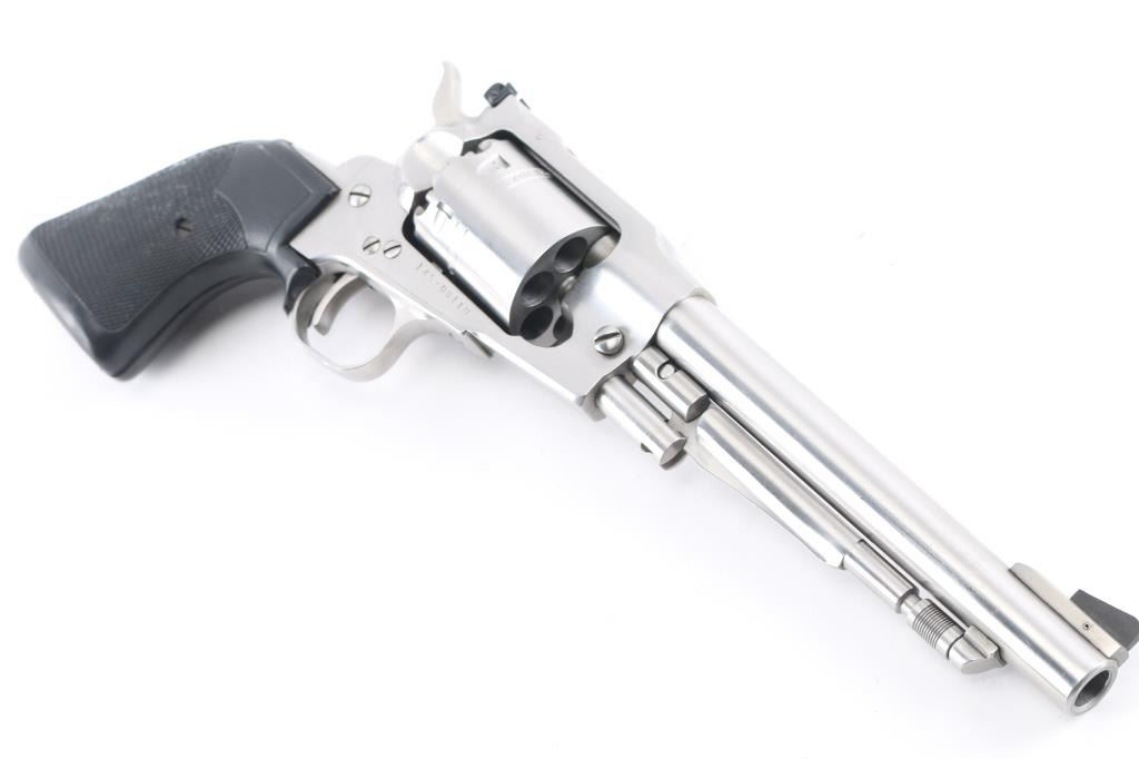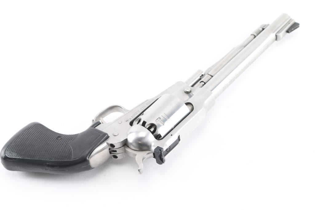 Single action black powder percussion revolver. Features high polished stainless steel construction, 7.5" barrel, loading lever, raised serrated ramp front sight, adjustable rear sight, smooth trigger, serrated hammer spur, non-fluted cylinder with safety stops, three-screw steel frame, two-piece checked rubber Pachmayr grips. Bore and charge holes are pristine, appear unfired. External appearance is very good with few handling marks/minor scratches. Action is smooth with tight lock-up. Includes factory manual.