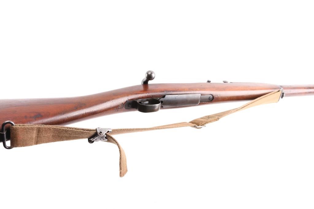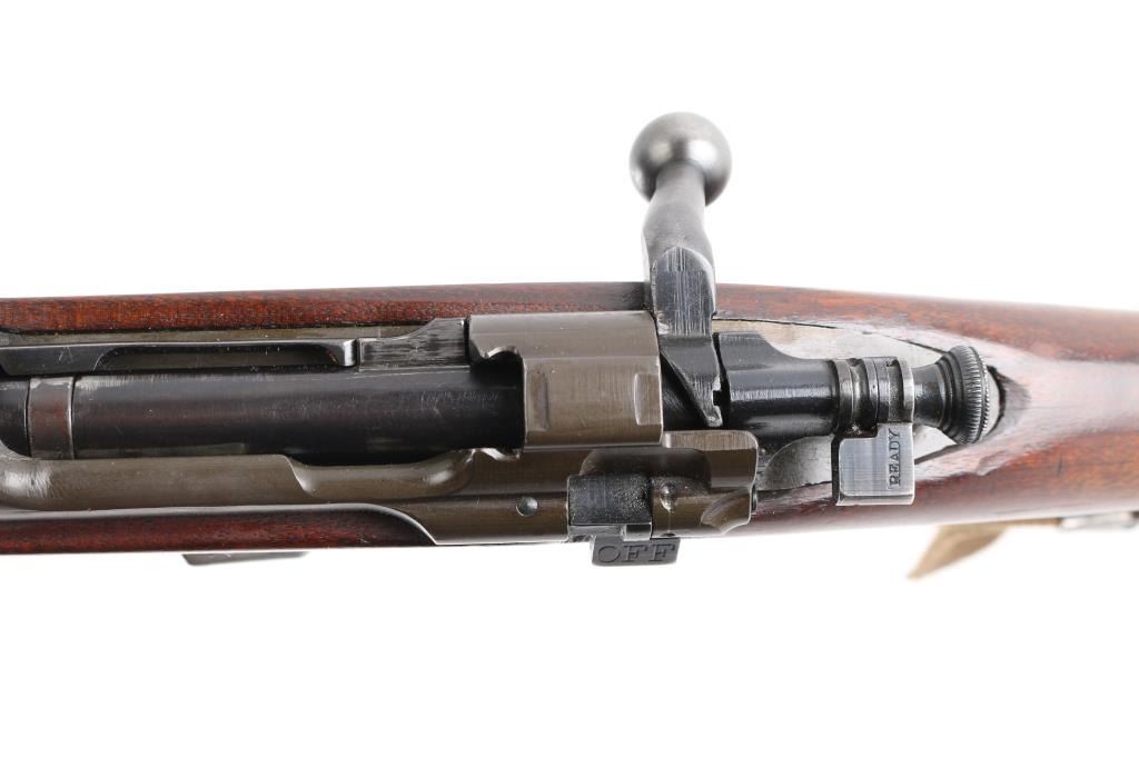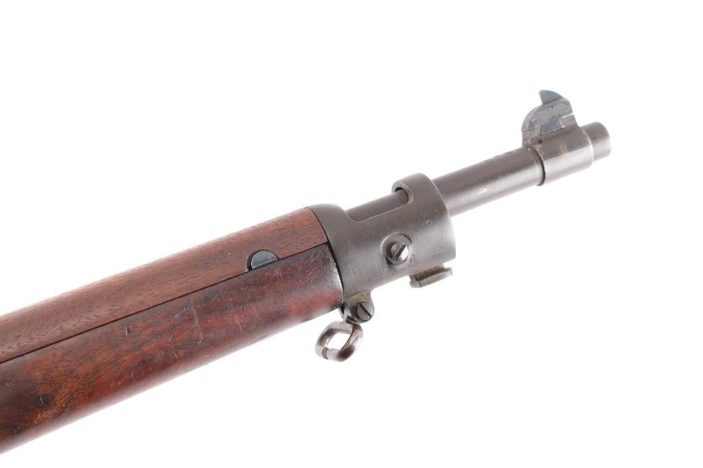 US WWII era military bolt action rifle manufactured circa 1942. Features parkerized finish on most metal, blued bolt assembly and rear sight, walnut shoulder stock with straight wrist, walnut handguard, 24" barrel, blade front sight, ladder type rear sight mounted at rear of barrel, bent bolt handle, manual safety, magazine cut-off switch, sling swivels, stacking swivel, trap door in butt with waffle pattern texture on butt plate. Rear barrel band is stamped, bottom metal is machined. Bore is very good bright condition. Retains 90% finish, with sight edge wear, losses and fading on bottom metal, friction wear on the bolt/extractor. Metal colors vary, barrel and receiver show greenish tint to the dark parkerizing. Stock is very good condition, some shallow gouges & dings. Barrel marked "RA / (flaming bomb) / 12-42". Stock markings include "P" in circle, "FJA", crossed cannon emblem. Comes with fair condition tan color nylon web sling, plastic oiler in butt trap.