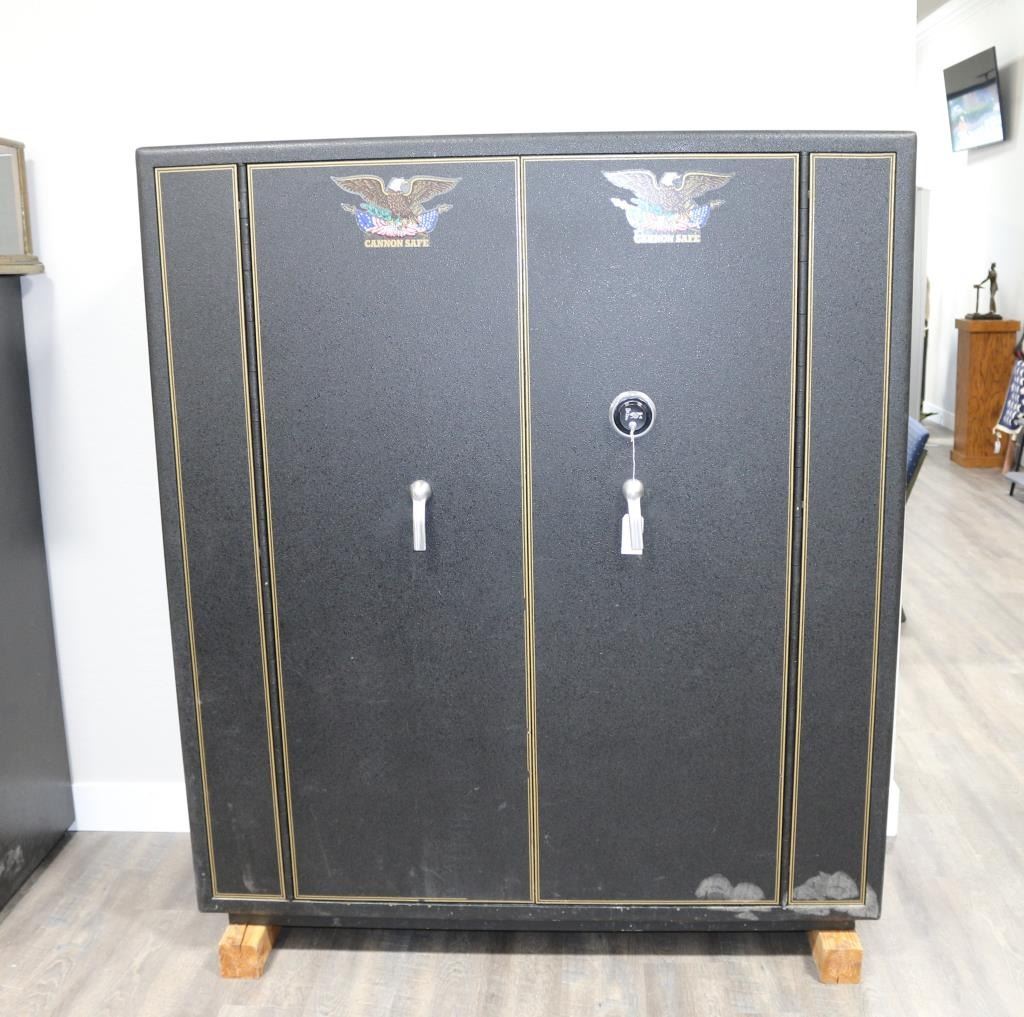 Cannon Safe, Inc. w/ double doors. S/N #010641. Has no shelves. Dimensions: 60" W X 68" H X 25 1/2" Deep. Unknown fire rating. In good condition w/ solid lockup. **Cannot be shipped; buyer must pick up.**