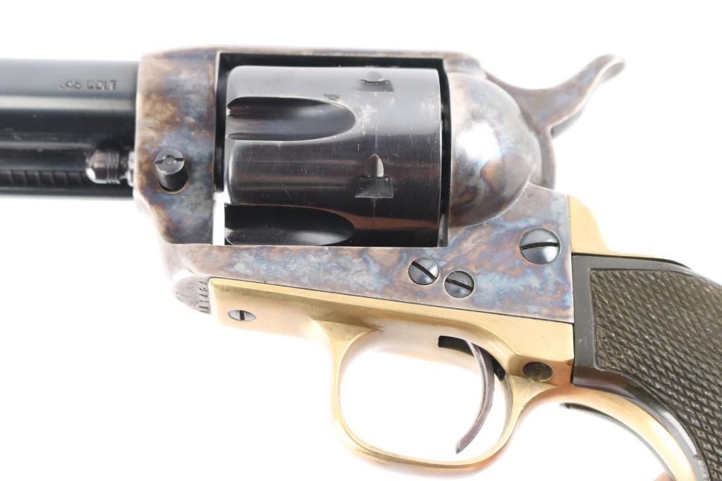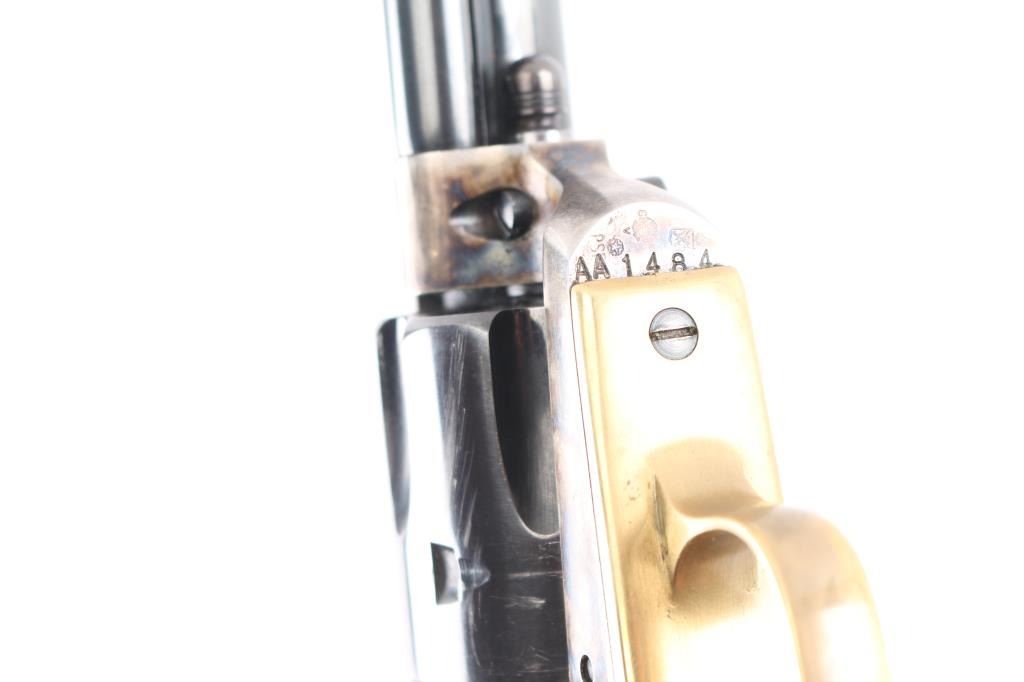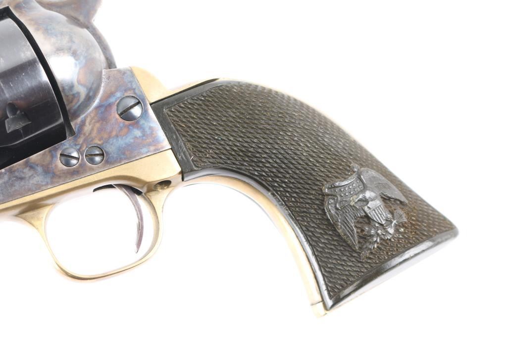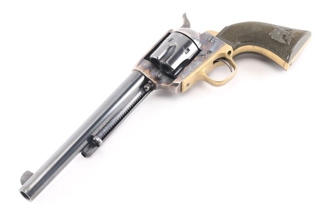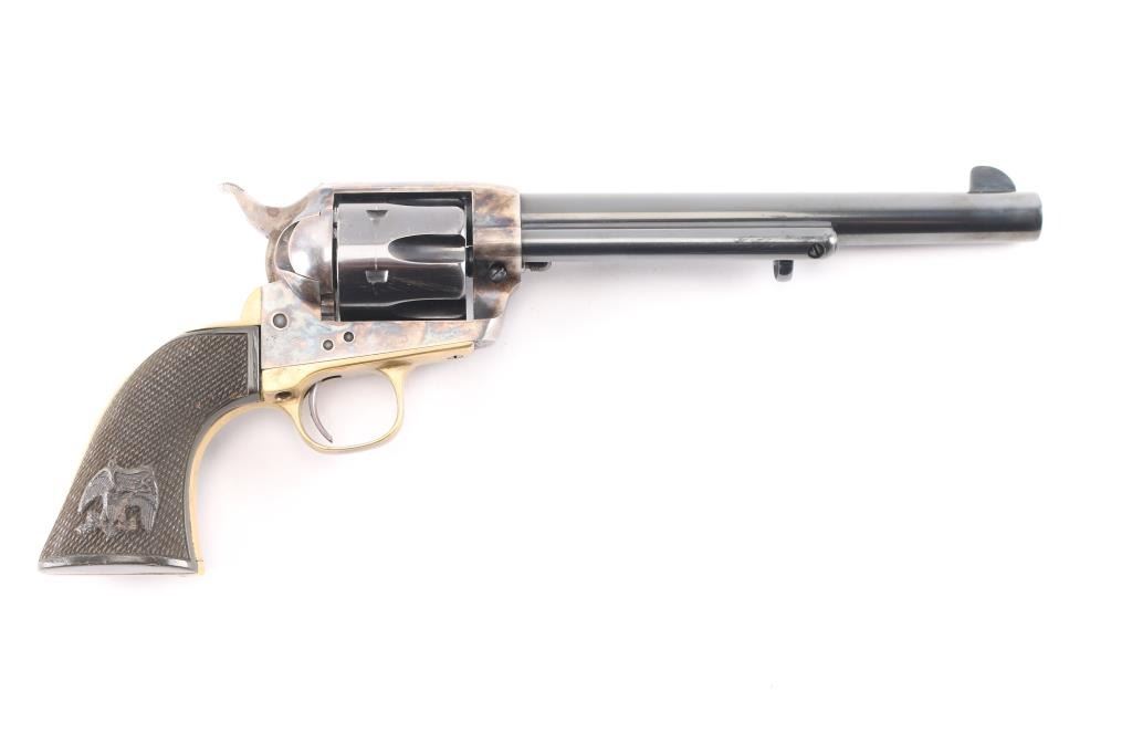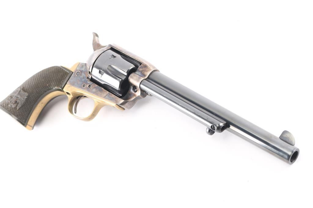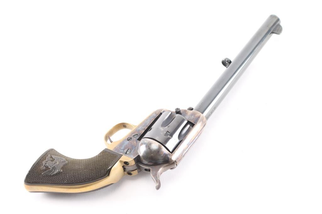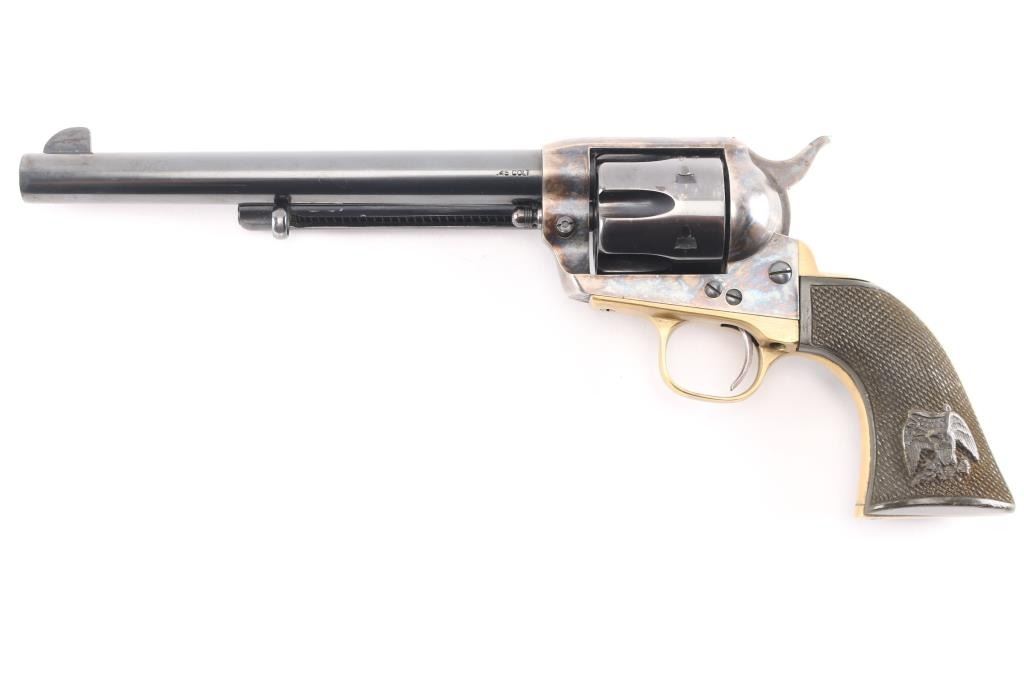 Reproduction of the Colt Single Action Army revolver, chambered in .45 Colt and manufactured in Italy. Imported by American Arms Inc. of North Kansas City, Missouri with the import information stamped on the underside of the barrel. Features a blued & case hardened finish, brass triggerguard, and back strap. 7 1/2" barrel, blade front sight, 'v' notched rear sight, smooth thin trigger, knurled hammer spur, fluted six-shot cylinder, ejector rod, and one-piece checkered wood grips with American eagle motifs. Revolver exhibits approximately 94% of it's original finish showing light holster wear, some minor wear, minor scratches on the barrel. Action is smooth with very good lock-up, the bore is excellent and the grips are very good, very minor scratches.