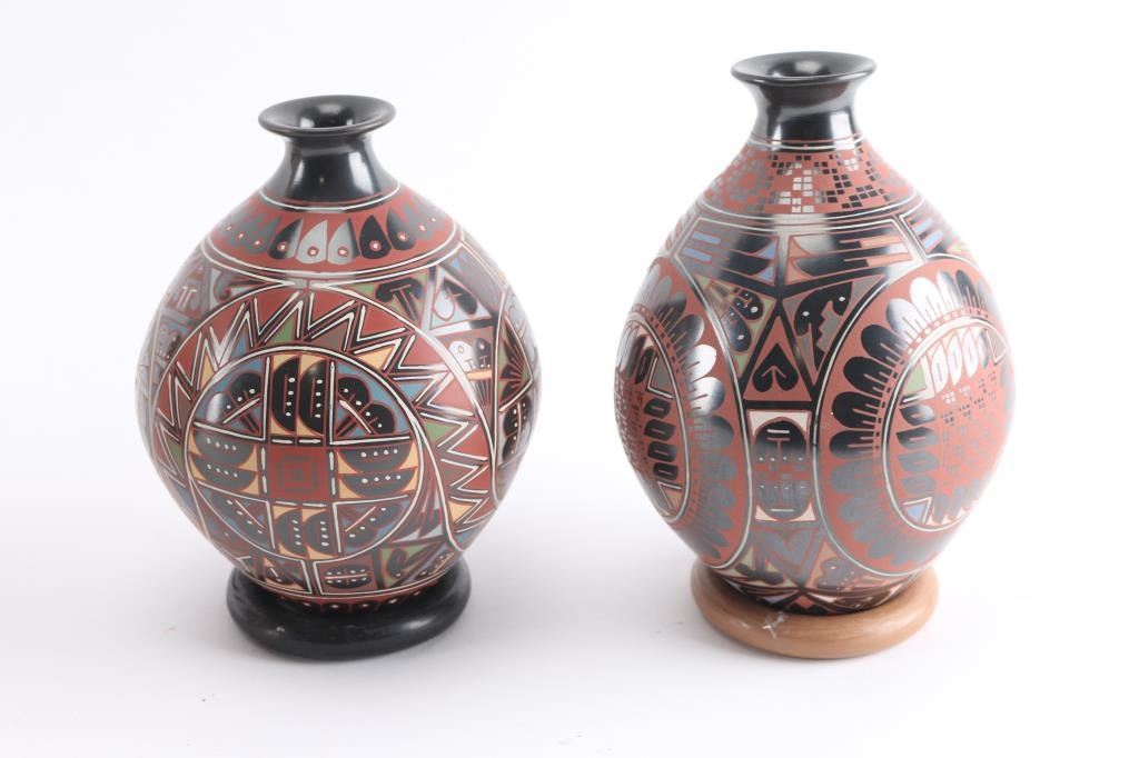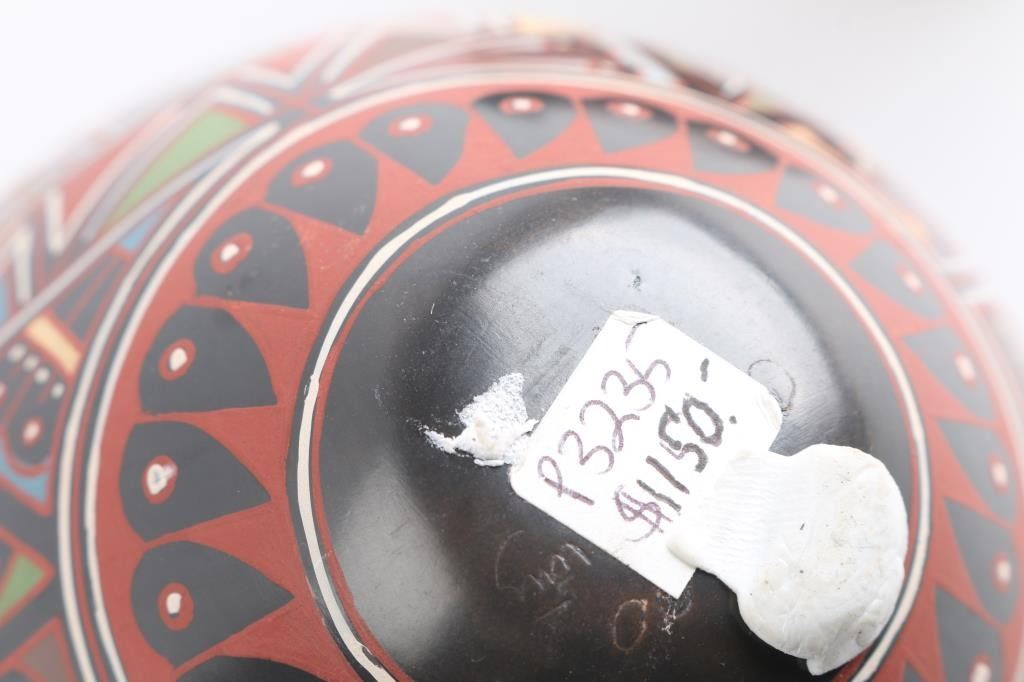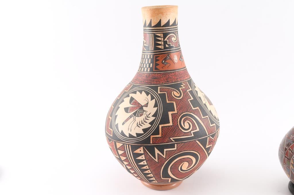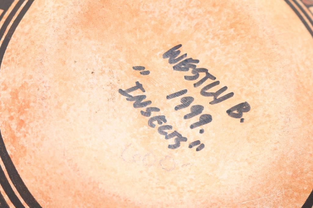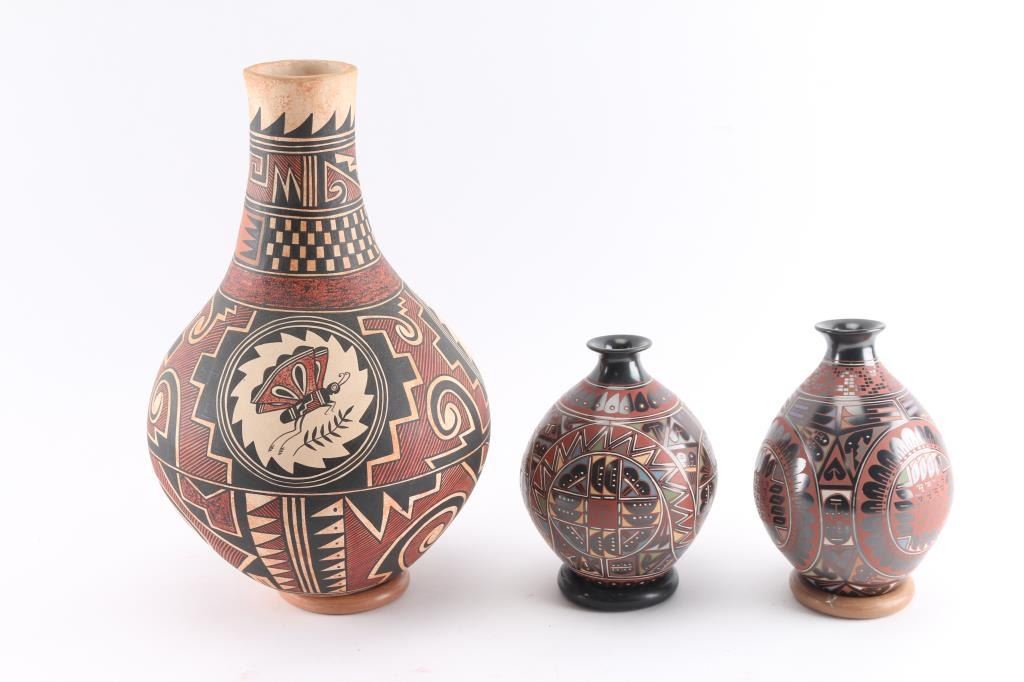 all Native made largest one is signed Westley entitled "Insects" 14"x10", 2 other Ortega marked pots one is 8" other is 7"