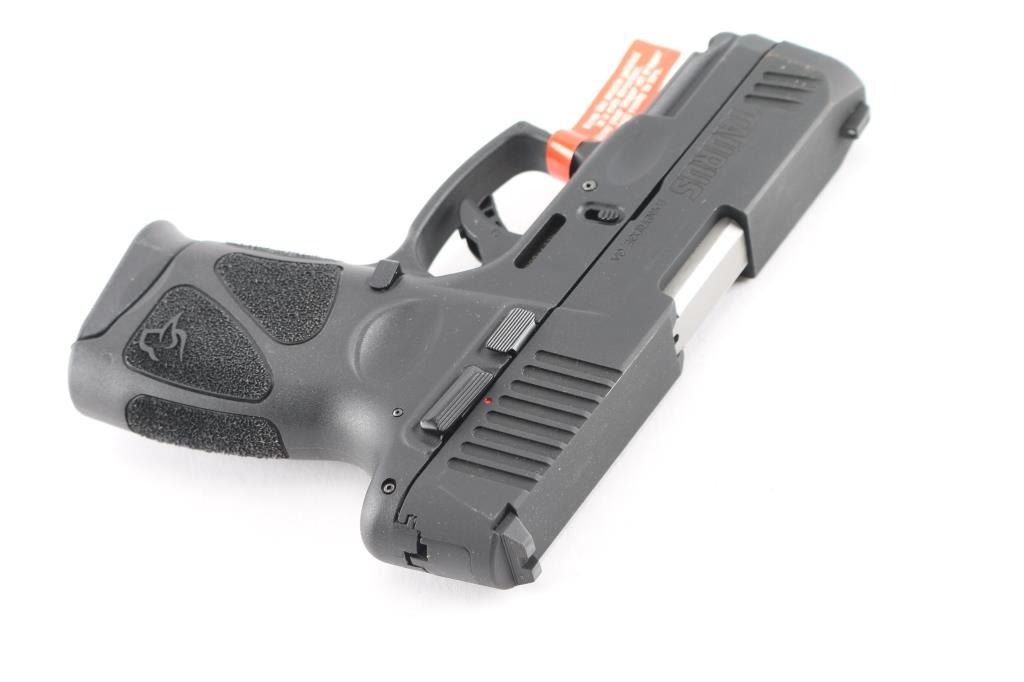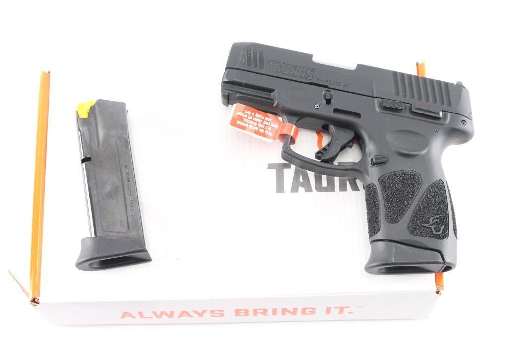 Brazilian made compact semiautomatic pistol. Features matte black finish, textured polymer grip frame with accessory rail, 3.2" barrel, loaded chamber indicator, white dot front & dovetailed rear sights, manual thumb safety, manual trigger safety, push button mag release, double action trigger with re-strike capability, capable of firing with magazine removed. Bore is pristine. Retains 95% finish with minor handling marks, some scuffs to slide. Includes a Taurus box (missing a side panel) & two 12-rd magazines with pinky extensions.