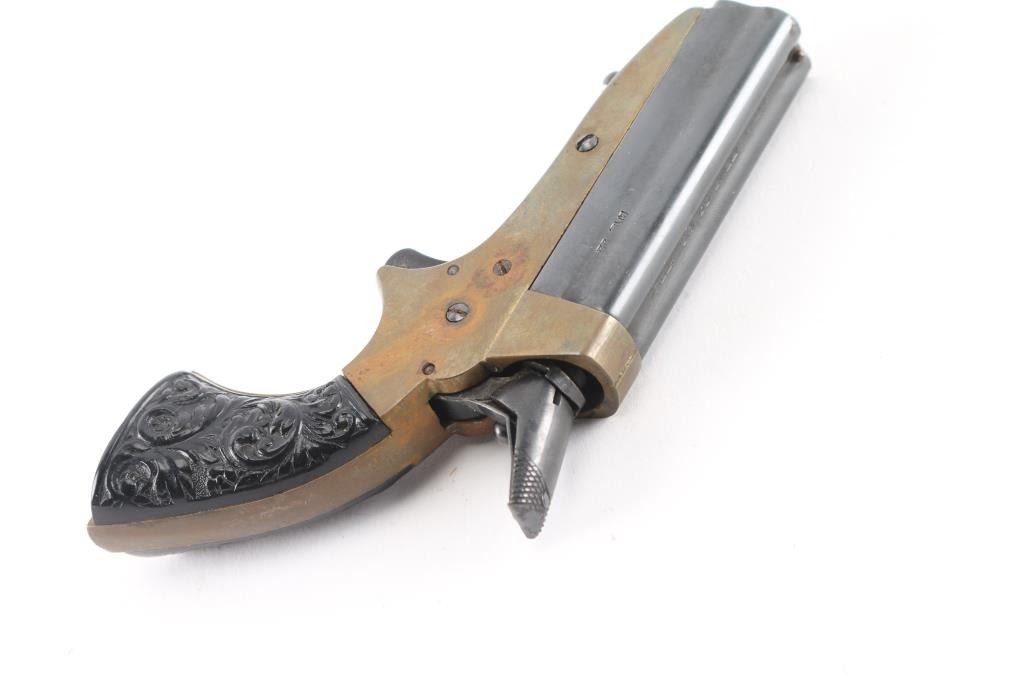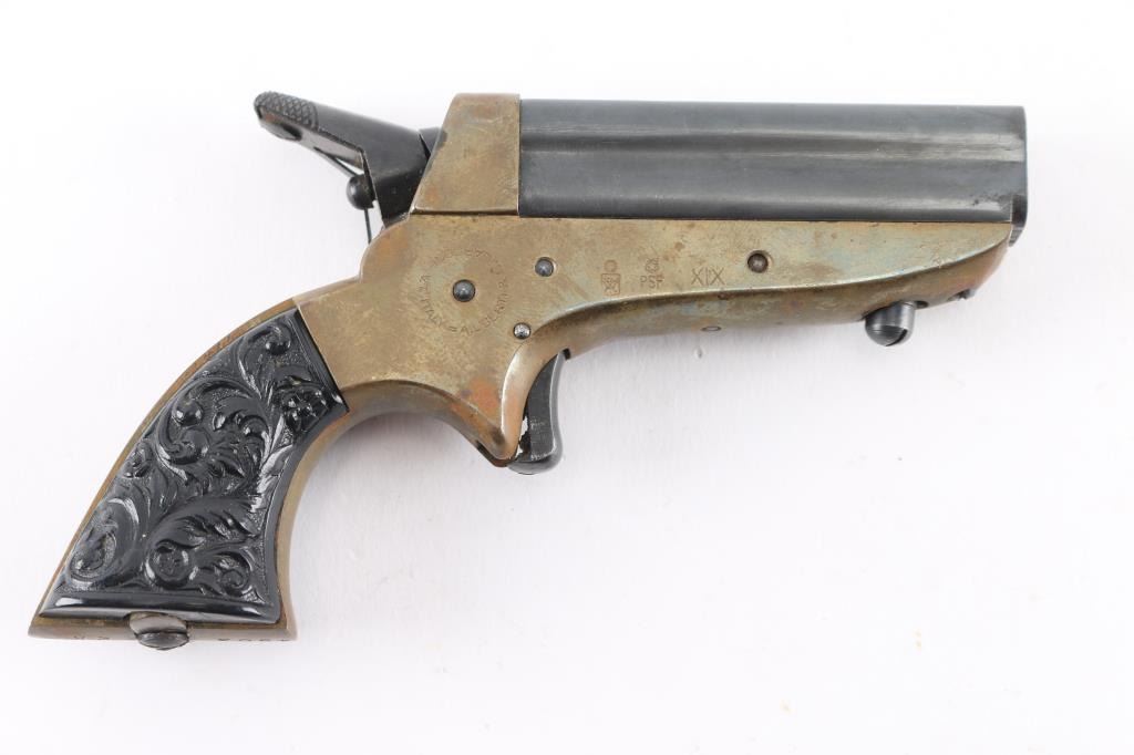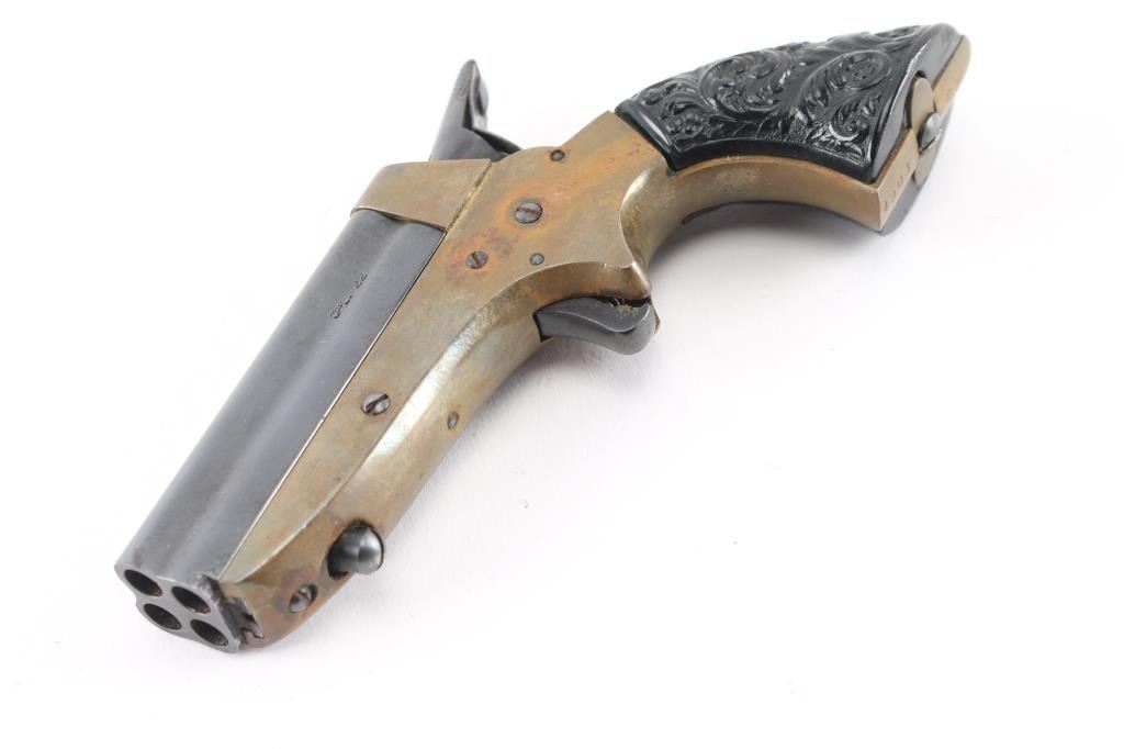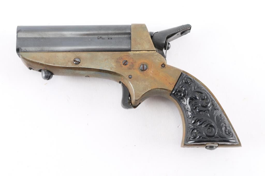 SN: 490325. Italian reproduction of the Sharps four-shot breech-loading pepperbox derringer chambered in .22 caliber. Date code 1963. Does not accept Long Rifle, appears to be for 22 Shorts only. Features blued finish on hammer & trigger, four 2.5" blued barrels, brass bead front sight, 'U' notch rear sight, rotating firing pin on the hammer, smooth spur trigger, brass frame and two-piece "floral scroll" textured black plastic grips. Bores are very good, need cleaning. Retains 90% finish with edge losses. Brass frame shows dark patina color. Grips are very good..