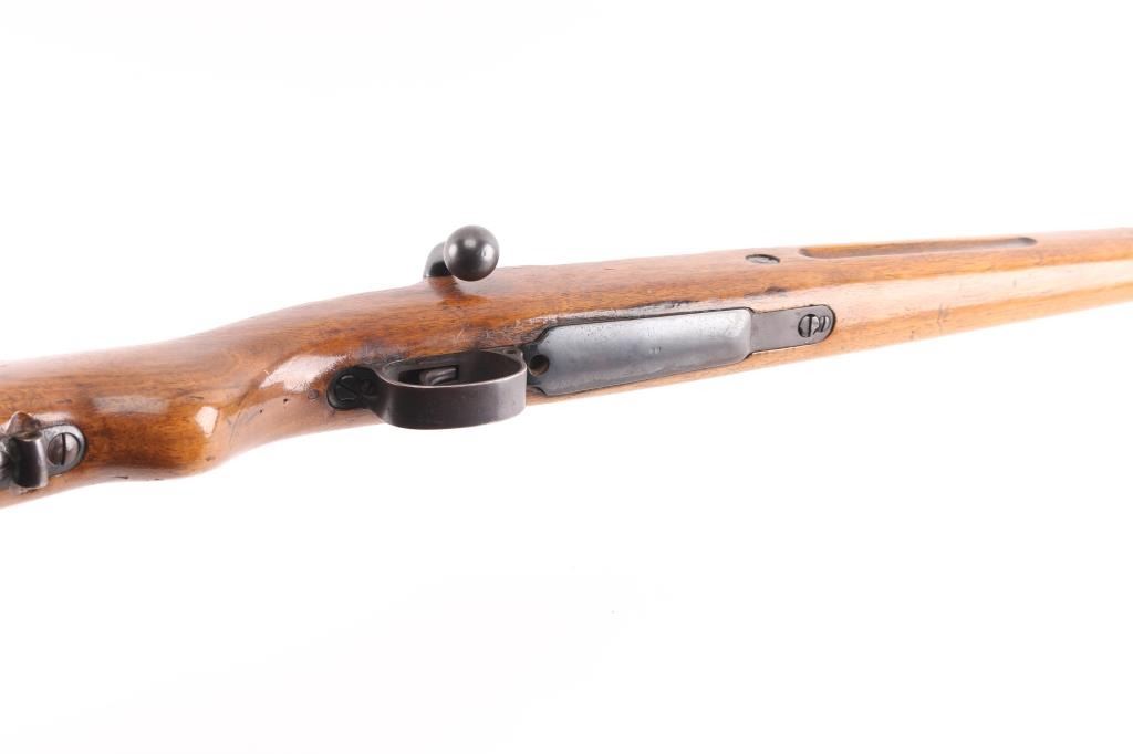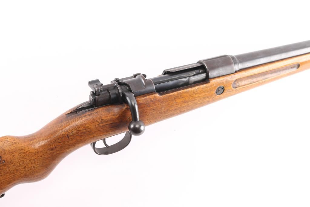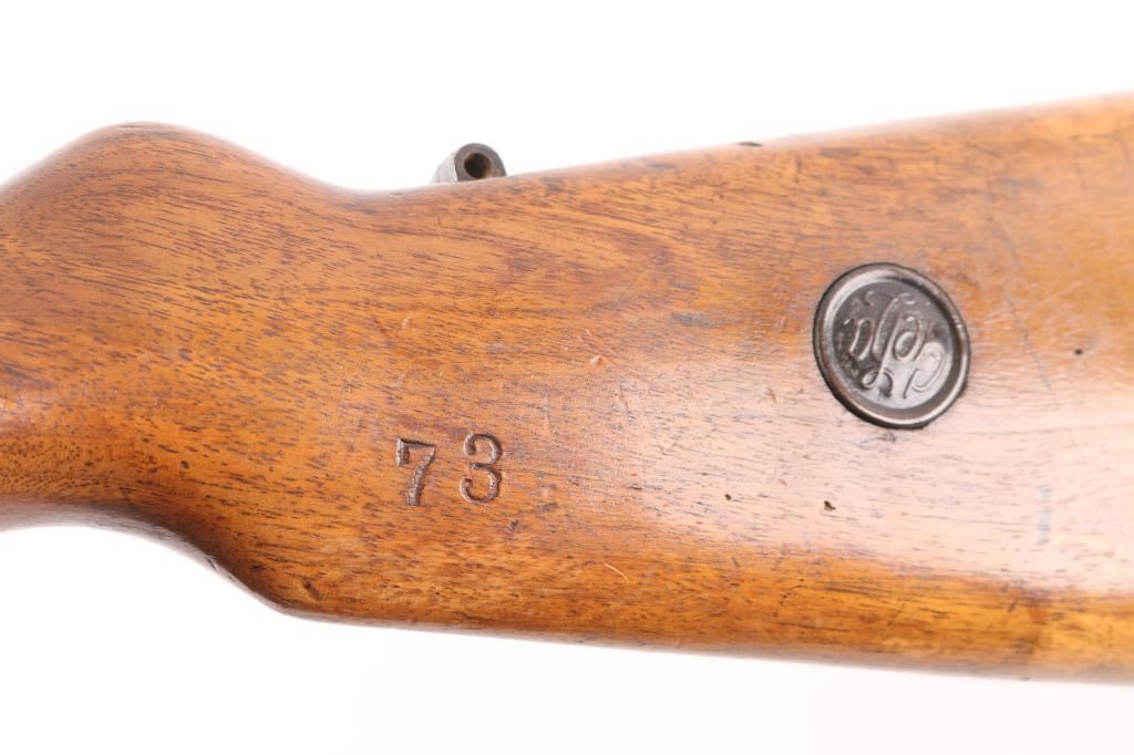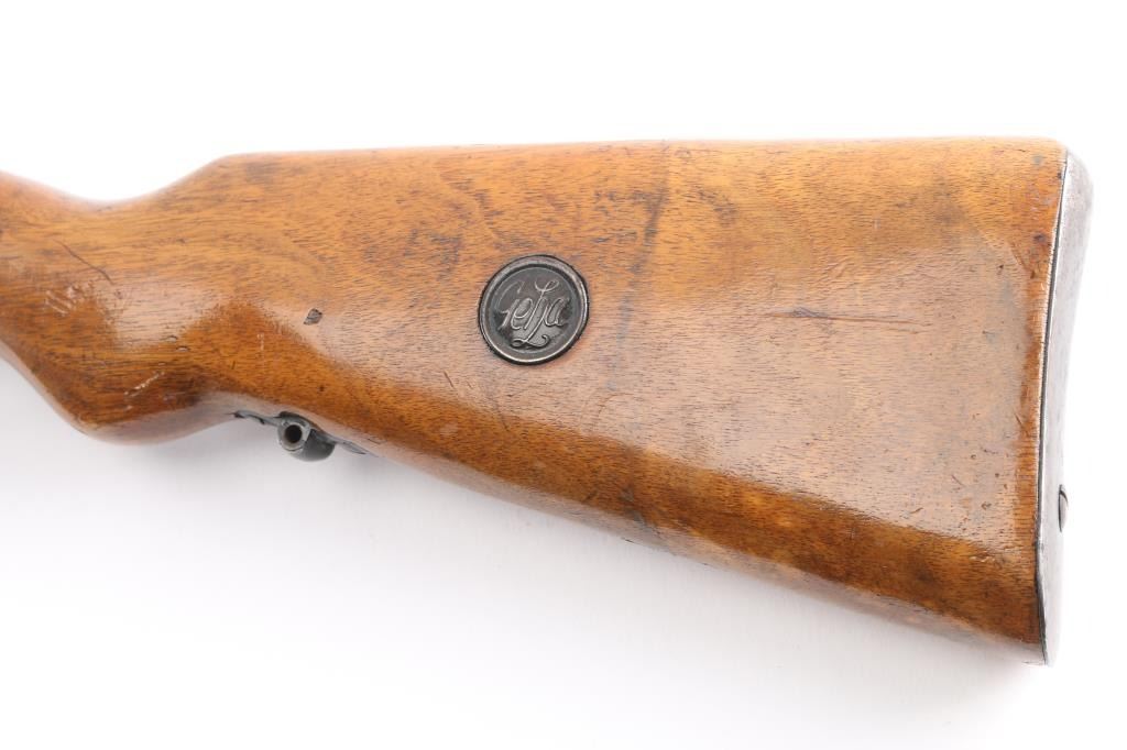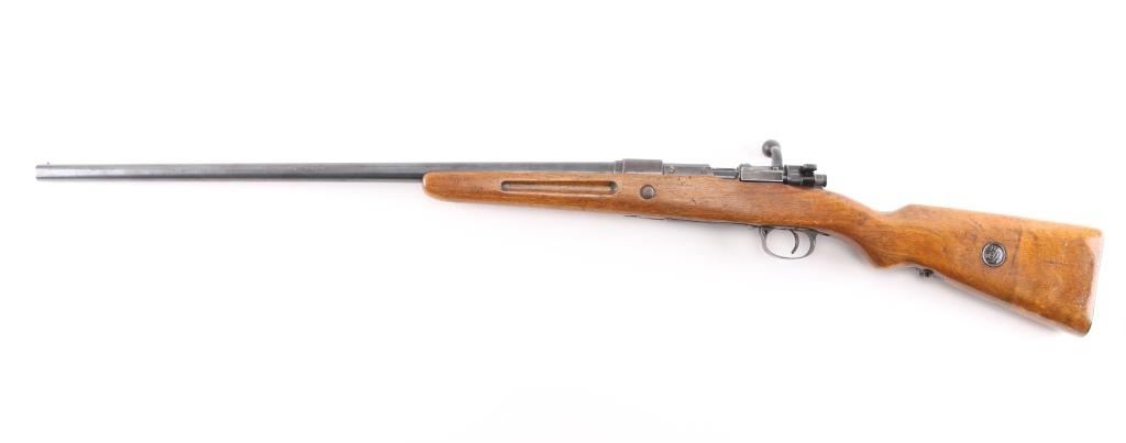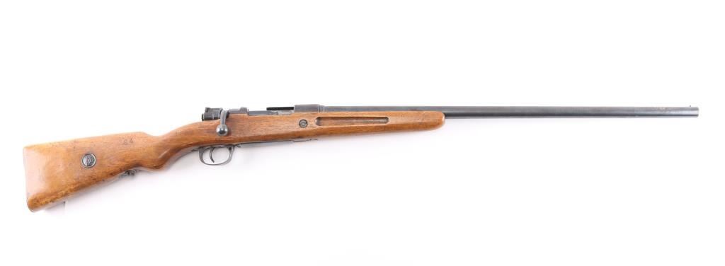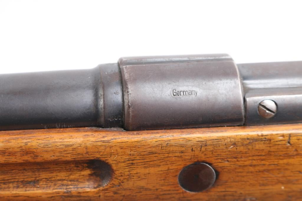 Bolt-action shotgun converted from a military Mauser rifle and stamped "Germany" for the export market. Features blued finish, 27" barrel, bead sight, manual safety. Original military stock has been sporterized, with shortened forend, "GEHA" medallions added to sides of butt stock. Magazine is modified, appears to hold one round. Receiver has an added sheet metal cover to aid in feeding shells from the magazine. Bore is very good. Retains 60% finish, with fading, some thinning, some patina. Wood is good condition.