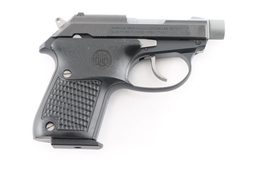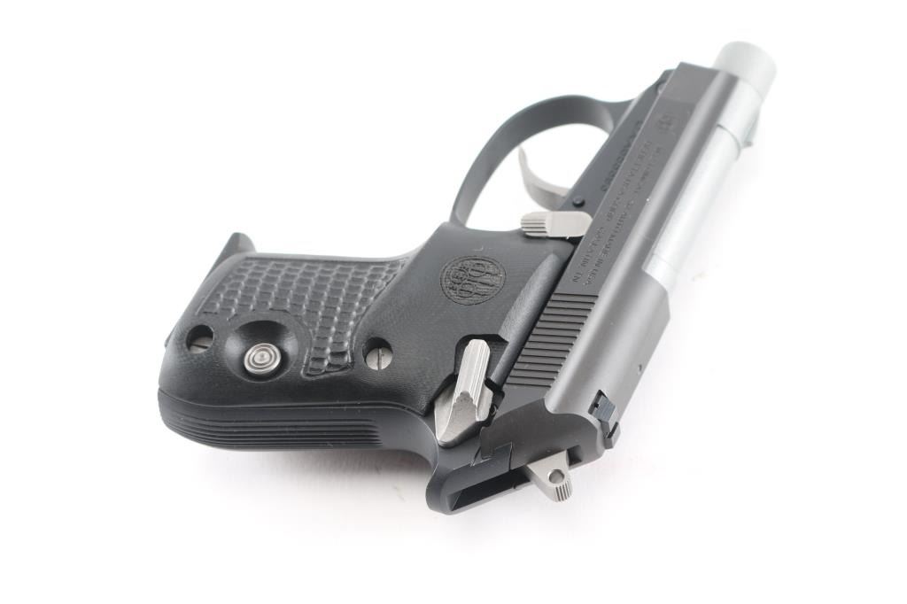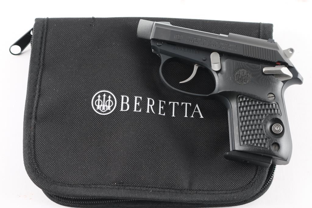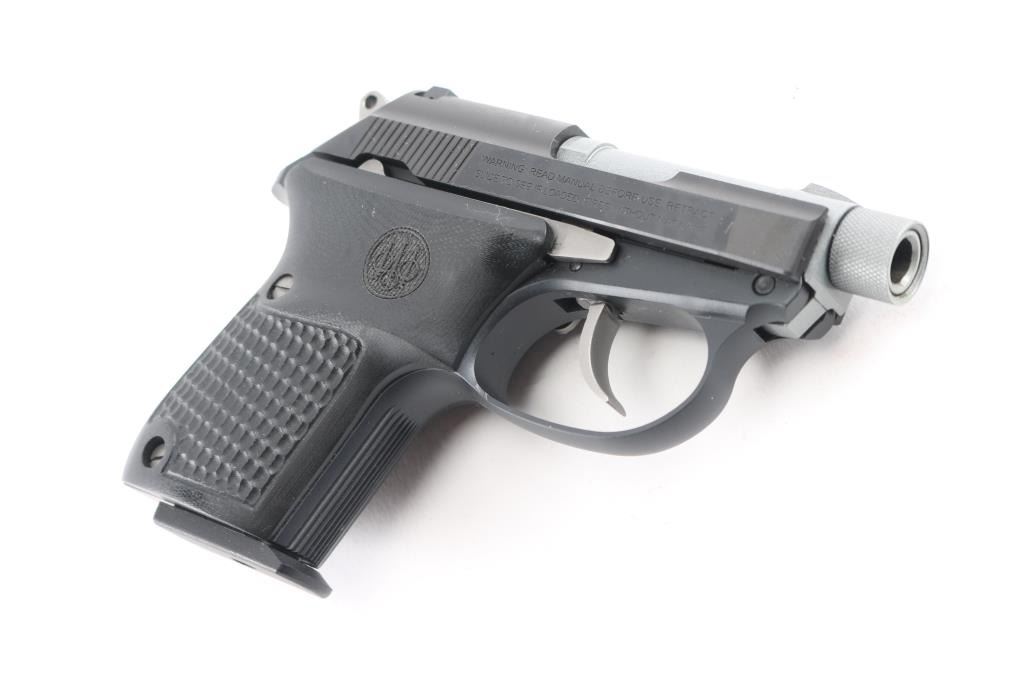 "Tip Up Barrel" double action semiautomatic pistol features 2.75" threaded barrel with protective cap, fixed sights, manual safety, magazine release button left grip towards butt. Two-tone finish with dull gray barrel and controls, matte black frame & slide, textured and contoured black G10 grips with Beretta emblems. Bore is excellent. Overall like new appearance with few signs of handling. Includes factory soft nylon zipper pouch, cardboard box.