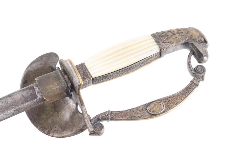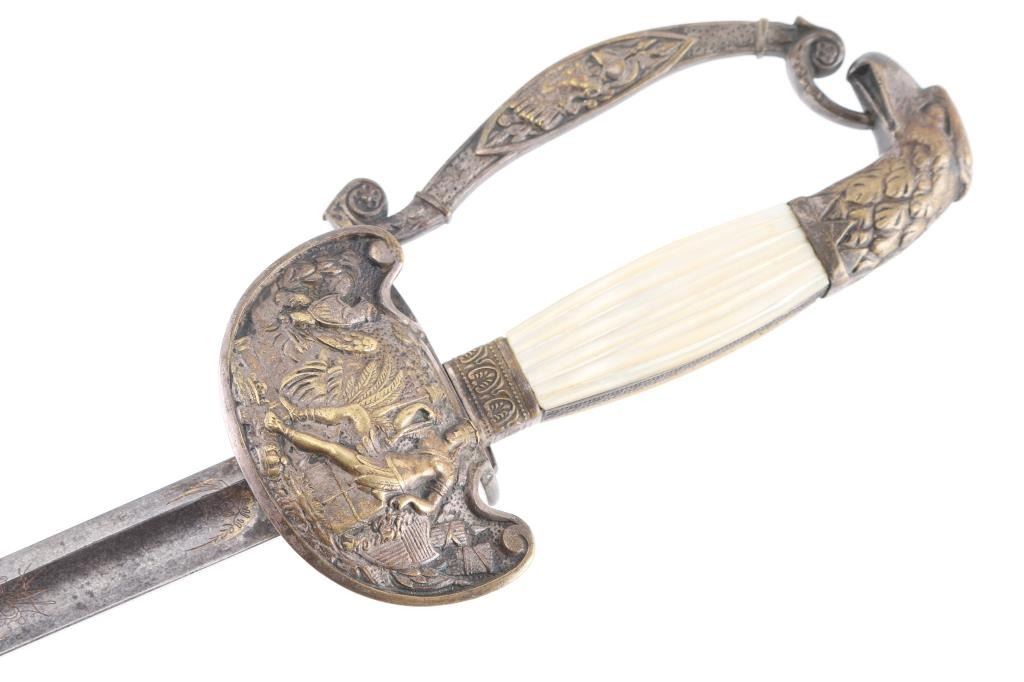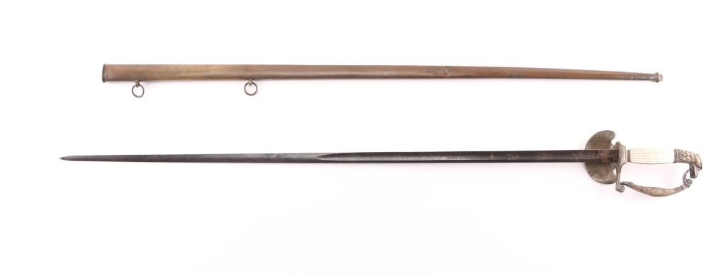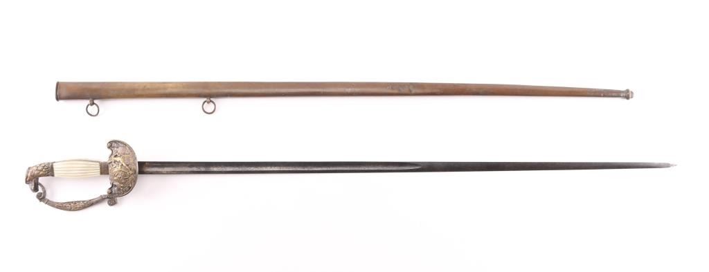 Eagle head sword. 32 1/2" straight, fullered blade. counter-guard an open-wing American Eagle with shield, a seated female in a Ti skirt sitting on a crate with her feet resting on a cannon with two royal crowns, the liberty cap is at the top, the American shield is behind the crate. The single-edge straight blade has traces of original bluing and is decorated with gilt etched designs of floral sprays and military trophies. The grips are two panels of fluted pearl enclosed in a brass strip with a leaf and berry pattern. The pommel is an closed beak eagle's head. The knuckle-bow is in a rococo style with a Greek Warrior on one side and a scaled oval on the other. The all-brass scabbard ends in a fluted finial. Floral motif on the frog stud. The ricasso under the counter-guard is marked what appears to be "B&S", we could not find any reference to this. Blade is age darkened with traces of gilt etching visible. Brass guard is very good. Fluted pearl grips have some minor flaking on both sides. Leather blade washer is gone. Brass scabbard has a minor dent, the throat is loose,and the left grip panel is a little loose. Overall good condition for it's age. Believe this to be a rare configuration as we could not find any matching sword in our research.