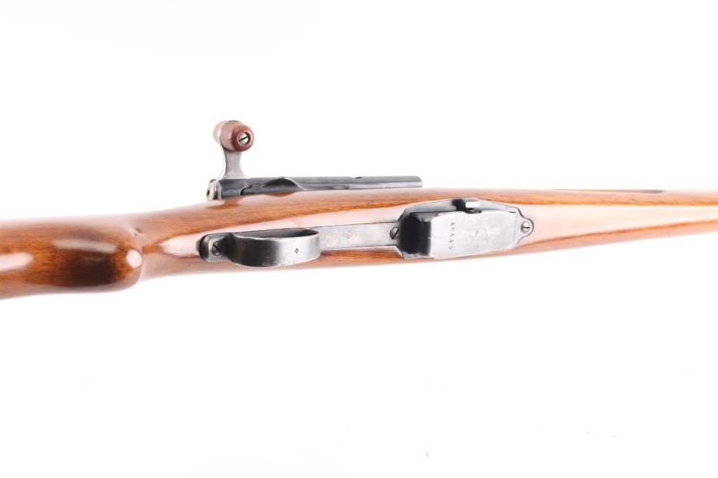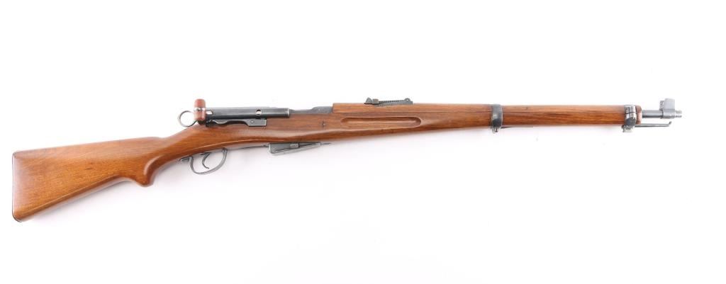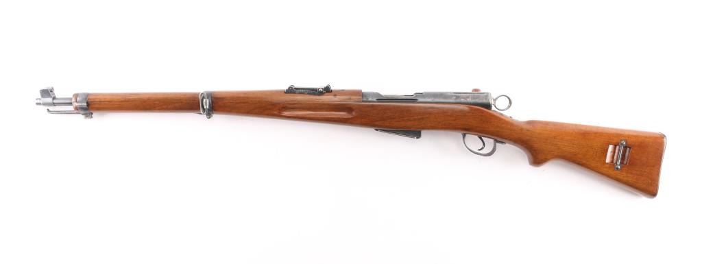 'Schmidt Rubin' 'K-11' Vintage Swiss military straight-pull bolt action service rifle chambered in 7.5×55mm Swiss, manufactured at Eidgenoessische Waffenfabrik, Bern circa 1914-33. No import marks. Features a blued finish, 23.3" barrel with recessed crown, shrouded blade front sight adjustable for windage, tangent rear sight graduated to 1,500 meters, stacking hook, two barrel bands with bayonet lug on the front band & sling swivel on the rear band, red hard rubber "Beer Barrel" charging handle, detachable 6 round magazine, stripper clip guide cuts in the receiver, ring cocking piece/safety on the rear of the bolt, smooth curved trigger, smooth wood handguard and pistol grip shoulder stock with finger grooves in the forend, sling bar on the left side & flat metal buttplate. Serial numbers match on the receiver, bolt, and magazine. Bore is very good. Retains 75% finish, fading and thinning, heavily cleaned at receiver rear, many dings to edged of trigger guard. Wood has been sanded & given a glossy varnish, showing slight erosion around butt, loss of sharp edges on finger grooves.