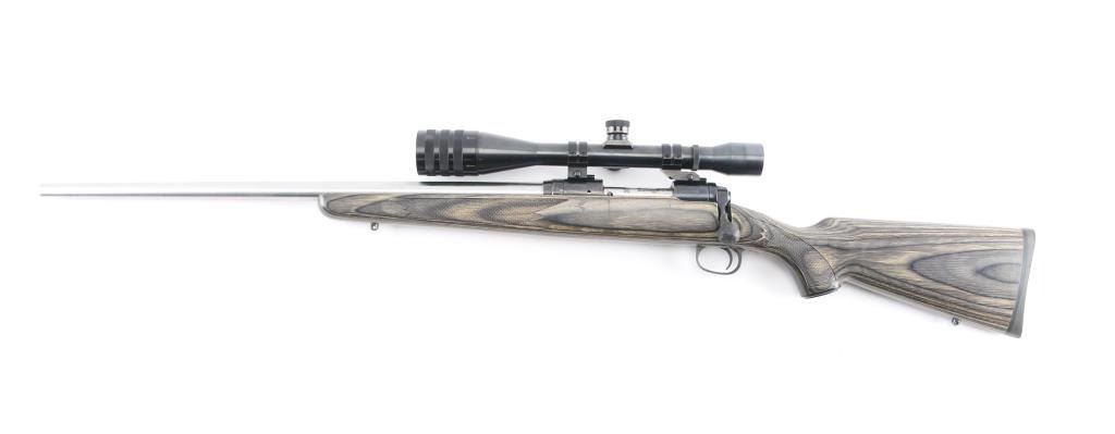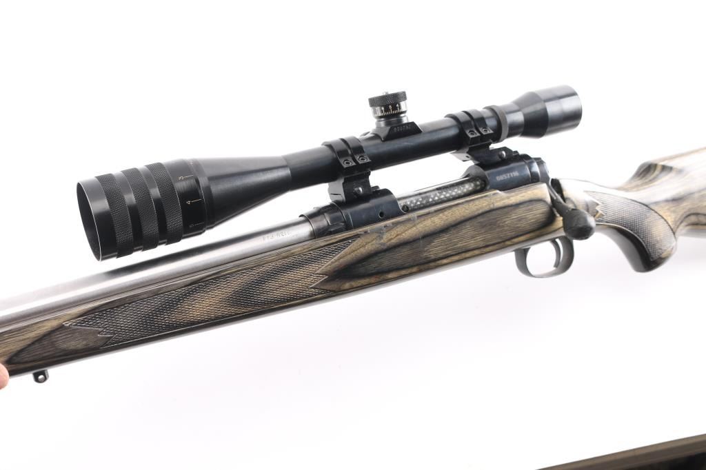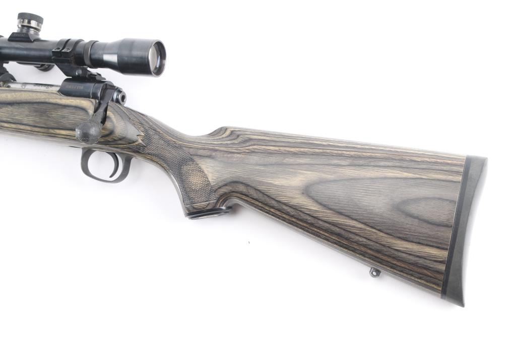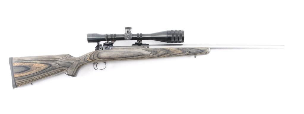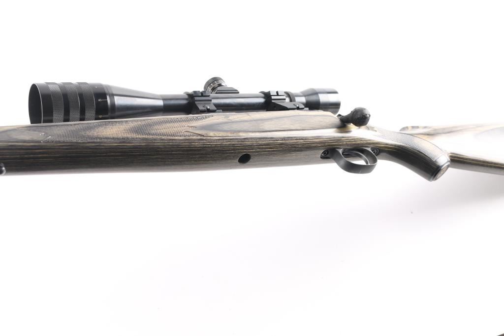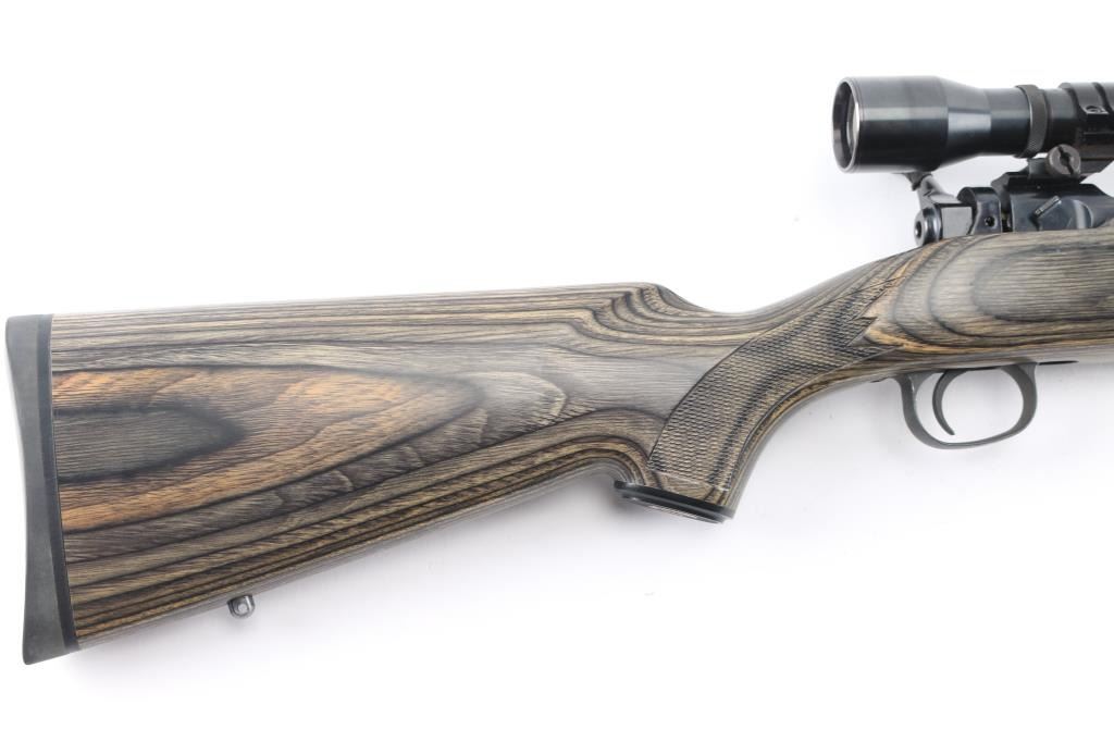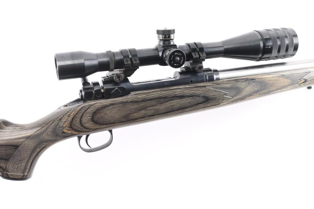 For left-handed shooters. Custom Savage model 10 that has been rebarreled in .223 Rem. Blued action, & bolt, 24 1/2" heavy chrome, tapered barrel, no provisions for sights, green laminated savage with "Indian Head" grip cap, rubber recoil pad, sling swivel studs, pressed checkered panels at wrist, & forearm. Mounted with a Weaver T-10 10X target scope, fine crosshairs, 1 1/4" MOA. Brown leather lens cover stamped "Rifle Ranch". Course tape on the bolt handle for better grip. Bore is excellent/bright, action is smooth, metal finish is very good, minor scratches, wood is very good.